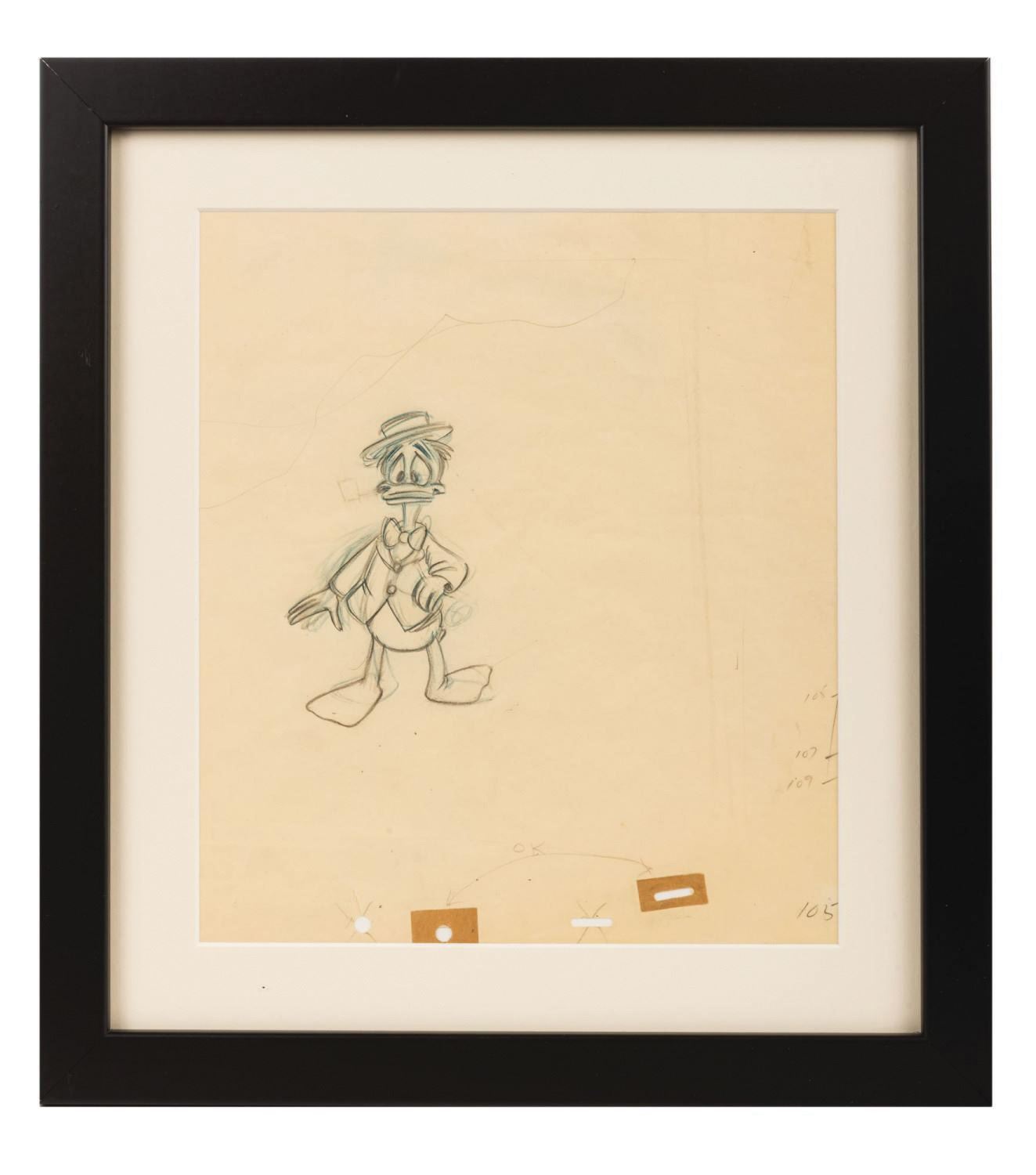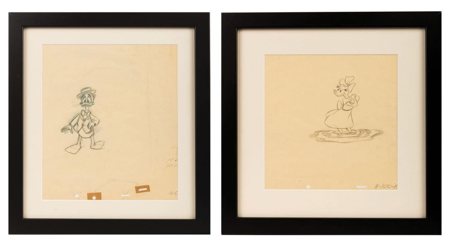 (Disney, 1954) A pair of production drawings of Donald and Daisy from the Walt Disney short film "Donald's Diary." In one of her final theatrical short performances, Daisy Duck, intent on catching a husband, becomes quite frustrated by the oblivious Donald Duck. The pieces have mat openings of 11"x9.75" within their 15.75"x14.5" frames. The character image sizes are 5"x3" and 4.5"x5". The drawings are in fine condition, with minor discoloration from age, and slight creases from original production usage.