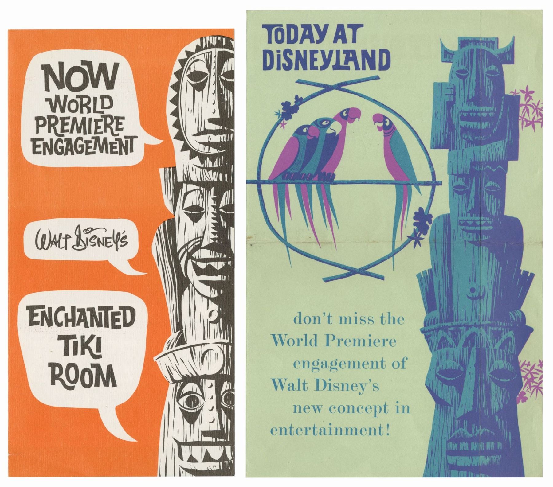 (Disneyland, 1963) A rare pair of flyers for the world premiere of the Enchanted Tiki Room attraction. In 1963, the concept of audio-animatronics was so new that Walt Disney and the Imagineering team felt the public would need materials to help wrap their minds around the show they were about to enjoy. These flyers are in good condition with a horizontal crease on the Today at Disneyland flyer, which measures 7.5"x4.75" while the orange flyer measures 7.25"x3.5".