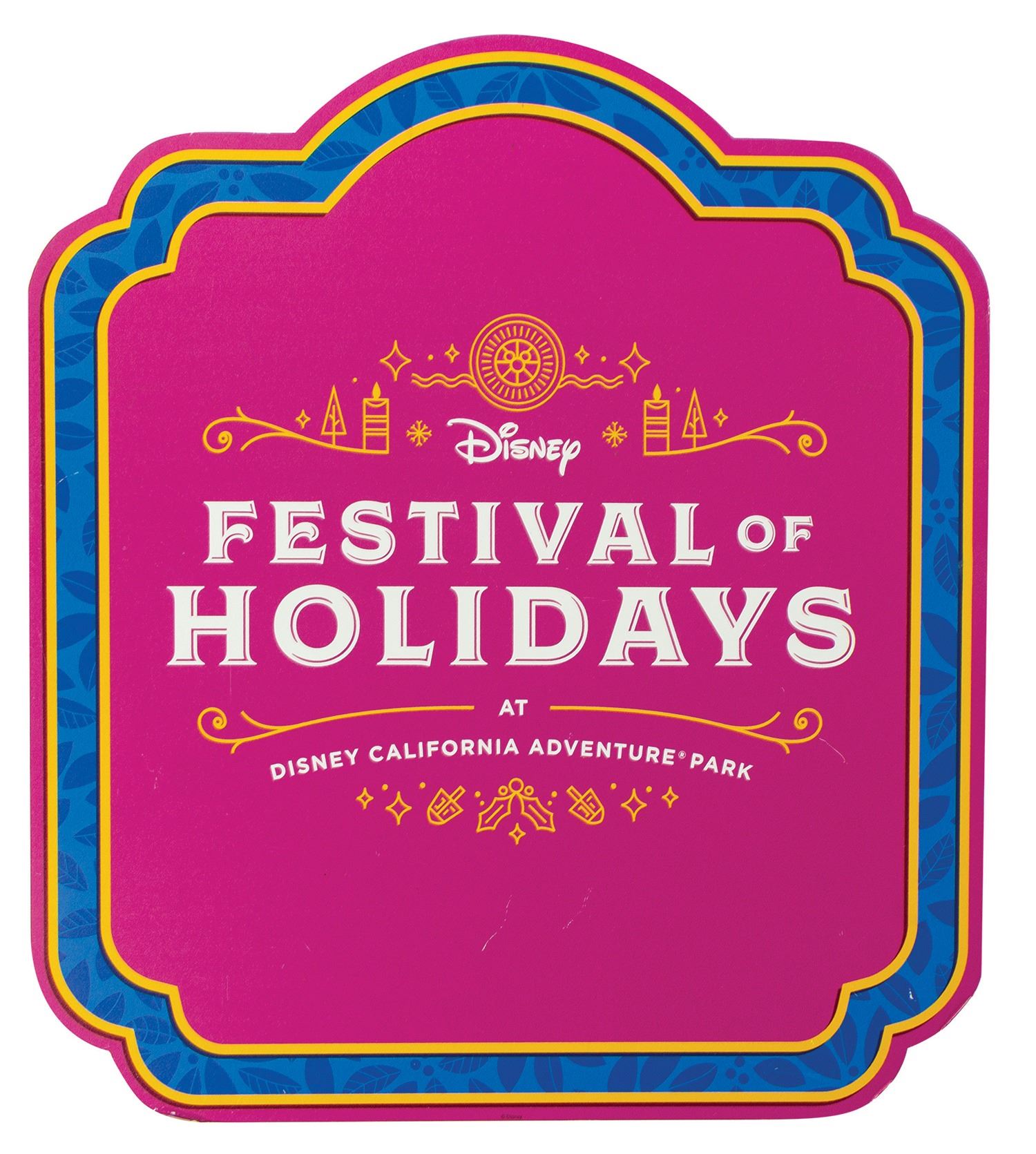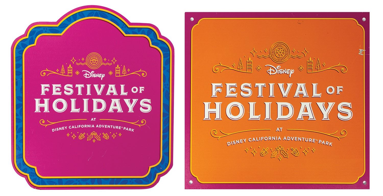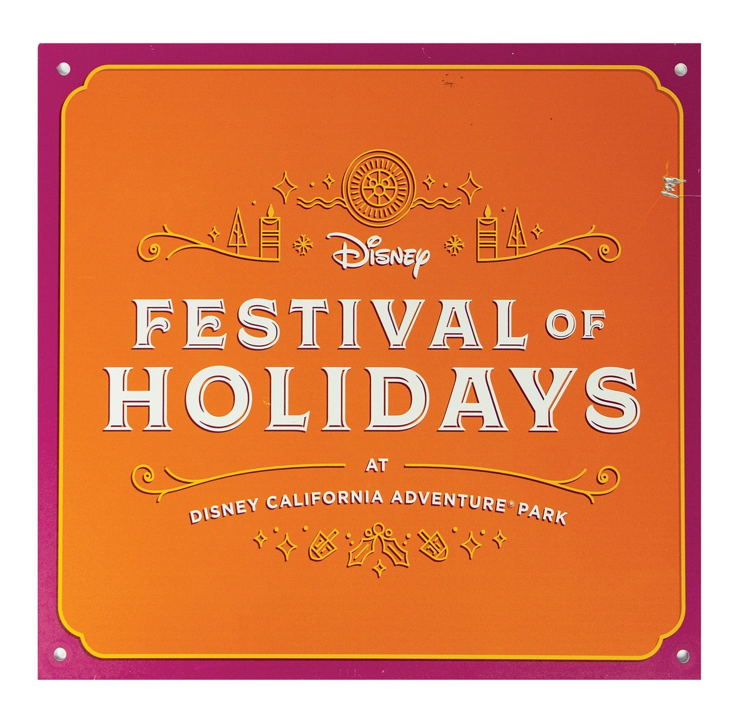 (California Adventure, c.2010s) A pair of park used signs from California Adventure's Festival of Holidays. This popular event celebrates holiday food from around the globe, with these signs measuring 20"x18" and 19.75"x21.75". The signs are printed on thin metal with a dense foam center, and the smaller of the two has Velcro on the reverse for hanging. Both are in fair condition with expected wear from park use, including some surface wear, dings along the edges, and a deep scratch on the right side of the larger sign.
