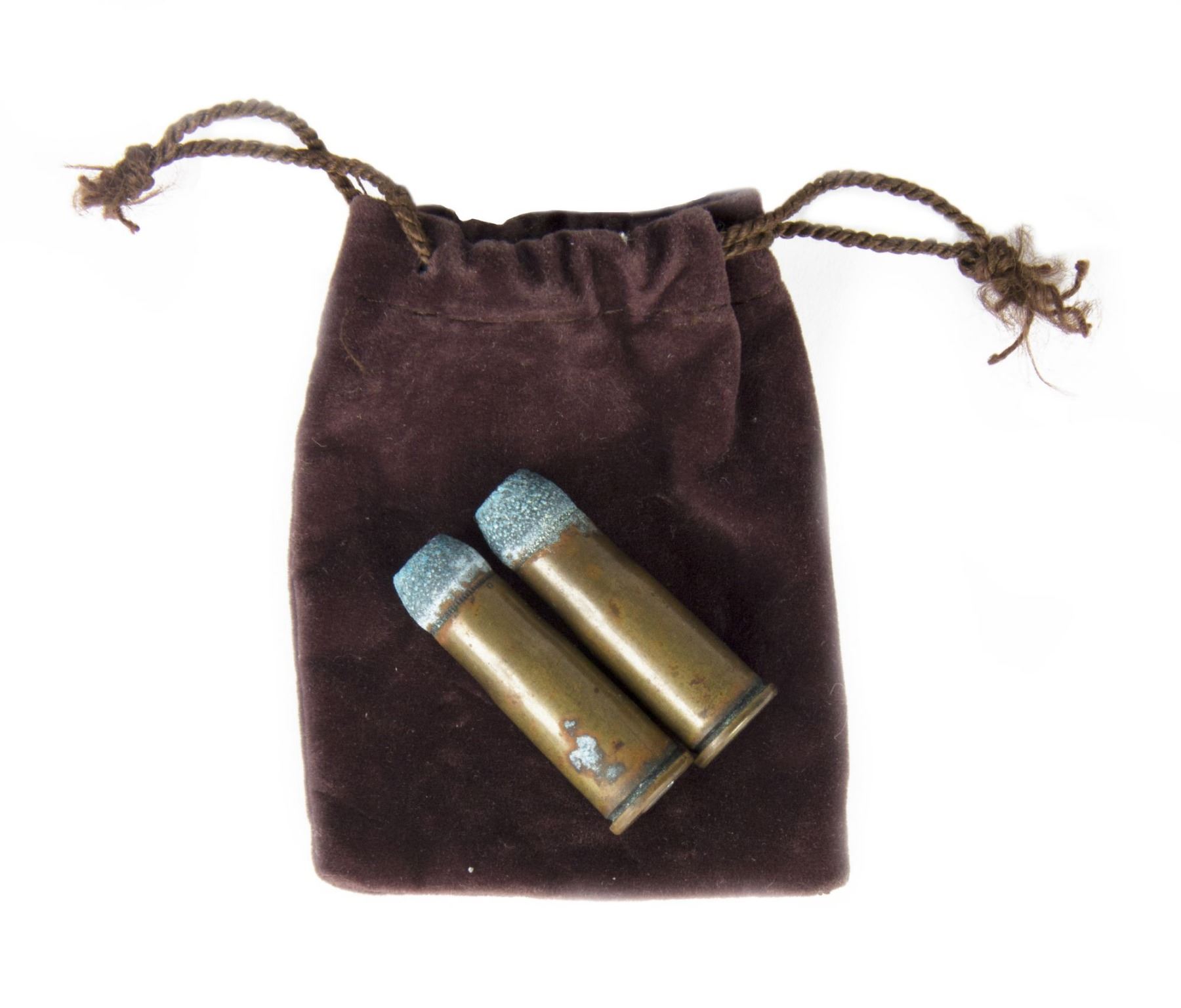 (Disneyland, c.1970s) A pair of Winchester 5-in-1 prop blanks used by Frontierland cast members at Disneyland. These types of blanks were commonly used in theater and film production, and were referred to as "5-in-1" blanks because when they were first introduced, they could be used in any of the five Winchester rifles and Colt revolvers commonly used in Hollywood Films. In Disneyland's Frontierland during the first few decades of the park, cast members used to have shoot-outs and stunt shows, and these two blanks were once carried by a Frontierland cast member. The blanks measure 1.5" long and are in good condition with some wear from age. The blanks come with a small carrying pouch.