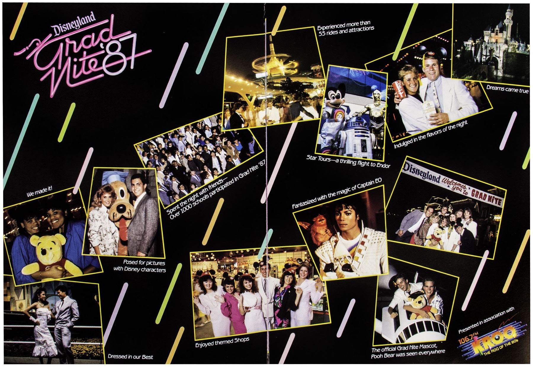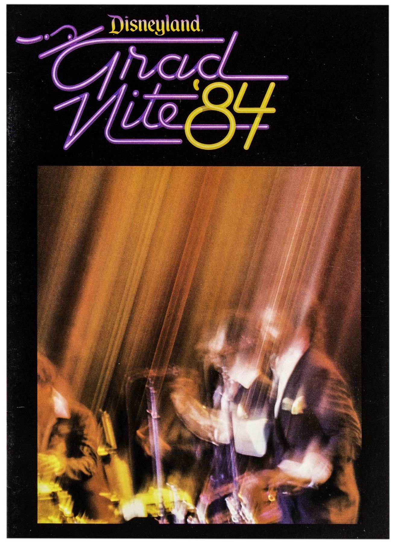 (Disneyland, 1984/87) A pair of souvenir programs from Disneyland's Grad Nite events in 1984 and 1987. The programs feature great 80's themed Disneyland imagery and list the entertainers and special events during the Grad Nite celebrations. Each program measures 9"x6.5" and are in very good condition with light wear from use.
