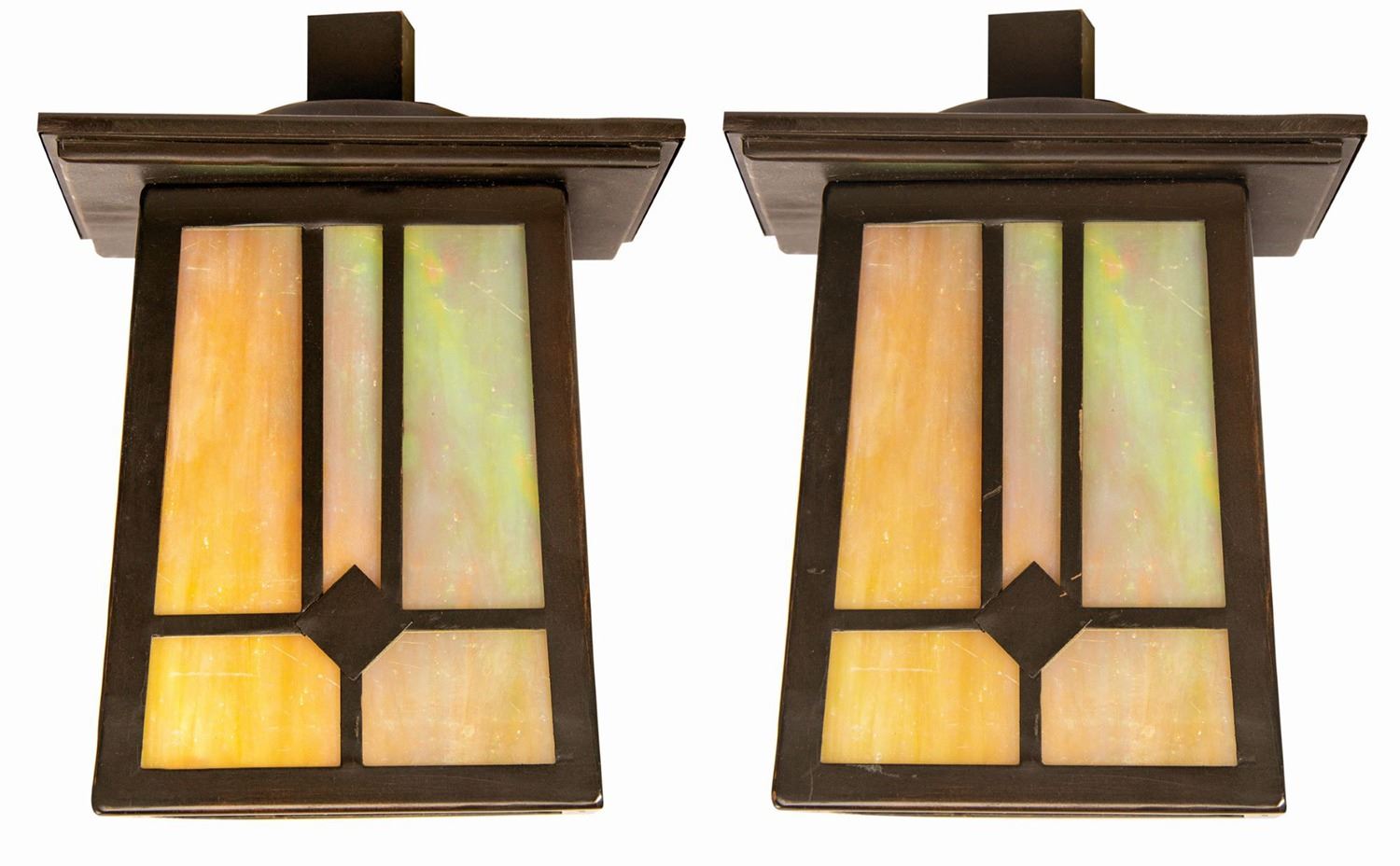 (Grand Californian, 2001) A pair of vanity lights from Disney's Grand Californian Hotel & Spa. These lamps were removed during a recent refurbishment to the hotel and feature the American Craftsman style that has been the signature of the hotel since it first opened in 2001. These impressive lamps offer a rare opportunity to furnish your home with the same quality, style, and care that Disney has used in one of their most popular hotels over the last 16 years. Both lamps measure 8"x6" and 7.75" deep. The pair are in very good condition with some expected moderate wear from use. Both lights are functional.