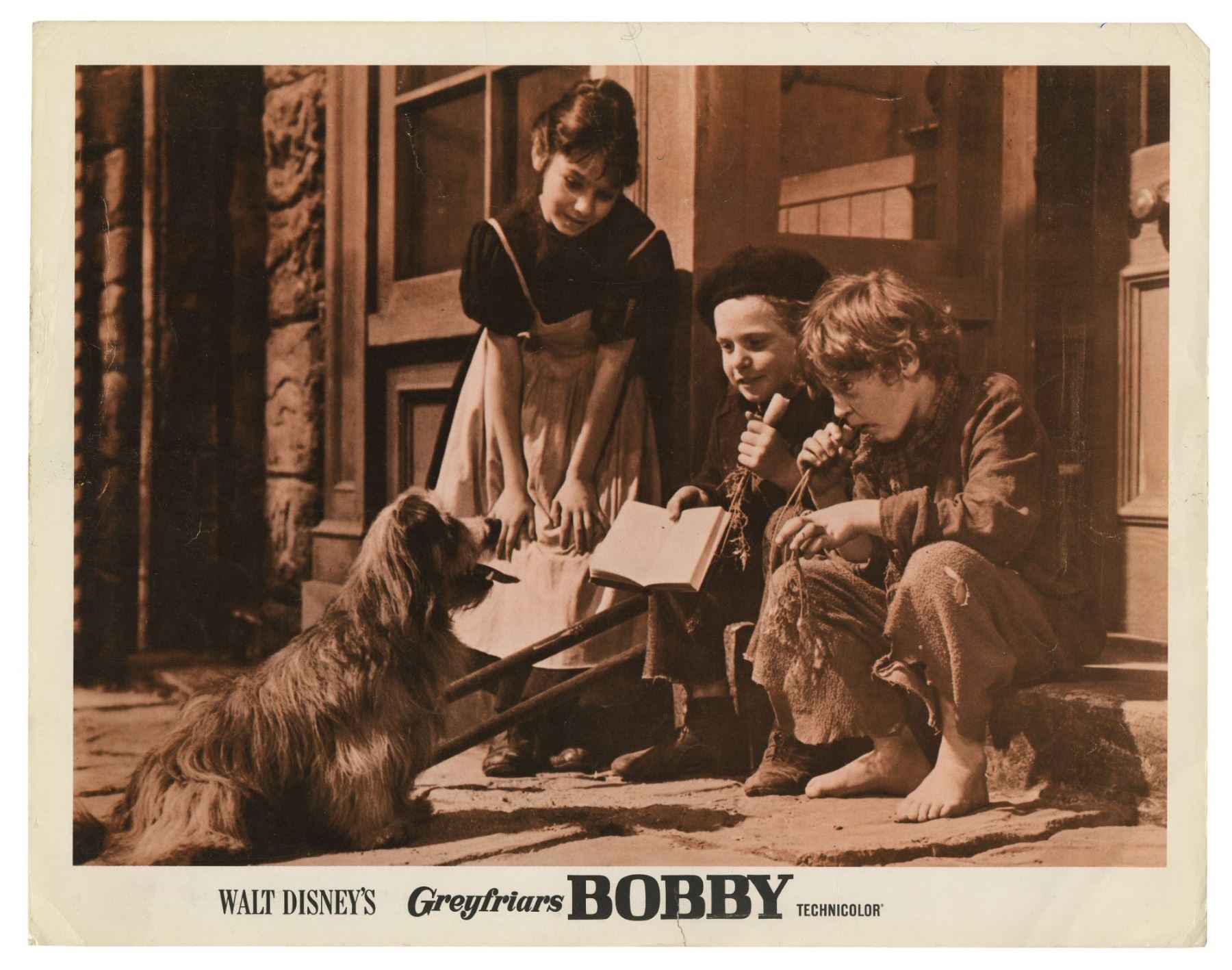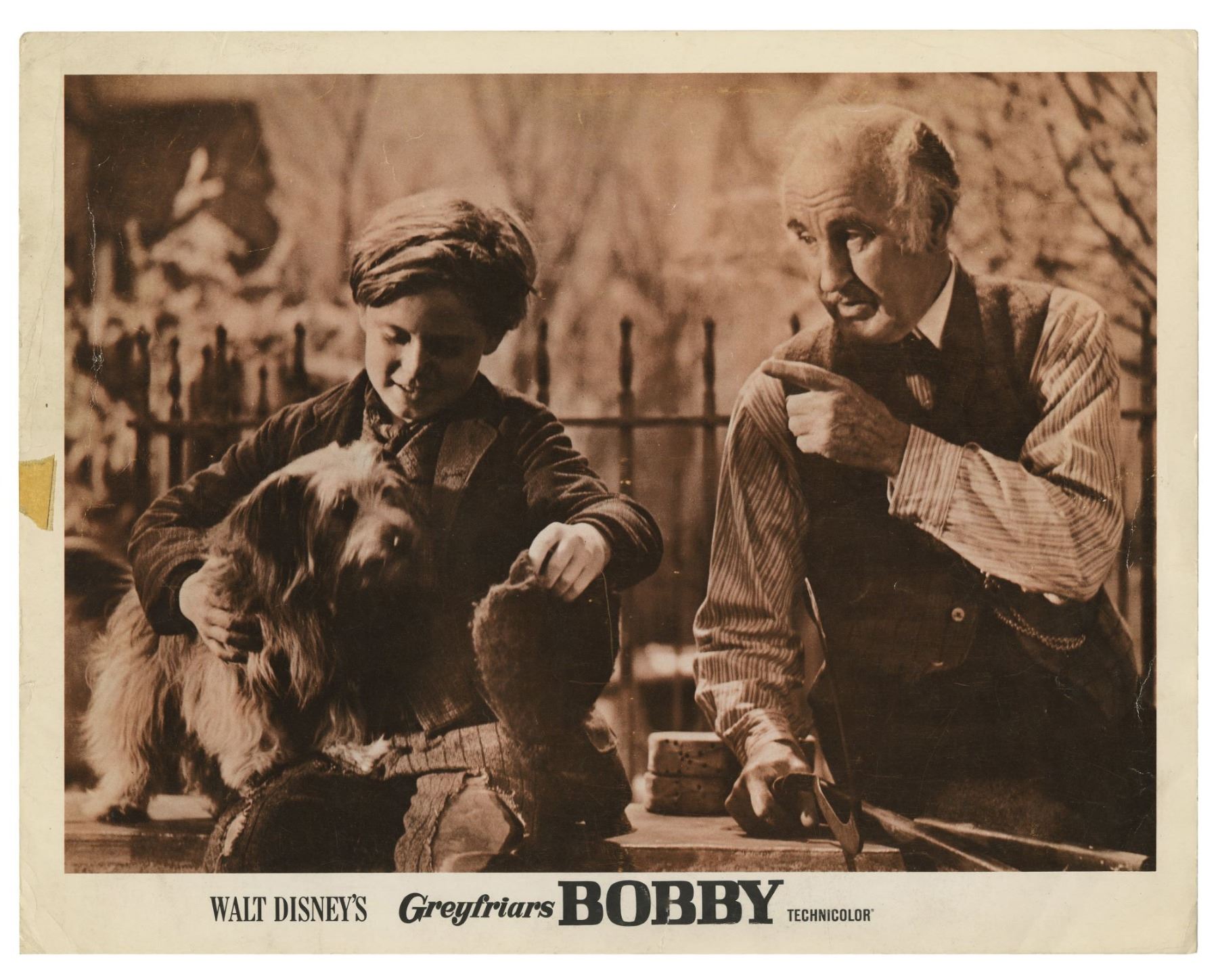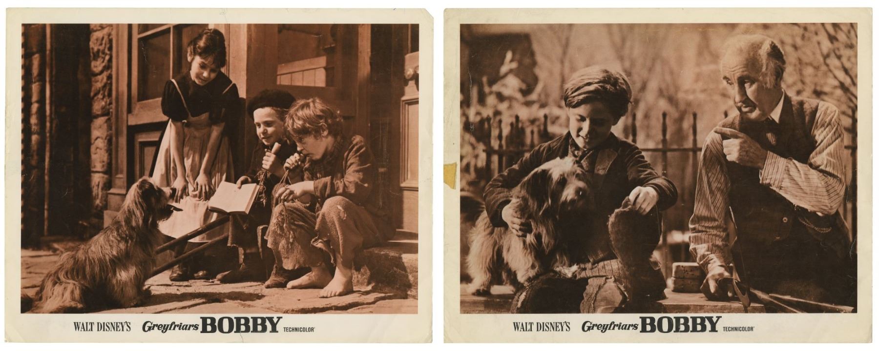 (Walt Disney Studios, 1961) A pair of original lobby cards from the feature film Greyfriars Bobby. The lobby cards depict the principal cast of the film in wonderful sepia-toned photos. Measuring 11"x14", the lobby cards are in fair condition some creasing throughout and a few thin tears around the edges. Each lobby card has a small piece of masking tape at the left edge.