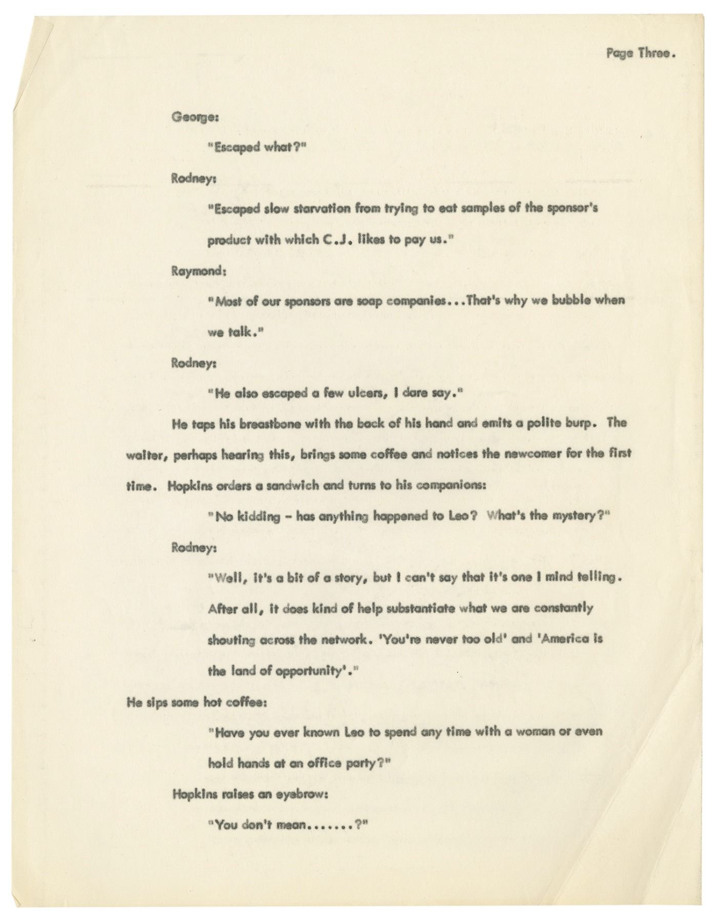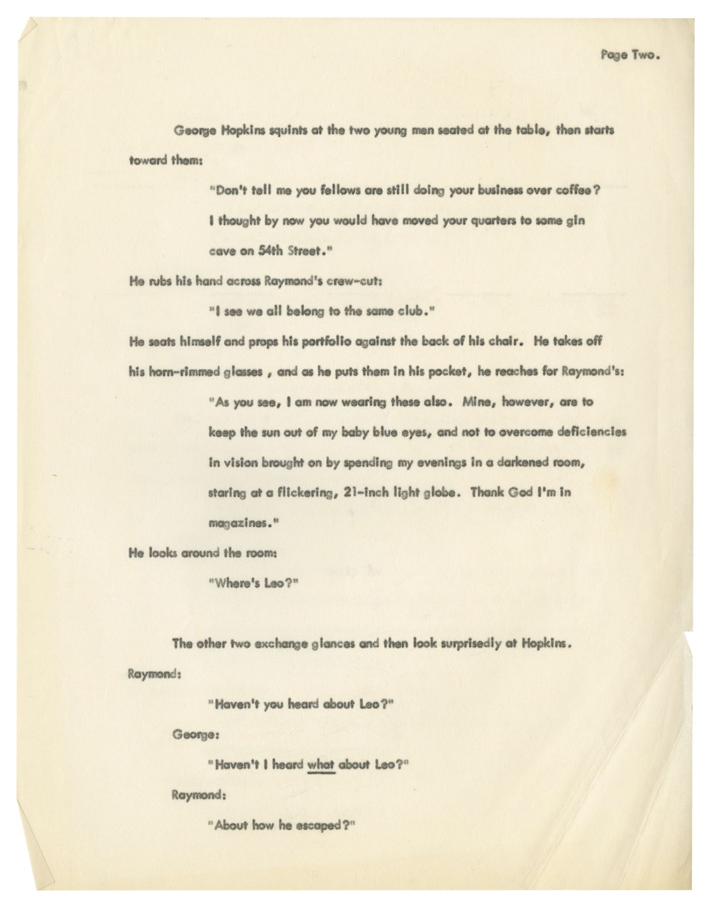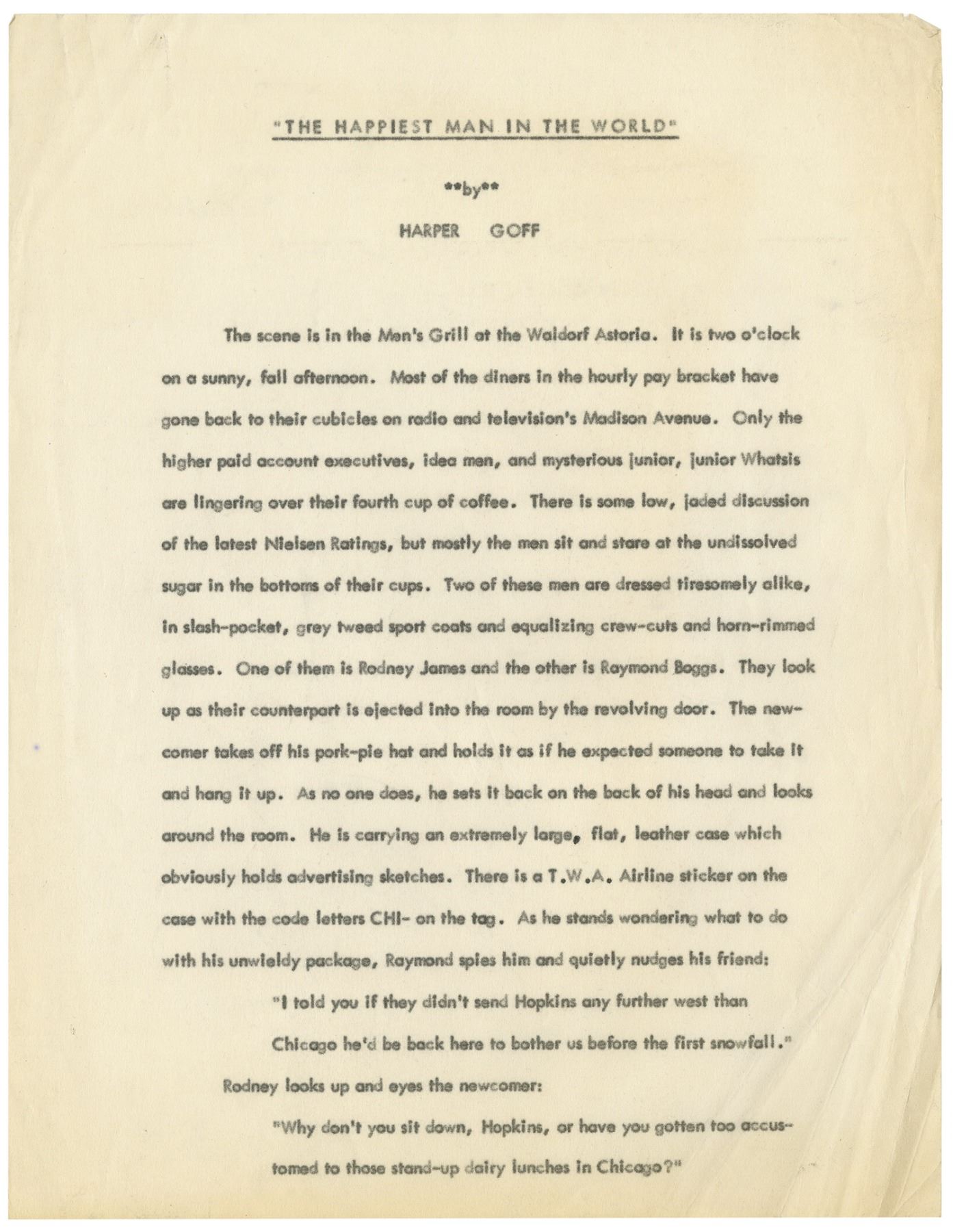 (Goff, c.1950s) A pair of original documents from the collection of Harper Goff. The first is a partial screenplay for what appears to be a short film titled "The Happiest Man Alive" and the other is a partial short story titled "Shortcut." The screenplay is 17 pages long while the story is 5 pages and includes a pair of duplicate sheets. Measuring 11"x8.5", the typewritten pages are in good condition with some edge-wear and some creasing to the pages.