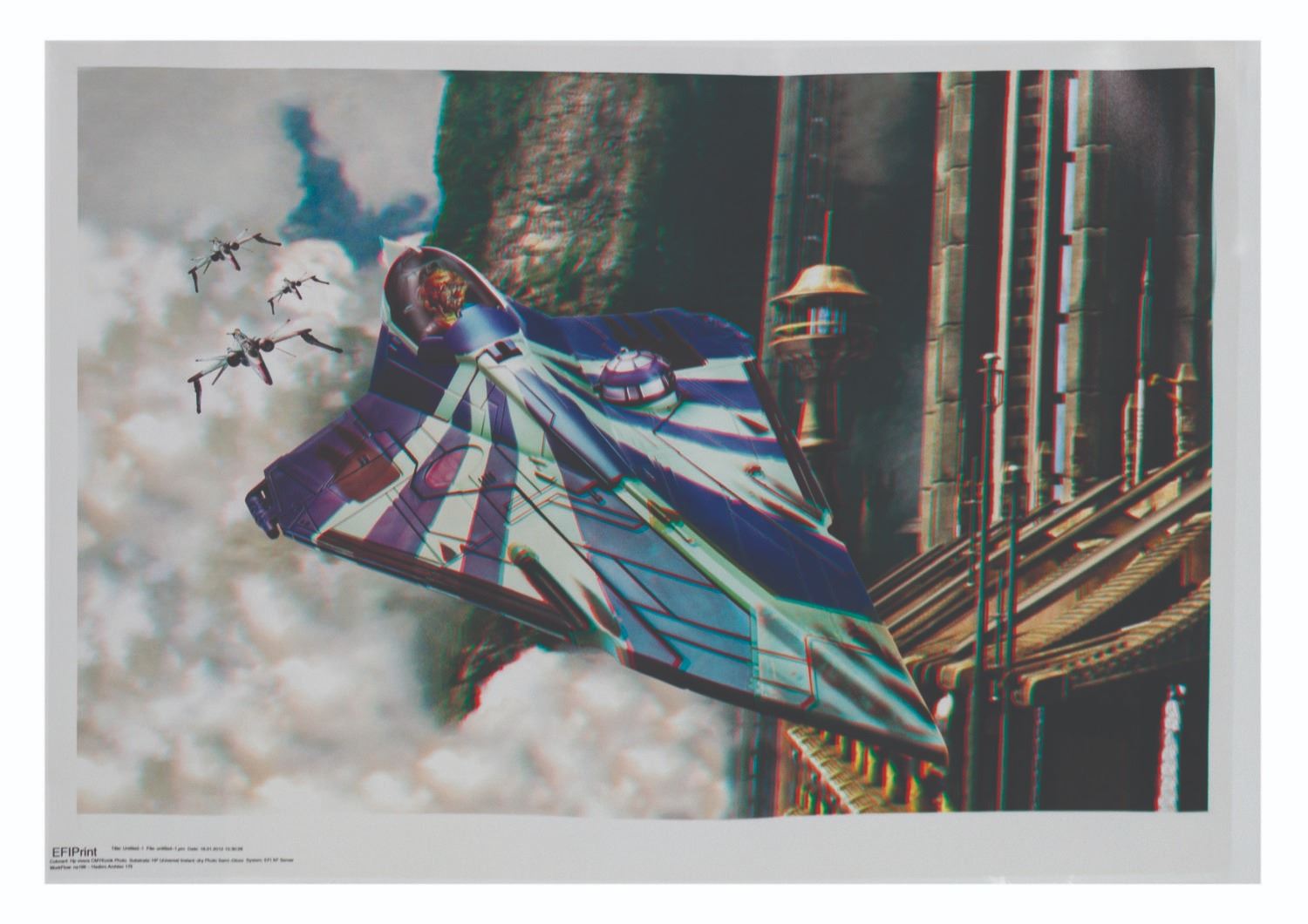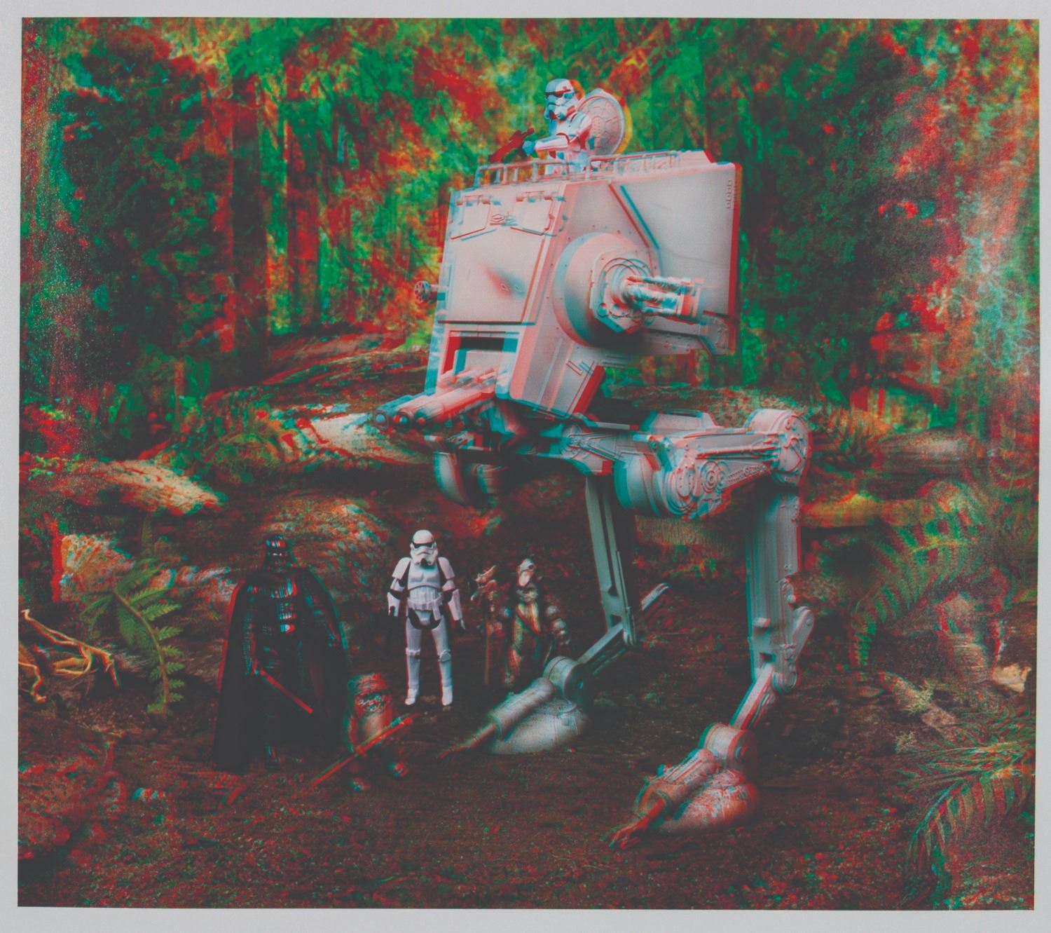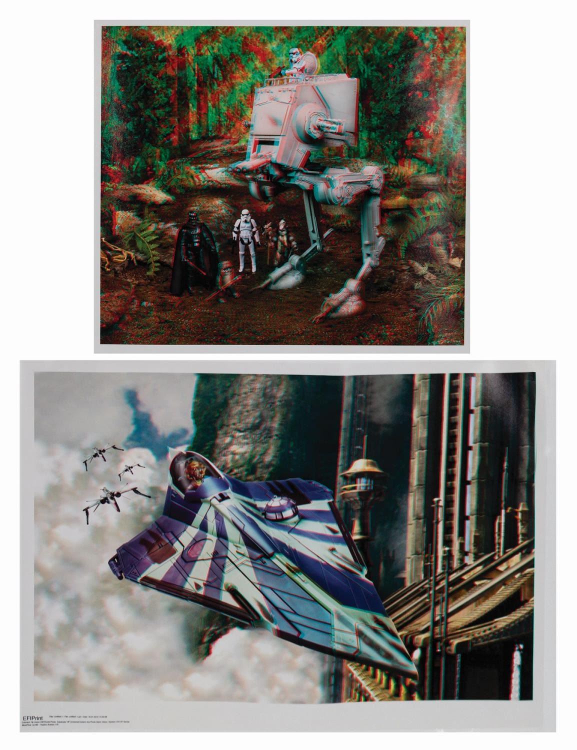 (Hasbro, 2012) A pair of digital 3-D test prints created during the development of the Walmart exclusive "Discover the Force in 3-D" toy line, from the collection of a former Hasbro employee. Viewable in 3-D with standard red-blue anaglyph glasses (not present), the prints include an AT-ST vehicle with Darth Vader, Storm Trooper, and Ewok 3.75" Star Wars action figures as well as a Plo Koon's Jedi Starfighter. Each is printed on a large untrimmed sheet of paper, the unused area of which has been folded back, so that the photo prints effectively measure 11"x21" with an image size of 9.25"x10.5" (AT-ST) and 16"x22.5" with a 14"x20" image (Starfighter). Both are in very good condition with minimal edge wear.