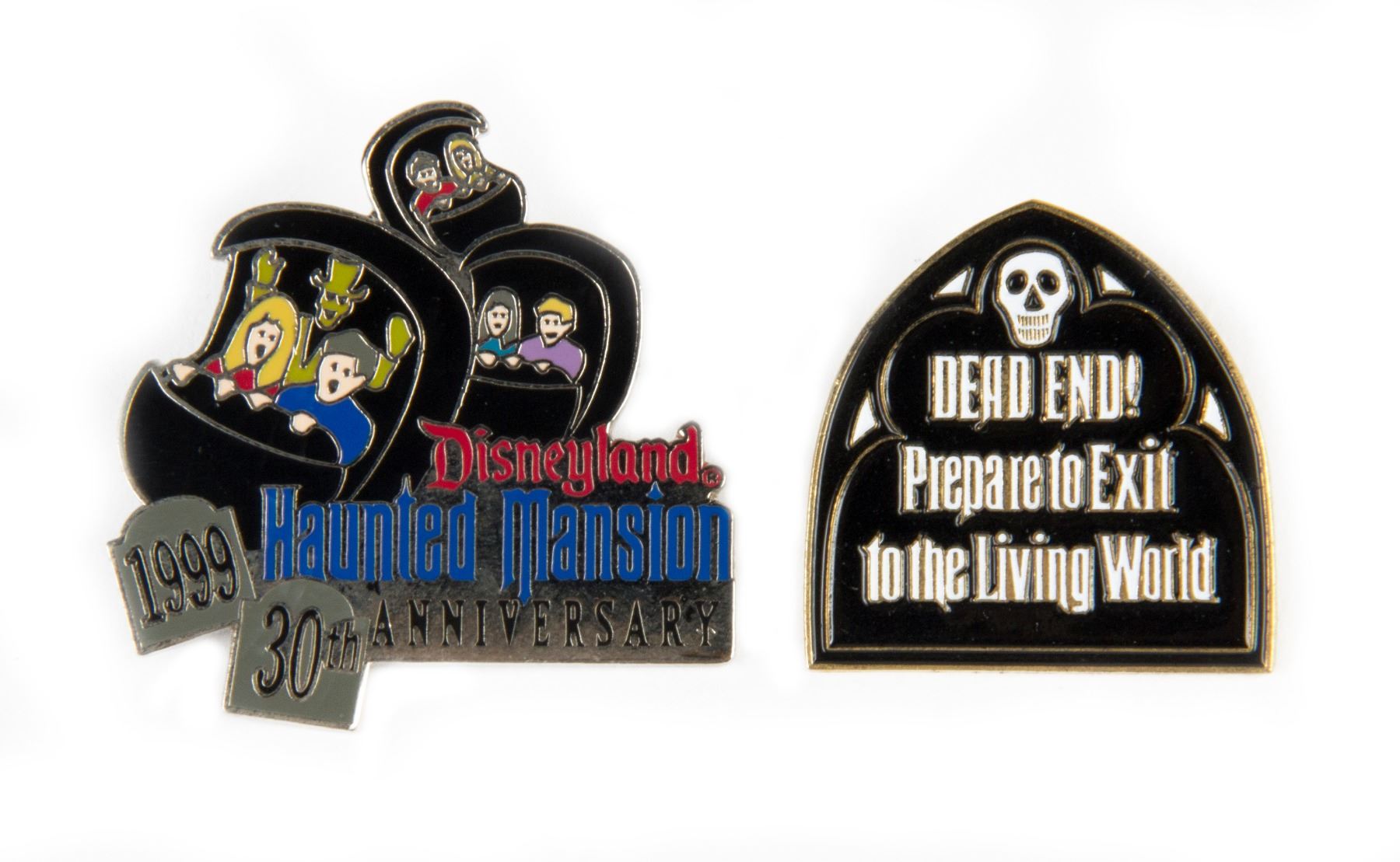 (Disneyland, 1999) A pair of enamel pins created for the 30th Anniversary of Disneyland's "Haunted Mansion" in 1999. One pin depicts the "Doom Buggy" ride vehicles and notes the anniversary, and the other pin replicates the exit sign seen at the end of the attraction. The pins measure 1.5"x1.5" and 1.25"x1.25" respectively. The condition is very good with little wear.