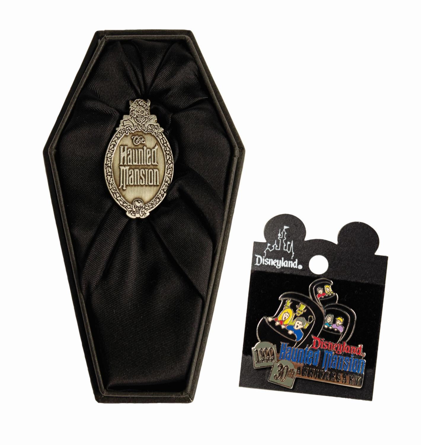 (Disneyland, 1999) A pair of limited edition pins commemorating the 30th anniversary of Disneyland's Haunted Mansion. The set includes an enamel pin depicting the Hitchhiking Ghosts portion of the ride on its original backing, and a brushed metal pin of the attraction sign in a coffin-shaped box. The latter was released in an edition of 1969, in honor of the attraction's opening year. Ranging in size from 1.5"x0.75" to 1"x1.5", the pins are in very good condition. The enamel pin exhibits some bending to the straight pin backing and the brushed metal pin has minor oxidation to the straight pin. The coffin measures 5"x2.75" and 1.75" deep with a few faint surface impressions to the lid.