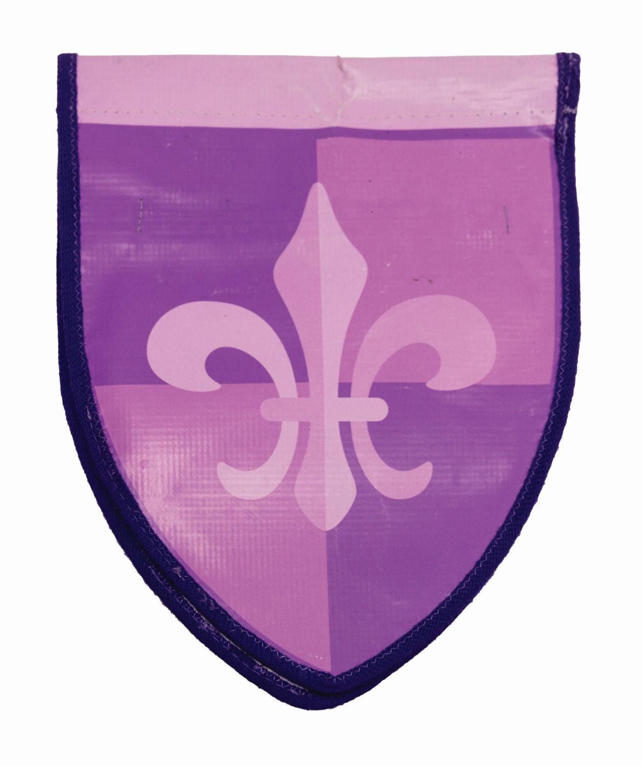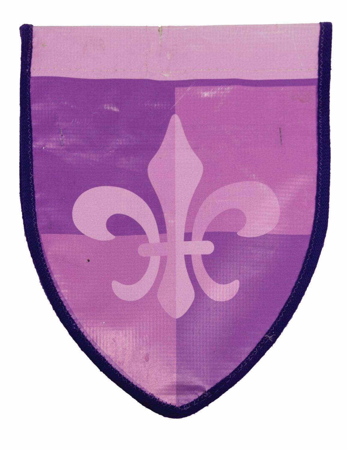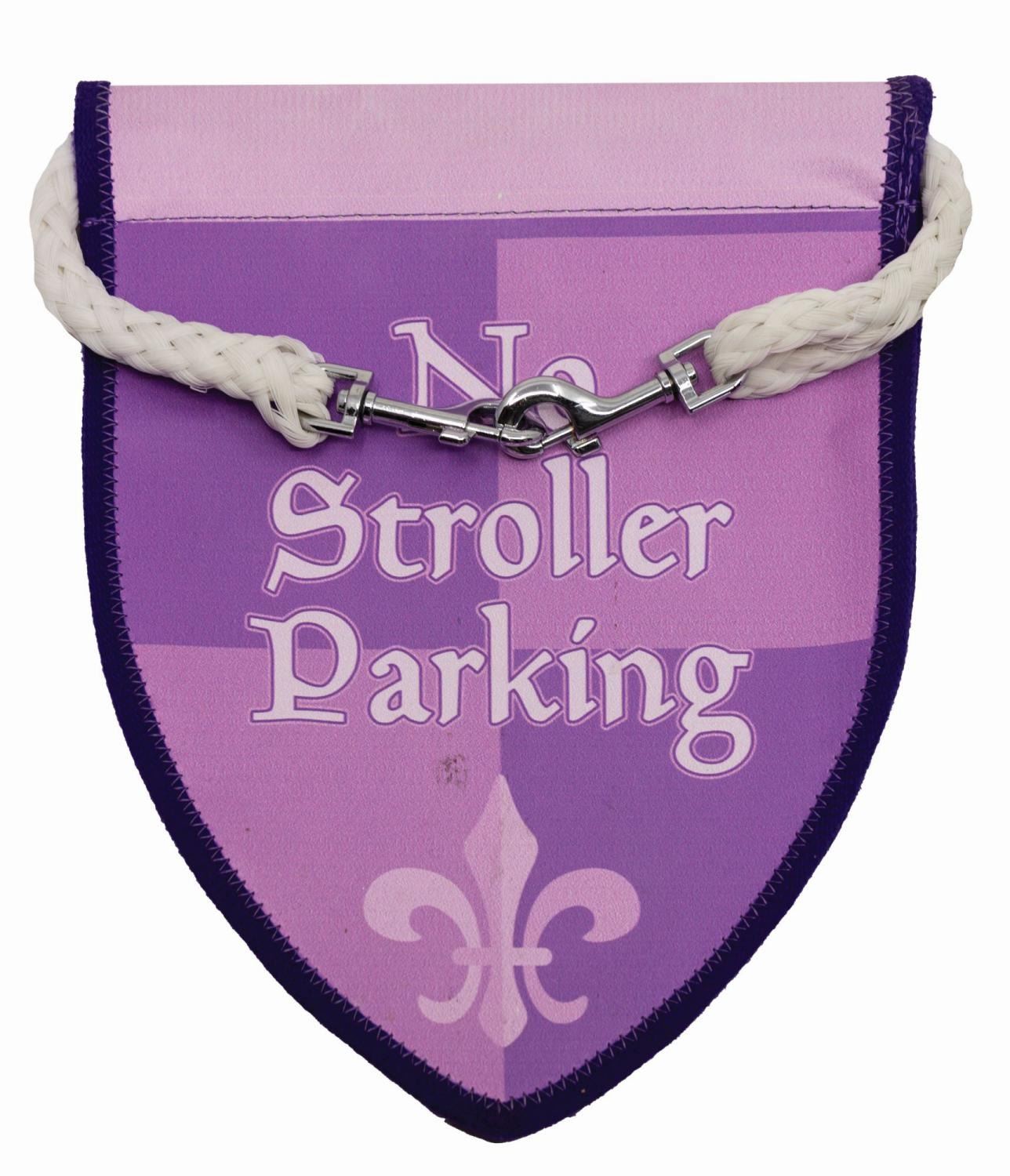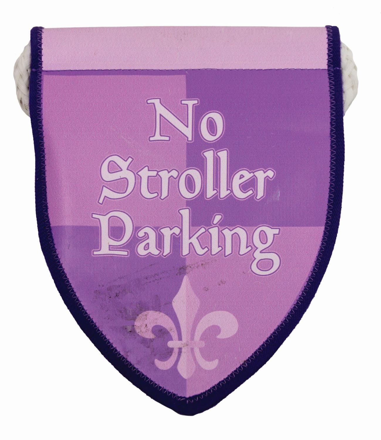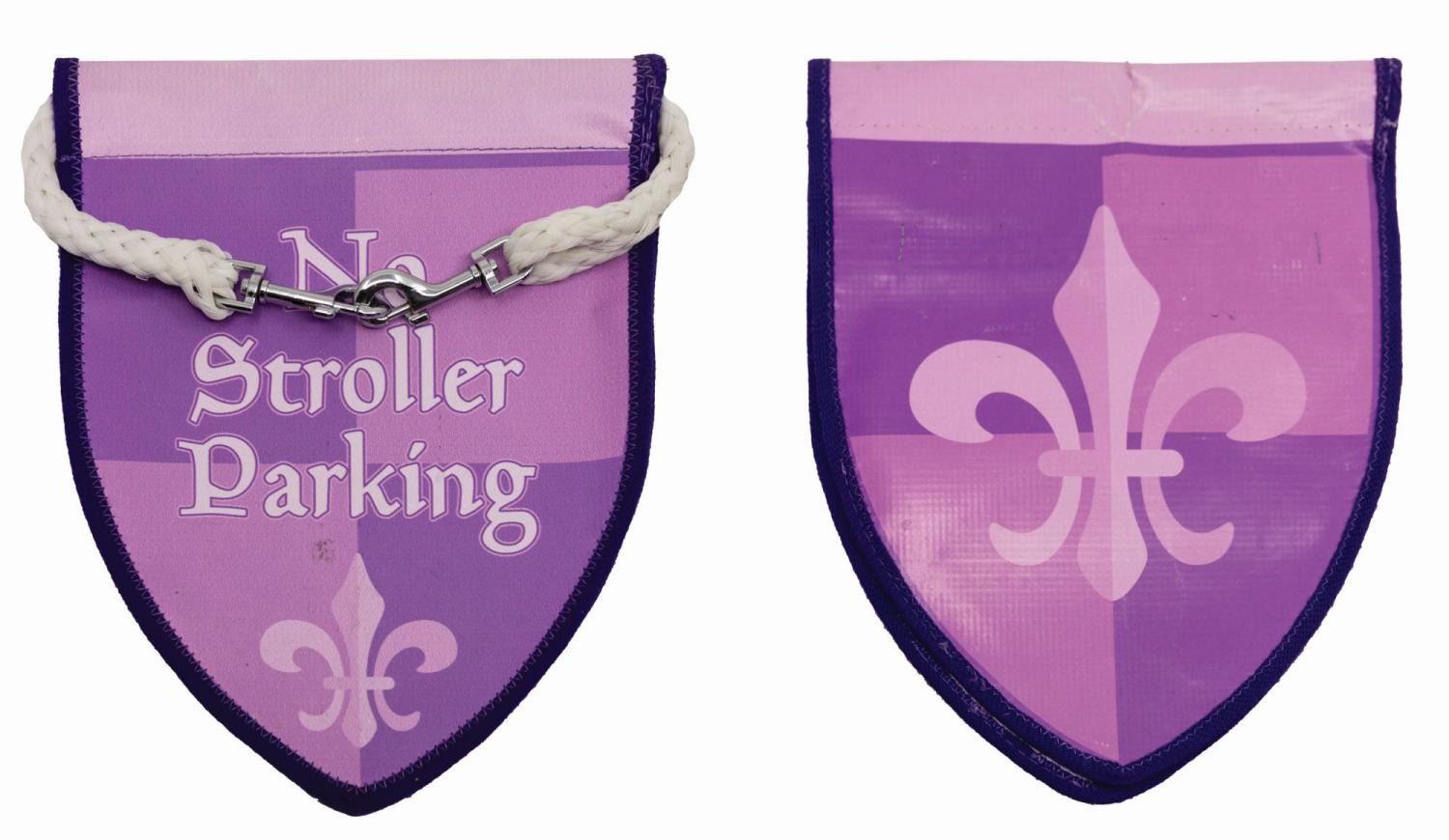 (Disneyland, c.2010s) A pair of crowd control flags from the It's a Small World Attraction in Disneyland's Fantasyland. Constructed of cloth and vinyl, both flags feature a purple and lavendar checkerboard pattern with a heraldic fleur-de-lis graphic. One flag reads "No Stroller Parking" and is equipped with braided plastic ropes emanating from either side of the top, terminating in metal clips. The other flag self-fastens with velcro and is intended to demarcate the attraction's queue. Both measure 13"x10" and are in very good condition with some slits to the vinyl, rubbing, scratches, and spot surface loss.