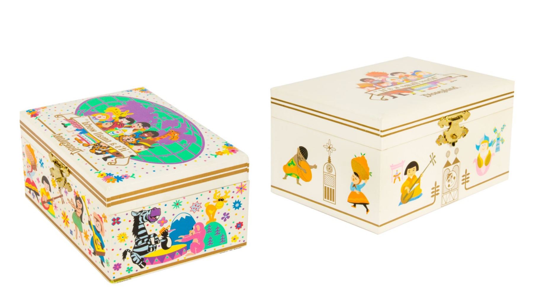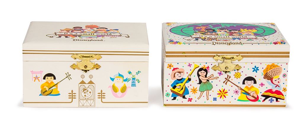(Disneyland, c.1960s-70s) A pair of music boxes based on the "It's a Small World" attraction at Disneyland. The boxes feature imagery of the children seen within the attraction, and play the well-known theme. The boxes measure approximately 4.25"x6" and 3.25" tall, and the pair is in very good functioning condition with some minor wear from use.