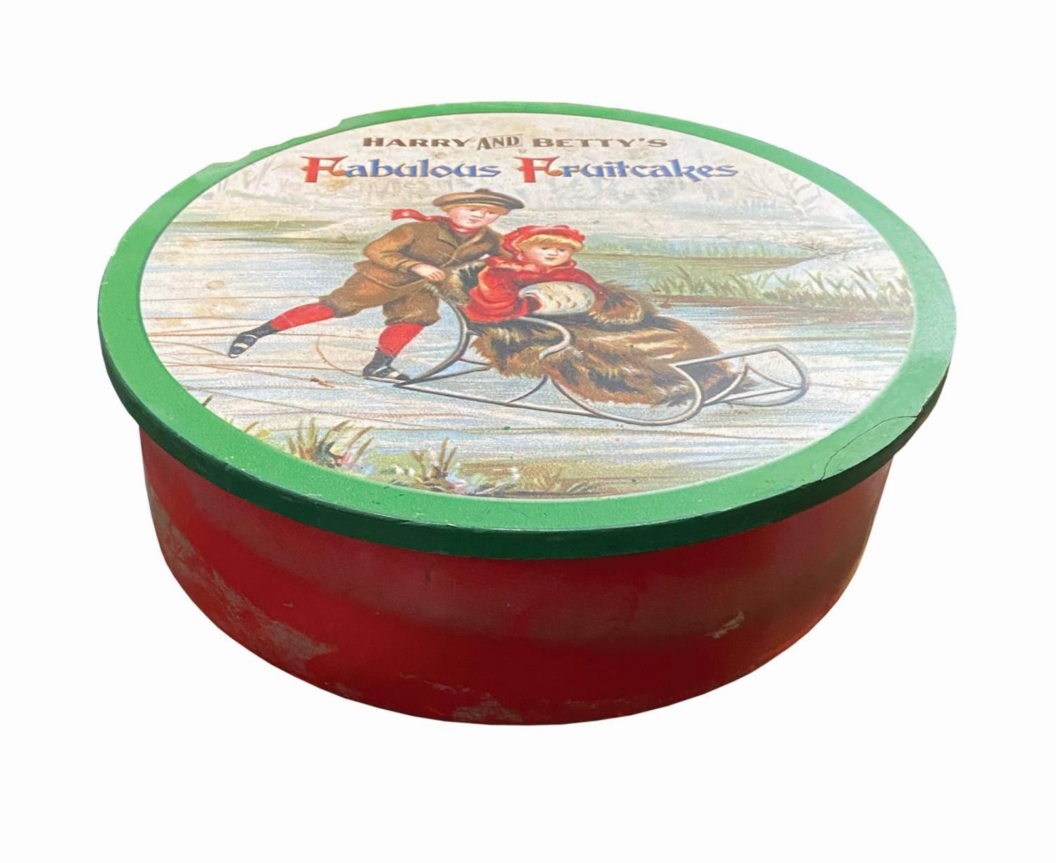(Disneyland, 2013-17) A pair of park-used props from the "Jingle Cruise," the yuletide seasonal re-theming of Disneyland's Jungle Cruise. The prop fruitcake is constructed of molded high density urethane expertly painted and finished to appear as the infamous festive dessert, and the tin is a metal base with a molded foam lid and foam interior. Both props features metal hoops embedded in the underside for securing in place. Measuring 13.75" in diameter and 15" in diameter respectively, the props are in good condition, with minor paint loss to both. A section of the lid of the tin has chipped off, and there is a crack on the opposite edge.
