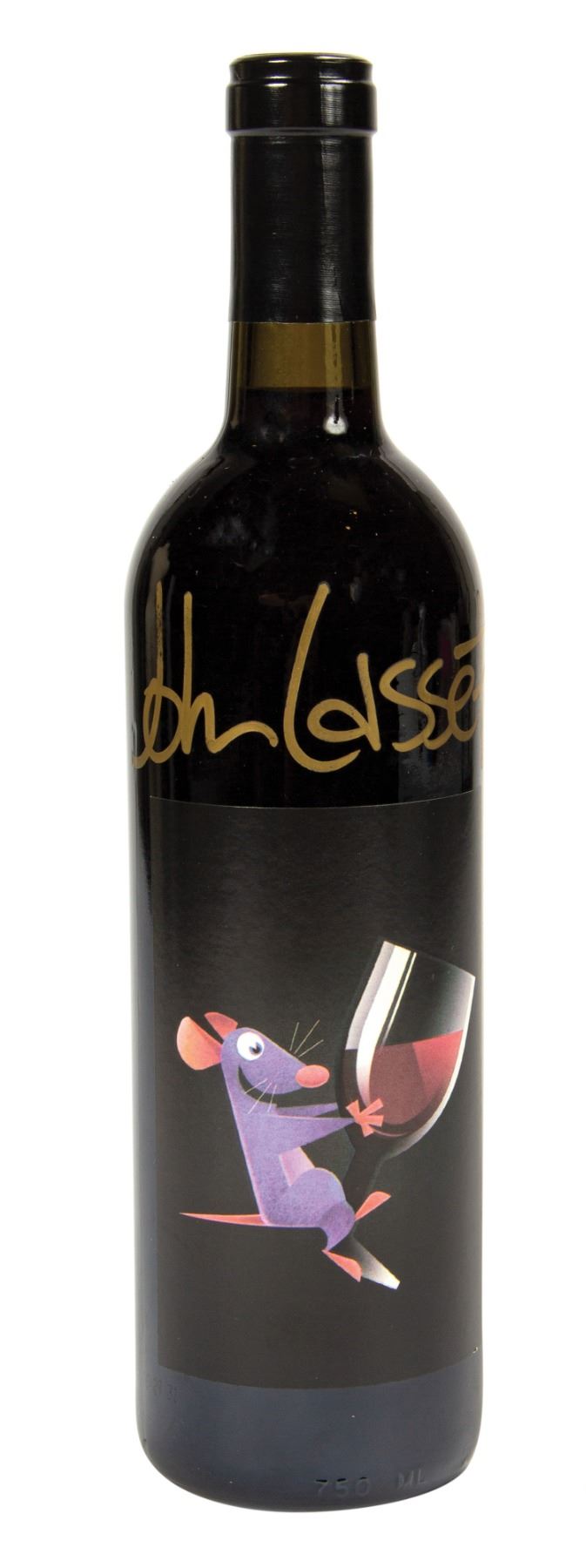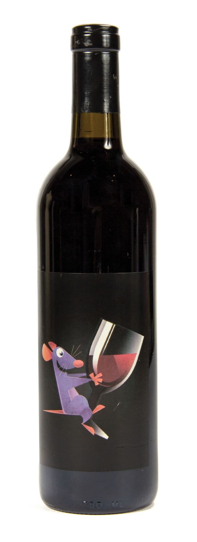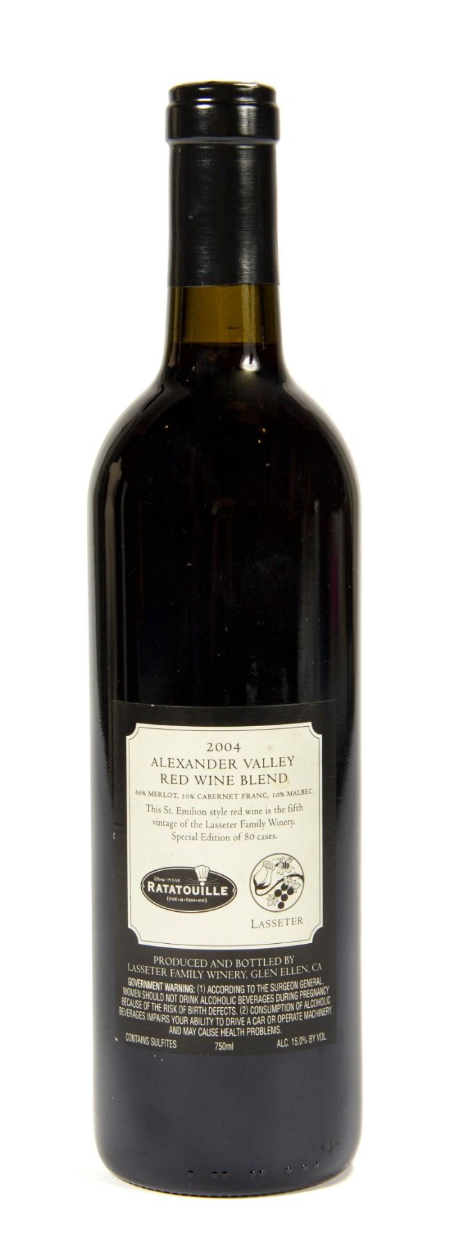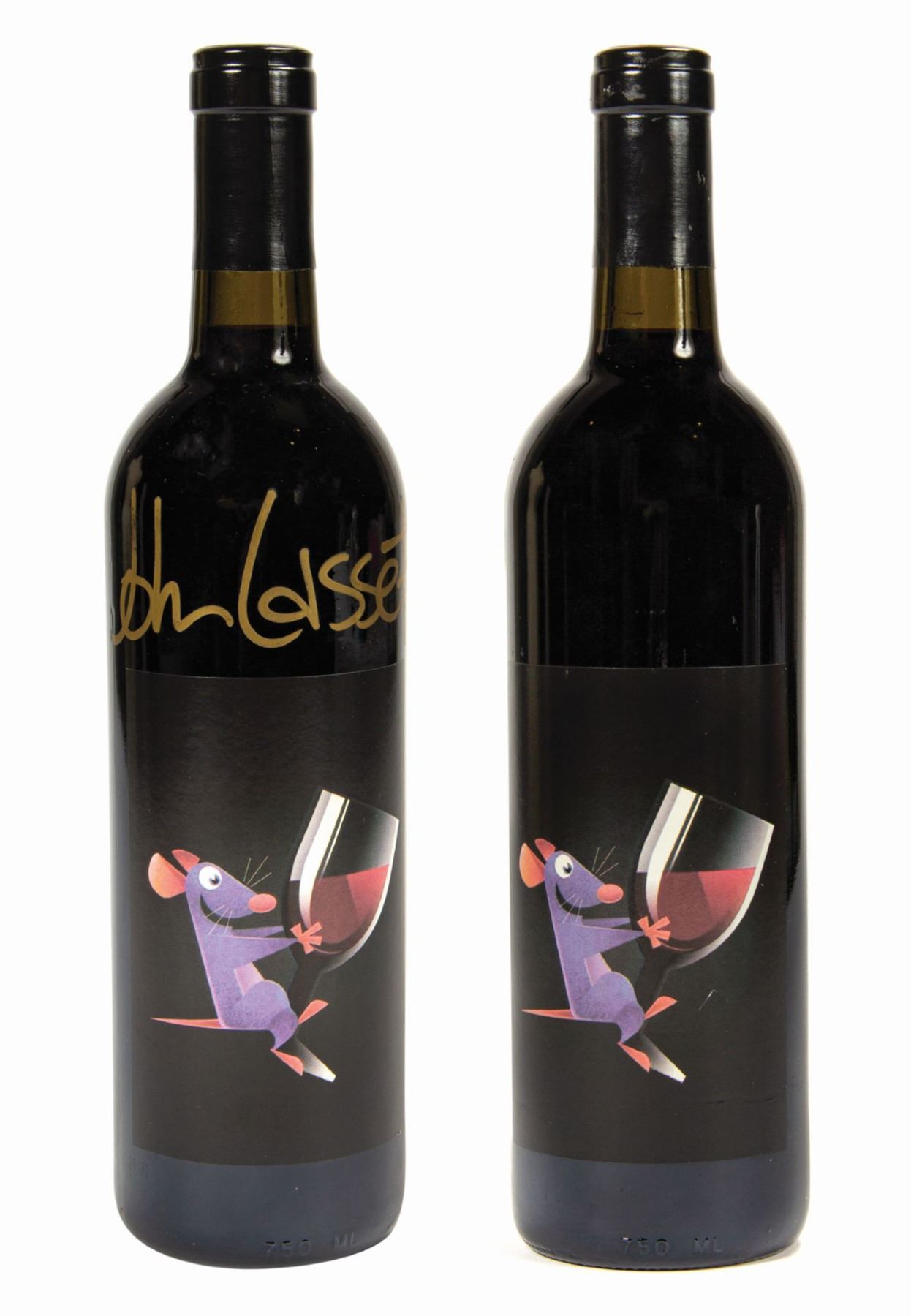 (Pixar, 2007) A pair of bottles of Lasseter Family Winery 2004 Alexander Valley Red Wine Blend with custom Ratatouille label art featuring Remy contemplating a glass of vino. One bottle has been signed above the front label in gold paint pen by Pixar chief John Lasseter, who gave bottles like this, the product of his personal winery, to the film’s cast and crew. The Red Blend is corked and sealed in a standard 750mL bottle measuring 12” tall and 3” in diameter. The bottles are in very fine condition with only minor shelf wear.