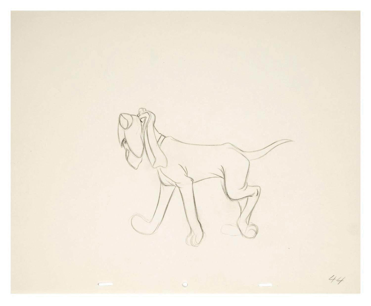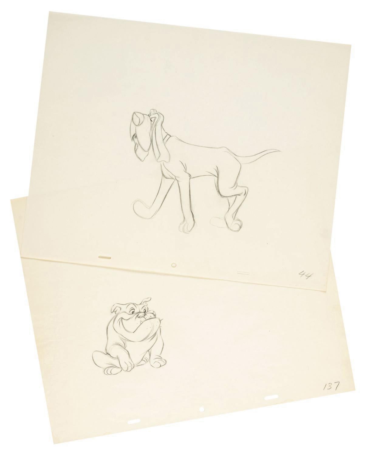 (Disney, 1955) A pair of production drawings of Bull and Trusty from the Walt Disney animated feature film Lady and the Tramp. The pieces have image sizes of 3.5"x3.75" and 6"x7.5" on their 12.5"x15.5" animation paper. Both items are in very fine condition with minimal edge wear.