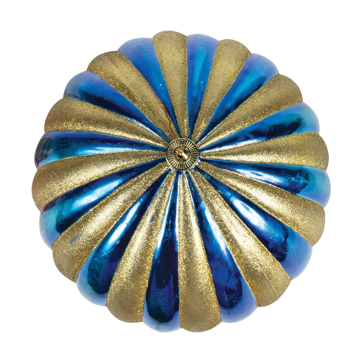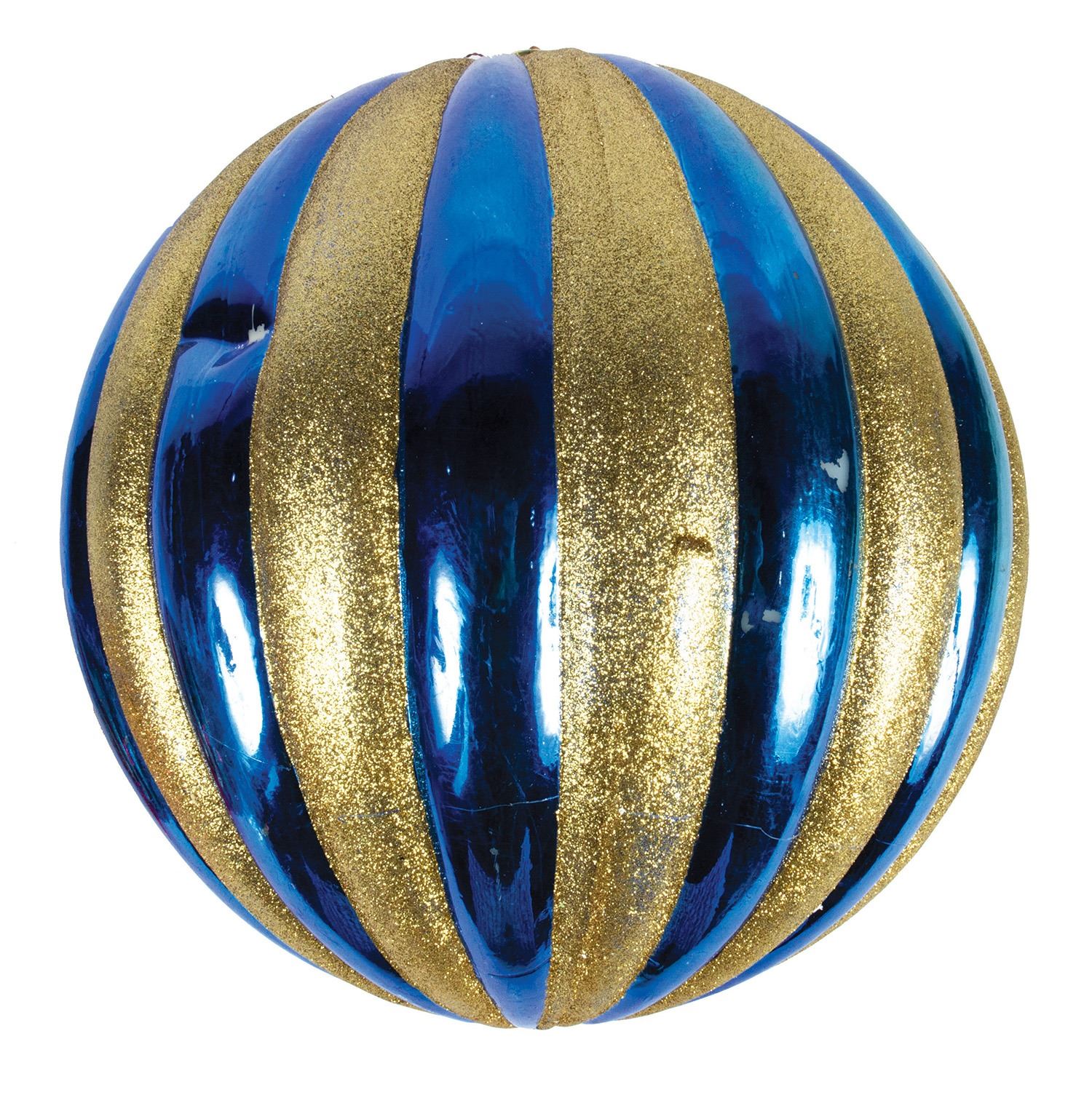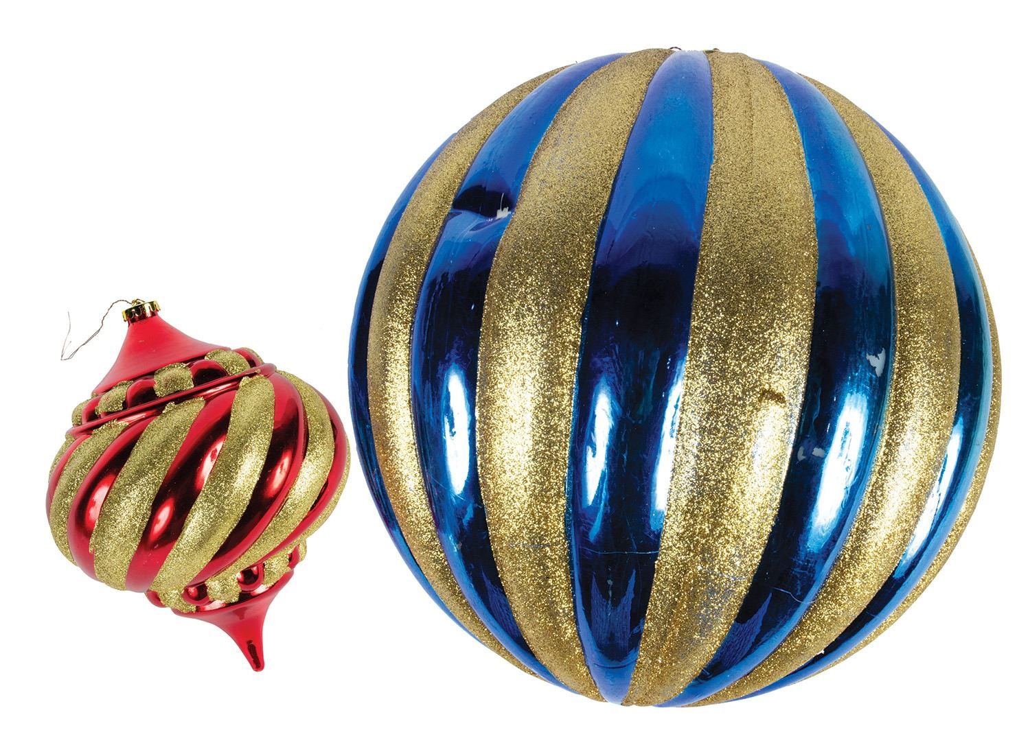 (Disneyland, c.2000s) A charming pair of large Christmas ornament props from the holiday celebrations at Disneyland. Created in a complementary glittering gold design, these ornaments measure approximately 8" and 12" in diameter. The condition is good, with some wear from use, including a few dings to the blue ornament.