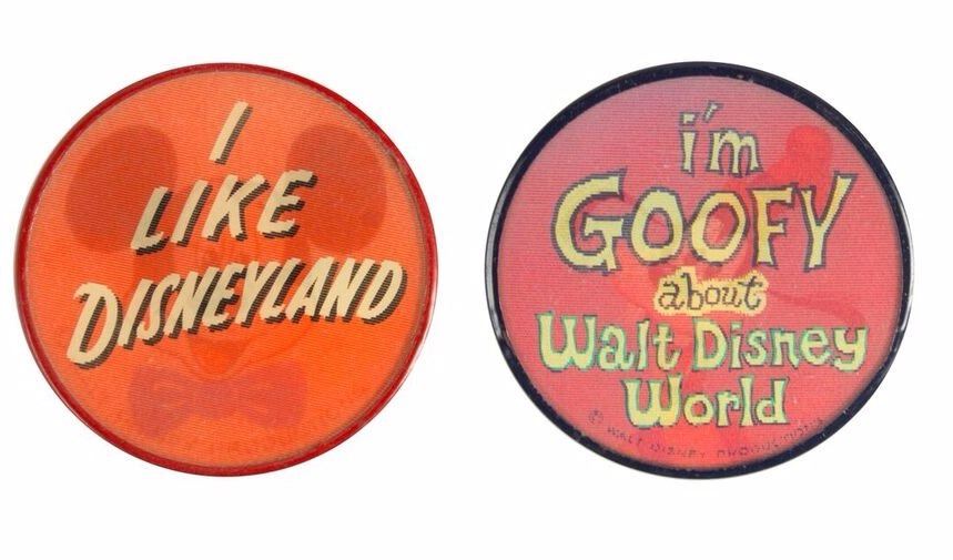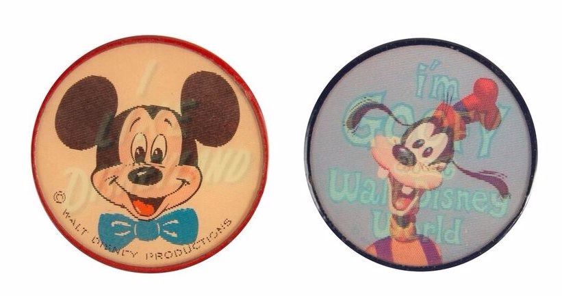 (Disneyland, 1955-70s) A wonderful pair of lenticular pins, called "Flickers", first sold at the Art Corner in Disneyland's Tomorrowland and then later at Walt Disney World. The buttons feature Mickey and Goofy on the front and reveal text when tilted. The Mickey pin reads "I like Disneyland" and the Goofy reads "I'm Goofy about Walt Disney World". Both buttons measure 2.5" in diameter and the pair is in very good condition.