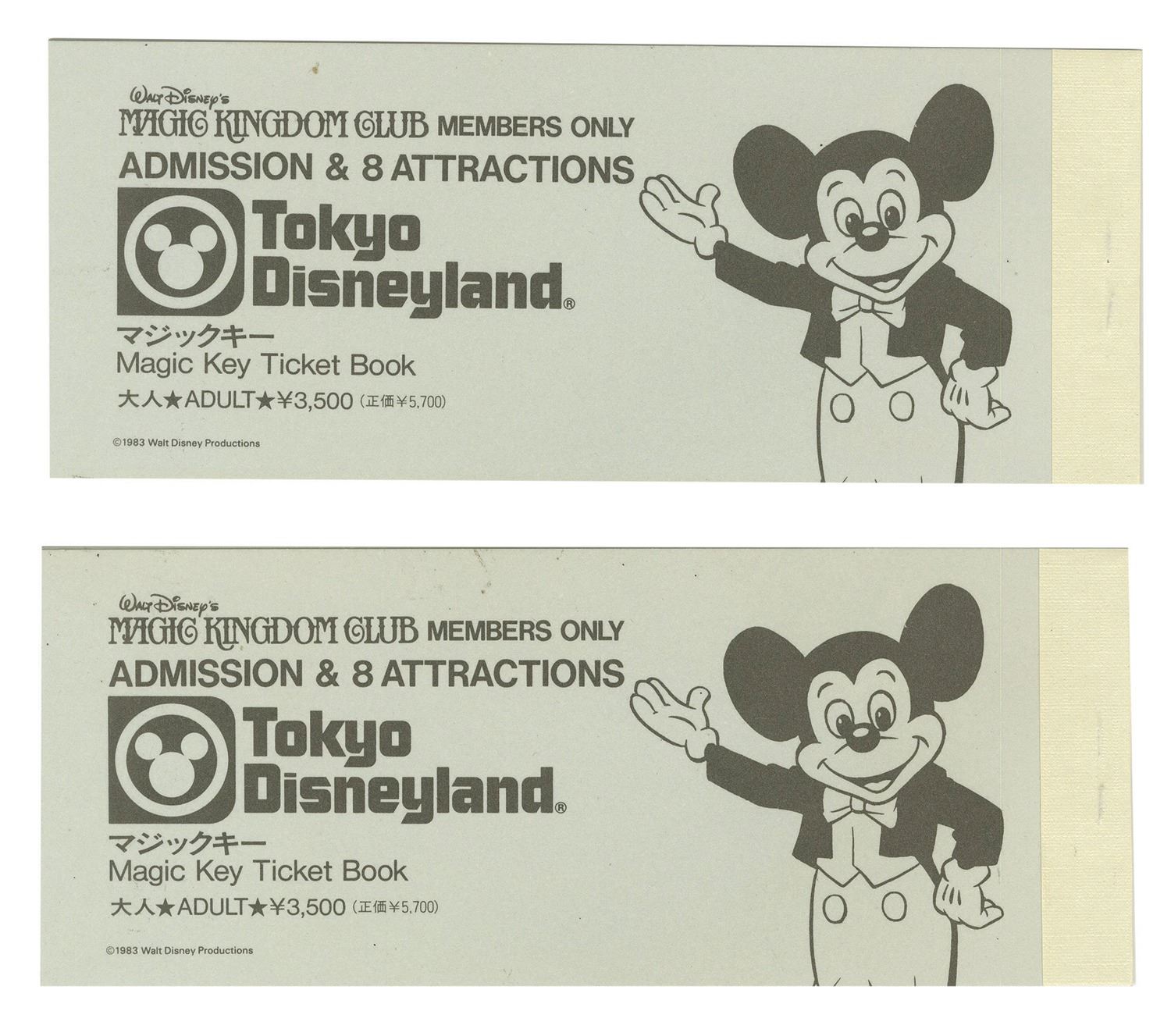 (Tokyo Disneyland, 1983) A pair of  Tokyo Disneyland Magic Kingdom Club ticket books from the opening day of the park. The two complete books still have the admission tickets intact and contain (8) tickets for any A thru E attractions. Also includes the original envelope the tickets came in. The books each measure 2.5"x6" and are in very good condition with some small markings on the admission tickets as well as edge-wear and some residue on the envelope.