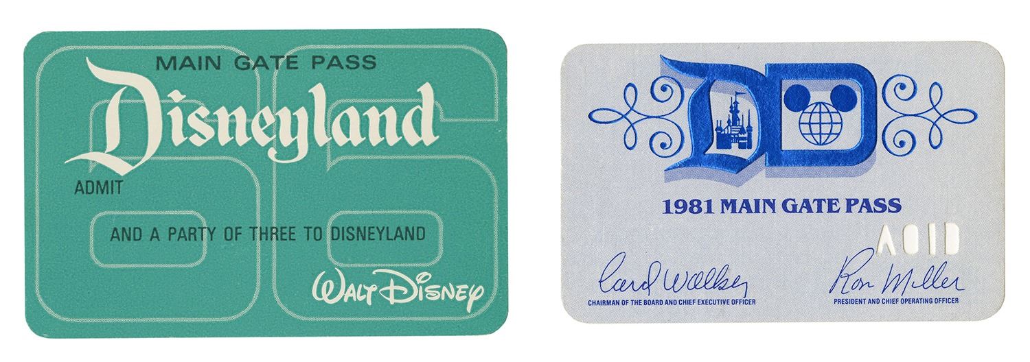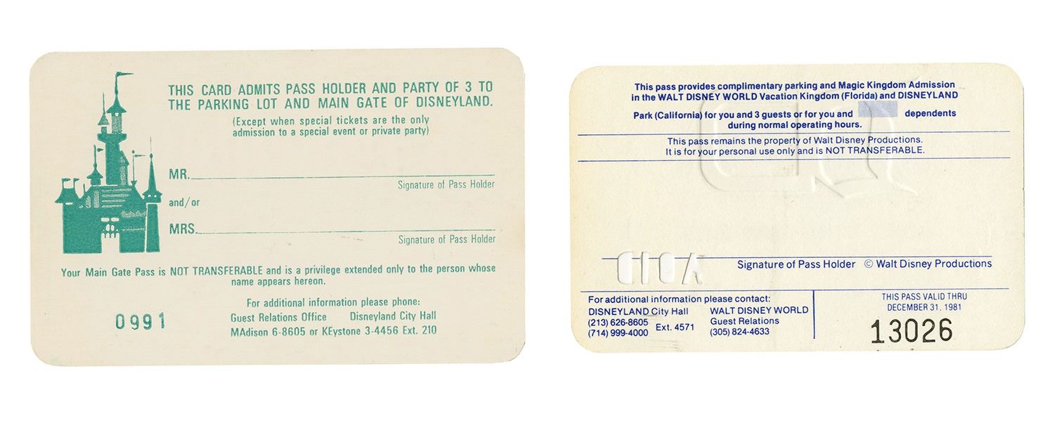 (Disneyland, c.1970s-81) A pair of Main Gate passes for Disneyland. The earlier teal pass would admit the holder and a party of three to Disneyland, while the blue pass was for either Disneyland or Walt Disney World. The green pass has not been filed out on the reverse, while the blue pass is punched "void" and was likely retained as a sample. Both passes measure approximately 2.5"x3.5", and are in very good condition with minor surface wear.