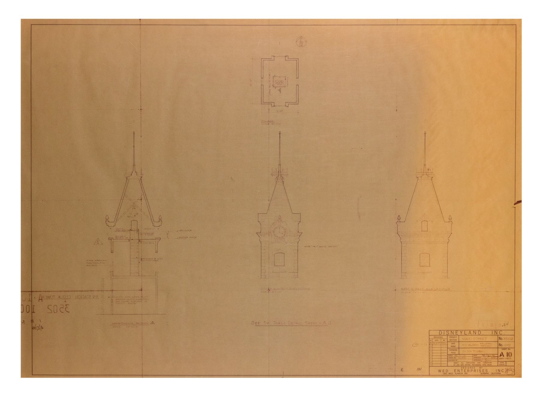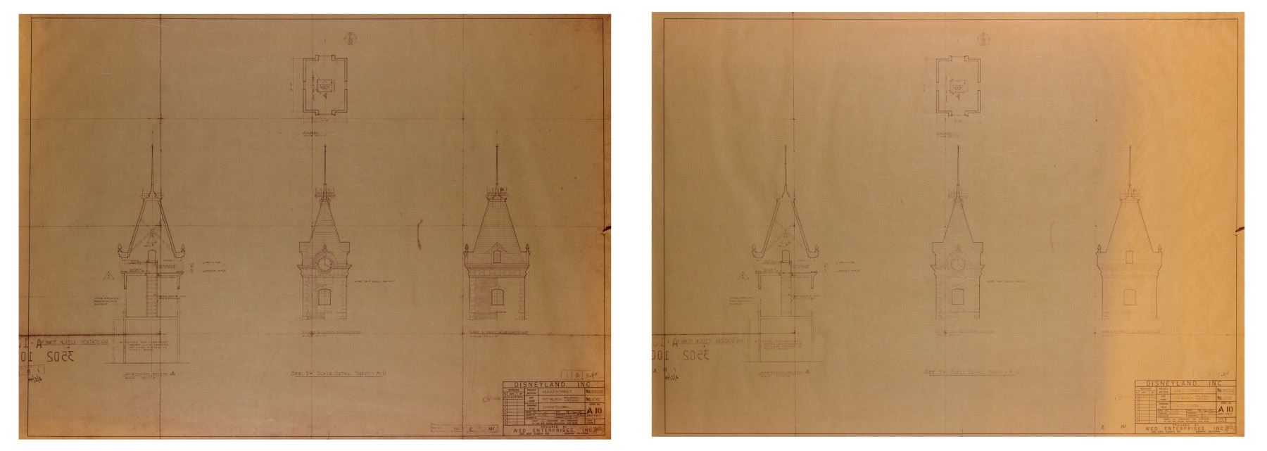 (Disneyland, c.1970s-80s) A pair of matching construction brownlines for buildings on the "100 Block" of Main Street at Disneyland. These brownlines show details for the clock tower on the Disneyland Railroad Station and feature the original imagery dated 4-20-55, although these brownlines were most likely used during later construction or maintenance between the 1970s and 1980s. The brownlines measure 30"x42" and are in very good condition with some edge-wear from use.
