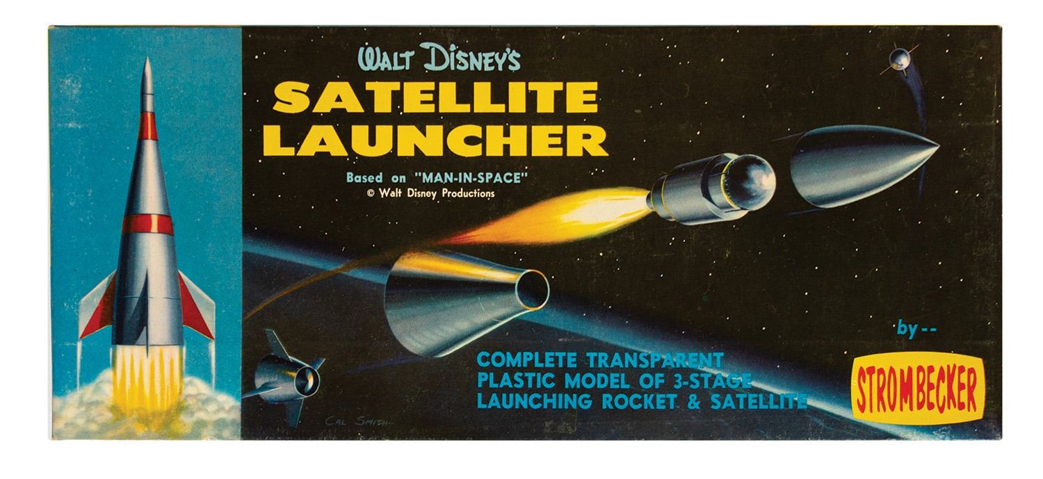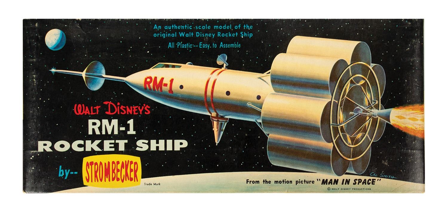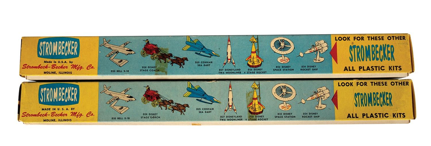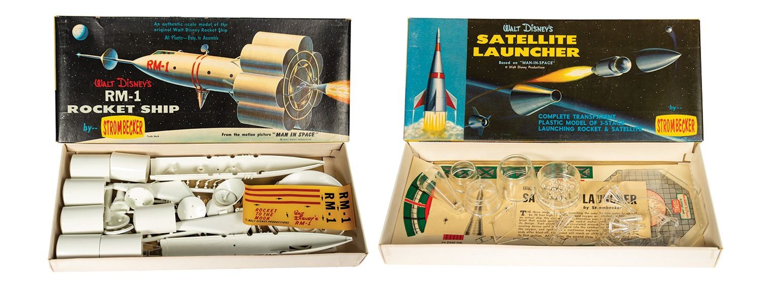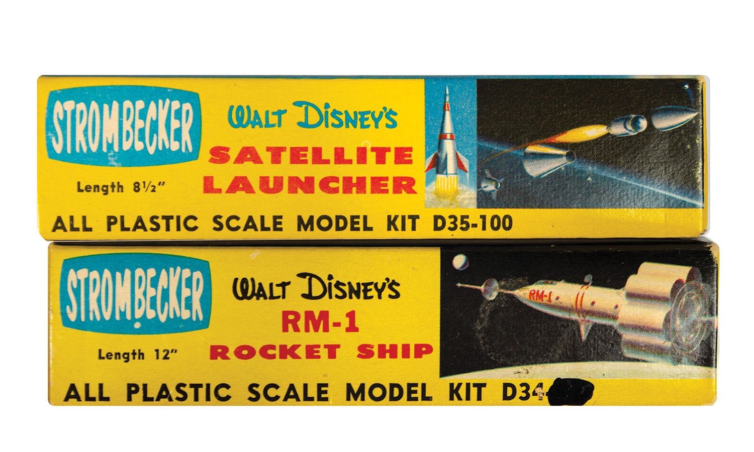 (Strombecker, 1955) A rare pair of rocket model kits based on the Walt Disney Studios featurette, Man In Space. Originally airing on Walt Disney's Disneyland television show in 1955, the episode became a standard in science education of the time, and was followed by text books, comic books, and toys such as these. The models, one of a satellite launcher and one of the RM-1 Rocketship, are both come in their original boxes. The kits appear to be nearly complete, however it is believed a few small pieces may be missing. Each box measures 5"x12" and 1.25" deep. The condition is very good with some shelf wear to the boxes.