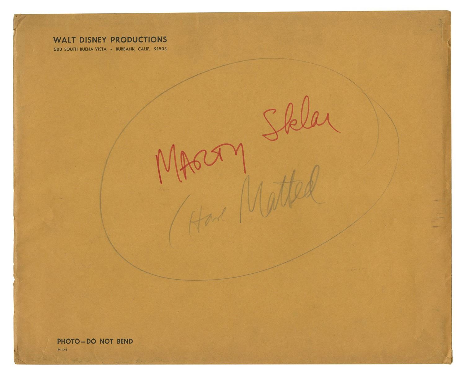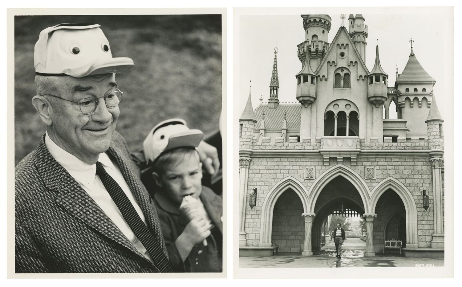(Disneyland, 1965) A pair of black and white publicity photos for Disneyland that once belonged to Disney Legend Marty Sklar. The photos include Walt in his well-known image below Sleeping Beauty Castle, as well as park guests wearing Donald Duck squeaker hats. The photos come with their Walt Disney Productions envelope with the hand-written note of Marty's name, with the indication that these photos were to be placed in mat frames. Both photos have 1965 Walt Disney Productions copyright stamps on the reverse, and measure 10"x8". The condition is very good with little wear from age.