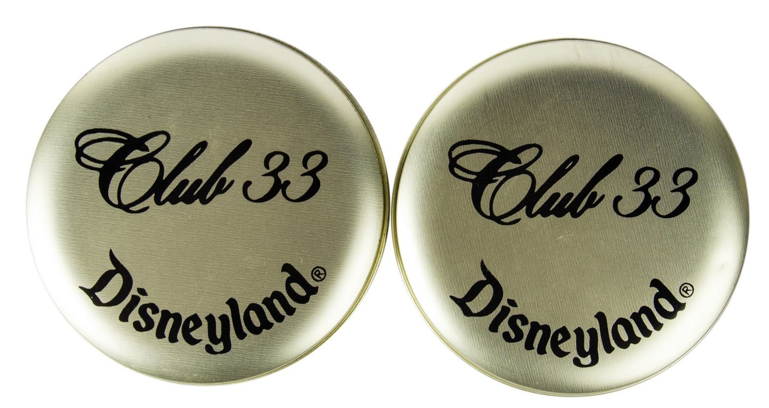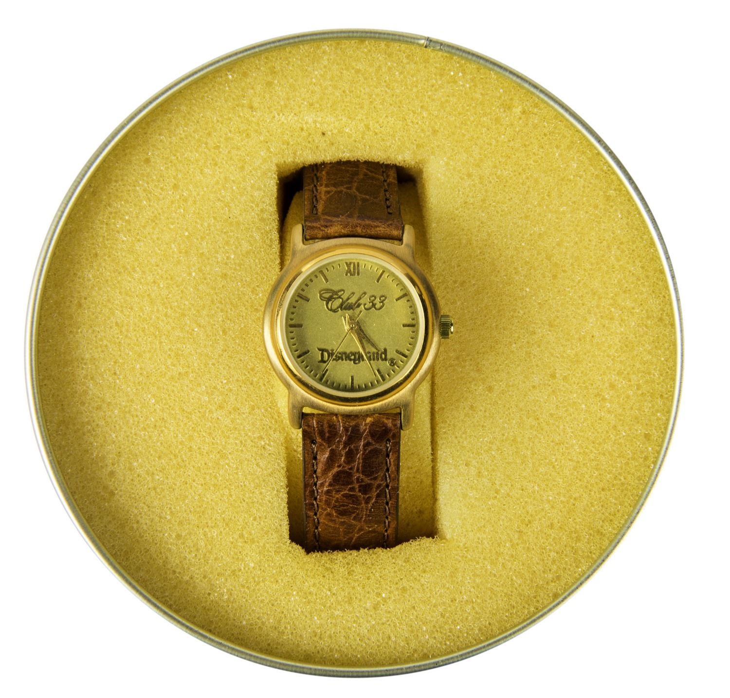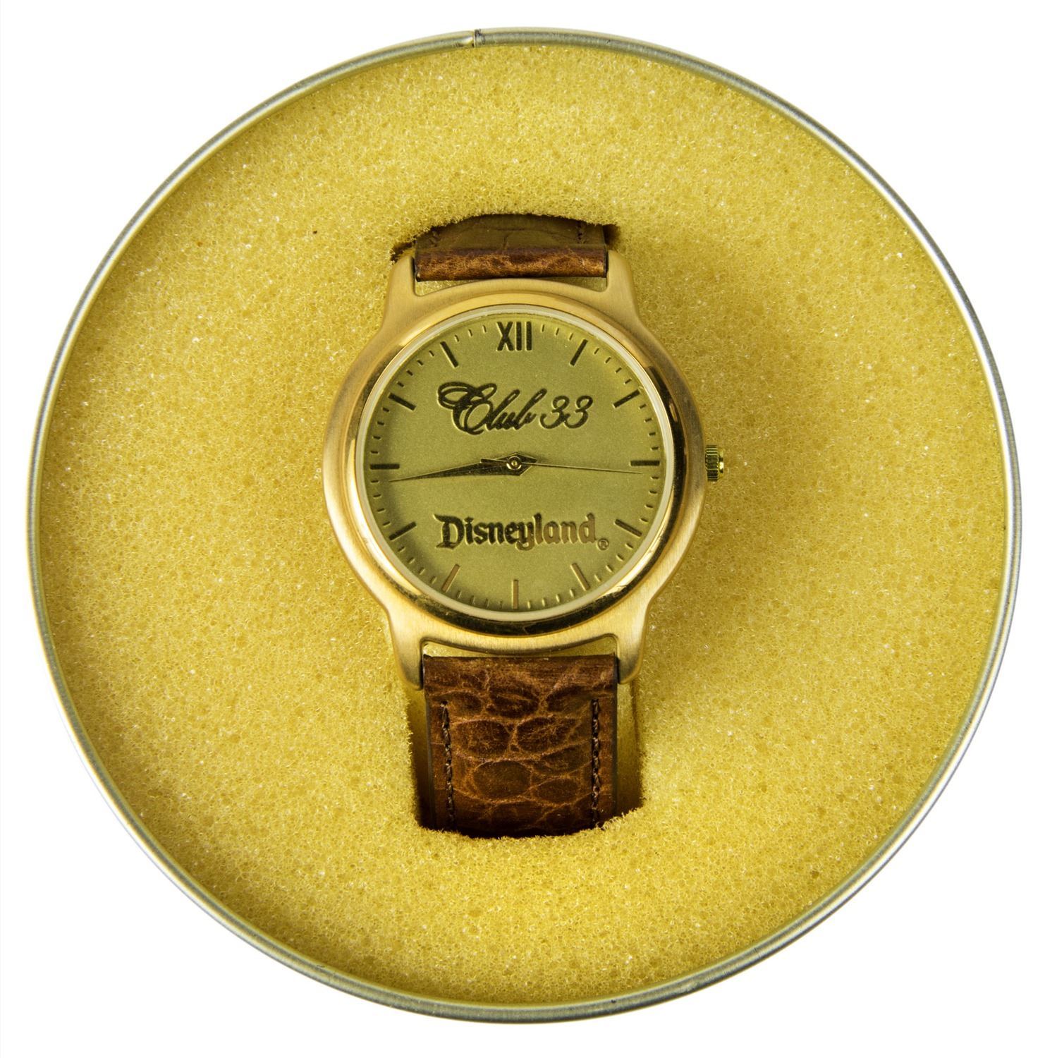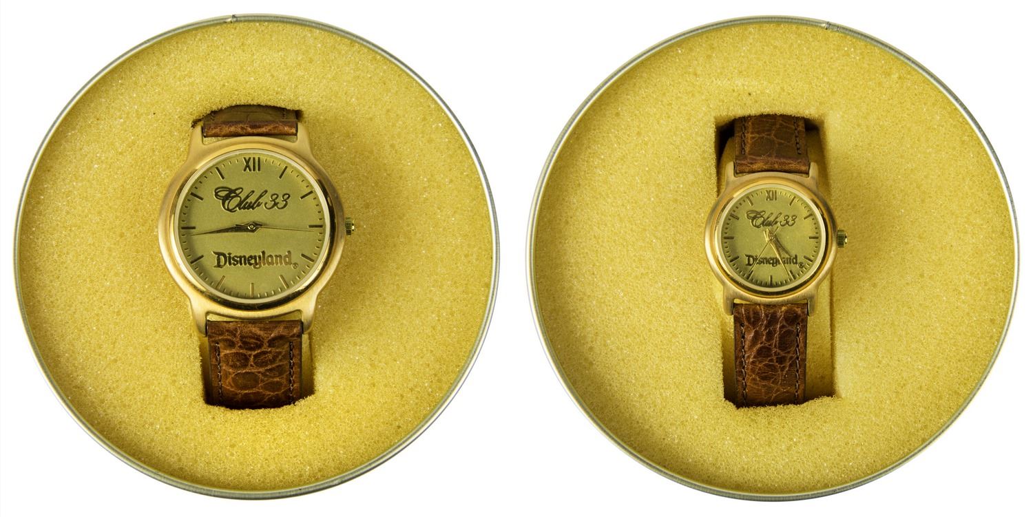 (Disneyland, c.1990) A pair of matching watches from Disneyland's "Club 33". The watches feature the name "Club 33" within the gold-tone watch face and have brown leather straps. They come in stylish cylindrical containers with the name of the club on the lid. The watches measure approximately 8.5" to 9" long, and the pair is in very good condition with some wear and minor creasing to the leather straps from use. The hands can still be adjusted, but the watches need new batteries.