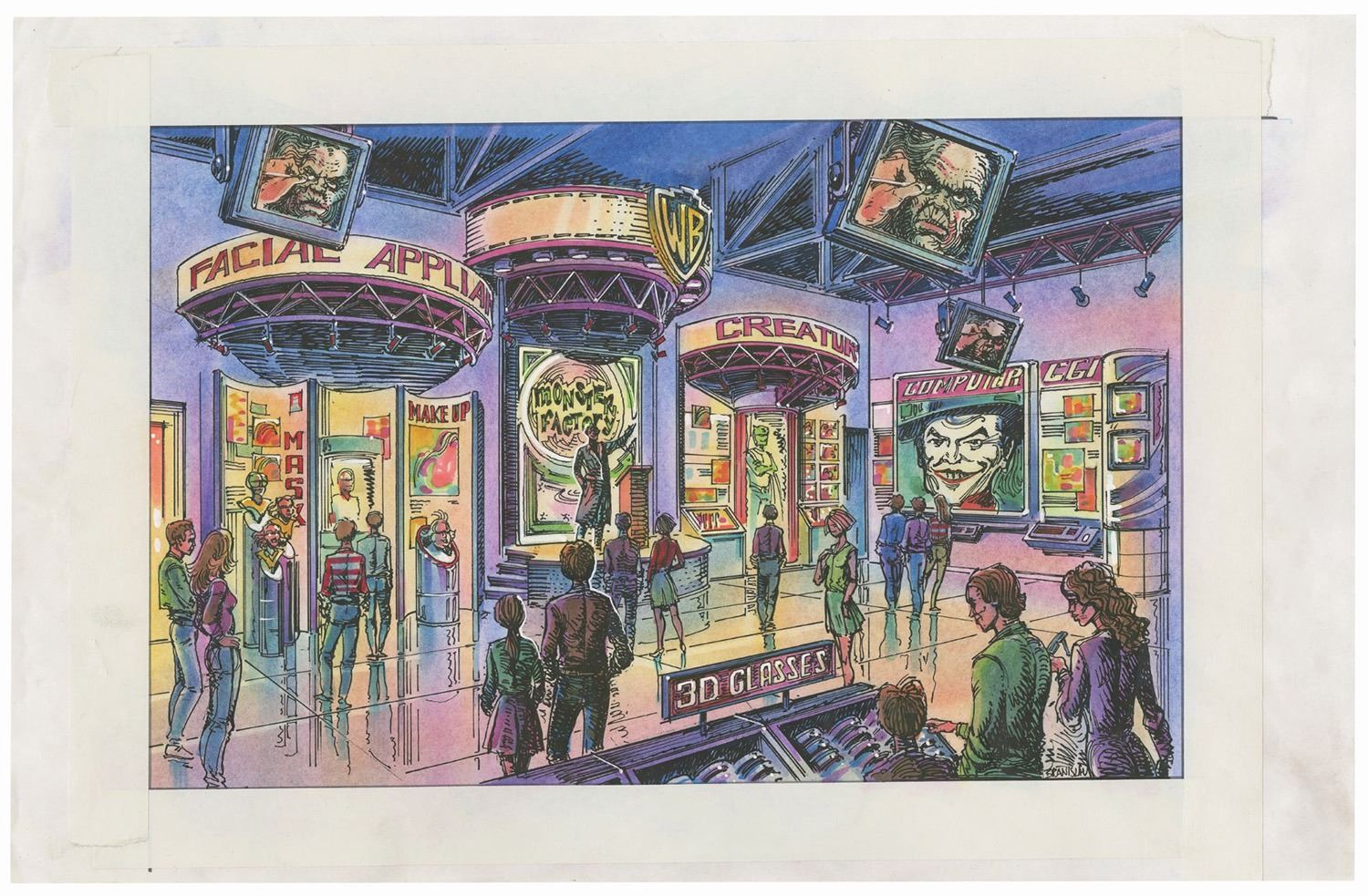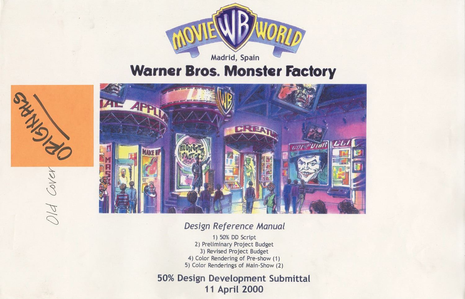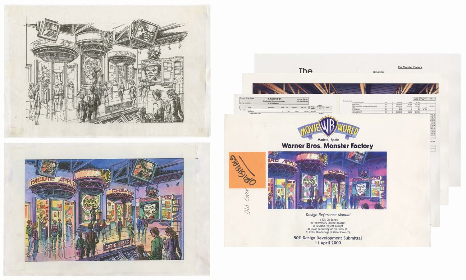 (Landmark Entertainment, 2000) A pair of storyboards of Monster Factory for Warner Bros Movie World, and a design reference manual. One of the storyboards is an original ink drawing, and the other is a hand-colored xerox. The design manual includes a budget, a design schedule, and a script. Measuring 11"x17", the concepts and 25-page manual are in very good condition with some edge-wear.