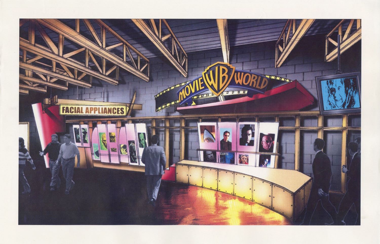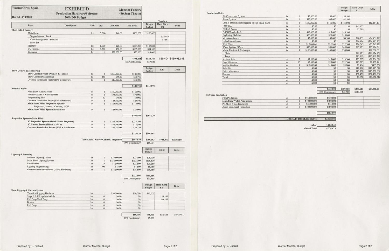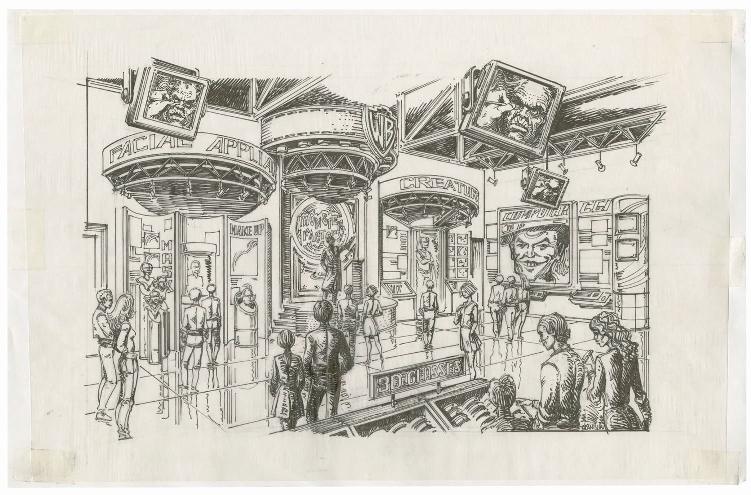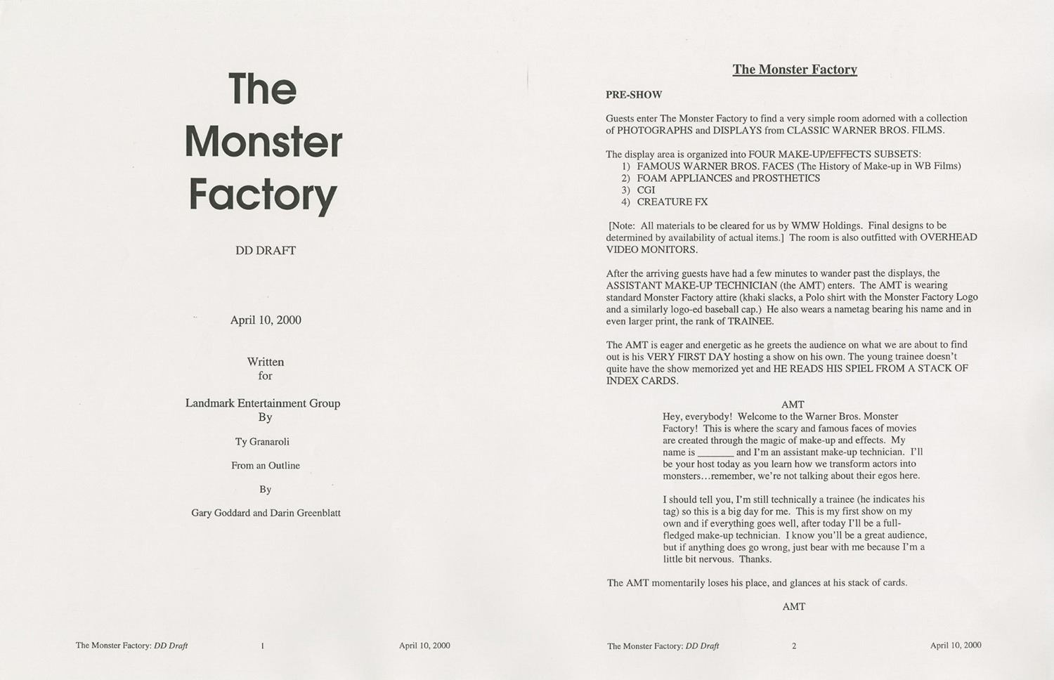 (Landmark Entertainment, 2000) A pair of storyboards of Monster Factory for Warner Bros Movie World, and a design reference manual. One of the storyboards is an original ink drawing, and the other is a hand-colored xerox. The design manual includes a budget, a design schedule, and a script. Measuring 11"x17", the concepts and 25-page manual are in very good condition with some edge-wear.