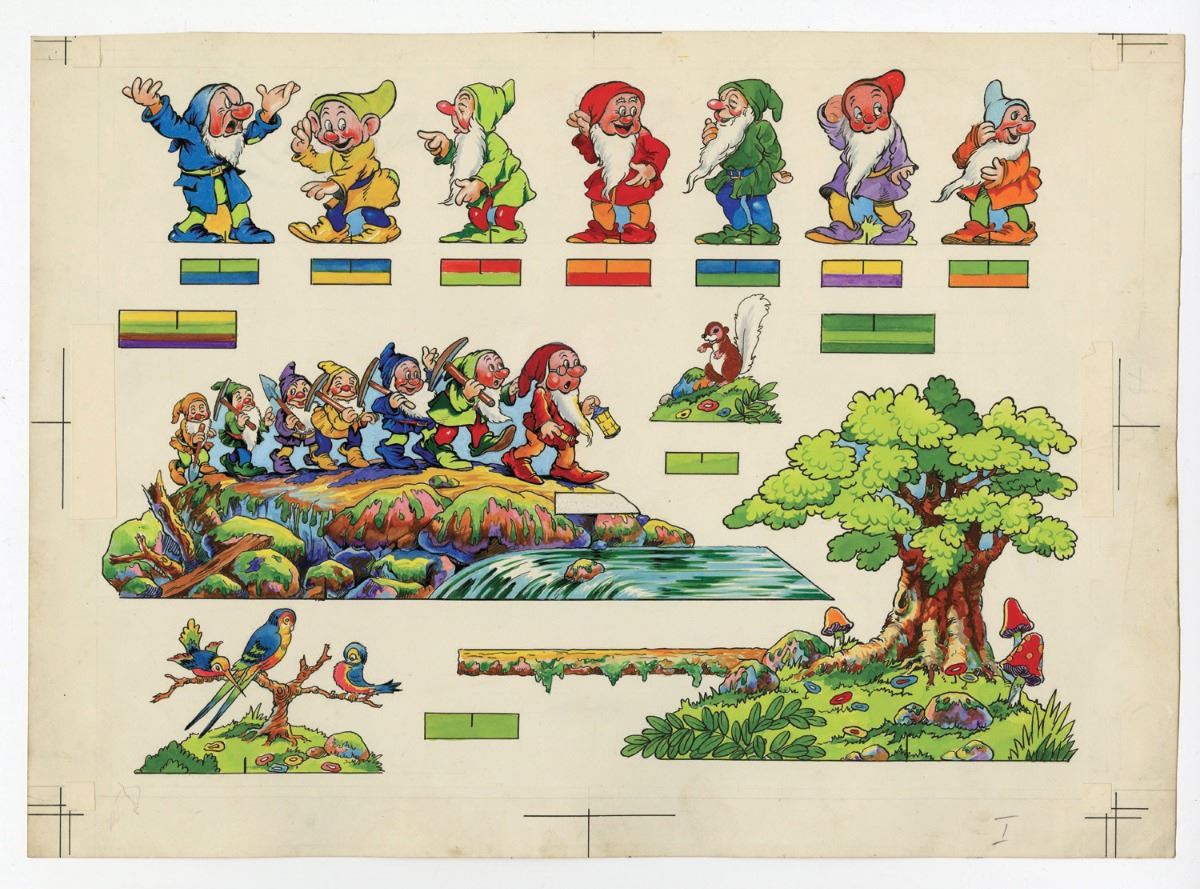 (Dean and Son, 1938) Rare (2) pages of original artwork from Dean's "Snow White and the Seven Dwarfs" cut-out book. Features all seven Dwarfs in various scenes including heading to the mine and washing for supper. Accomplished in ink, watercolor and gouache. Pages measure approximately 11.25"x15.4". In very good condition overall.
