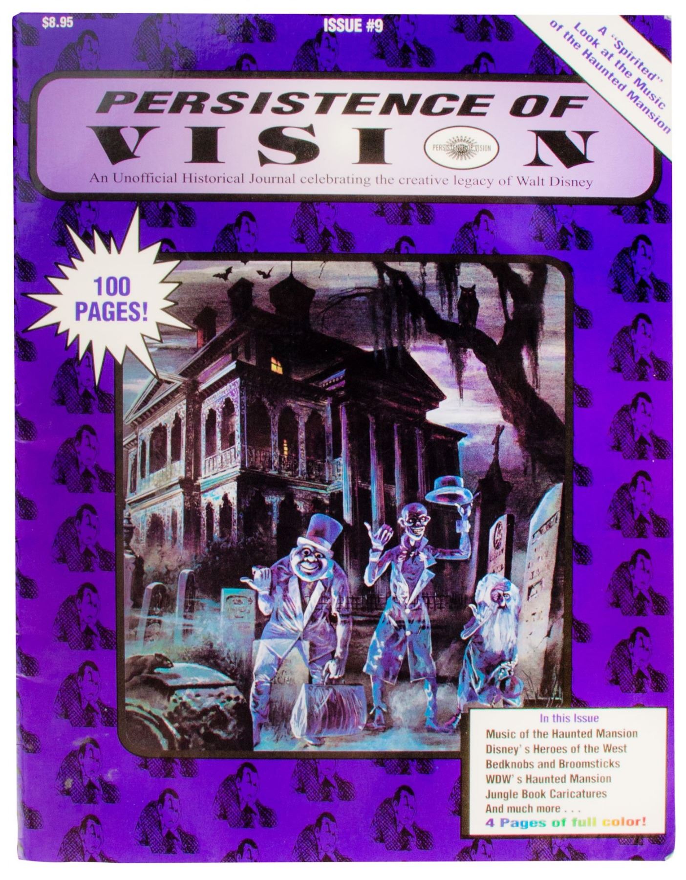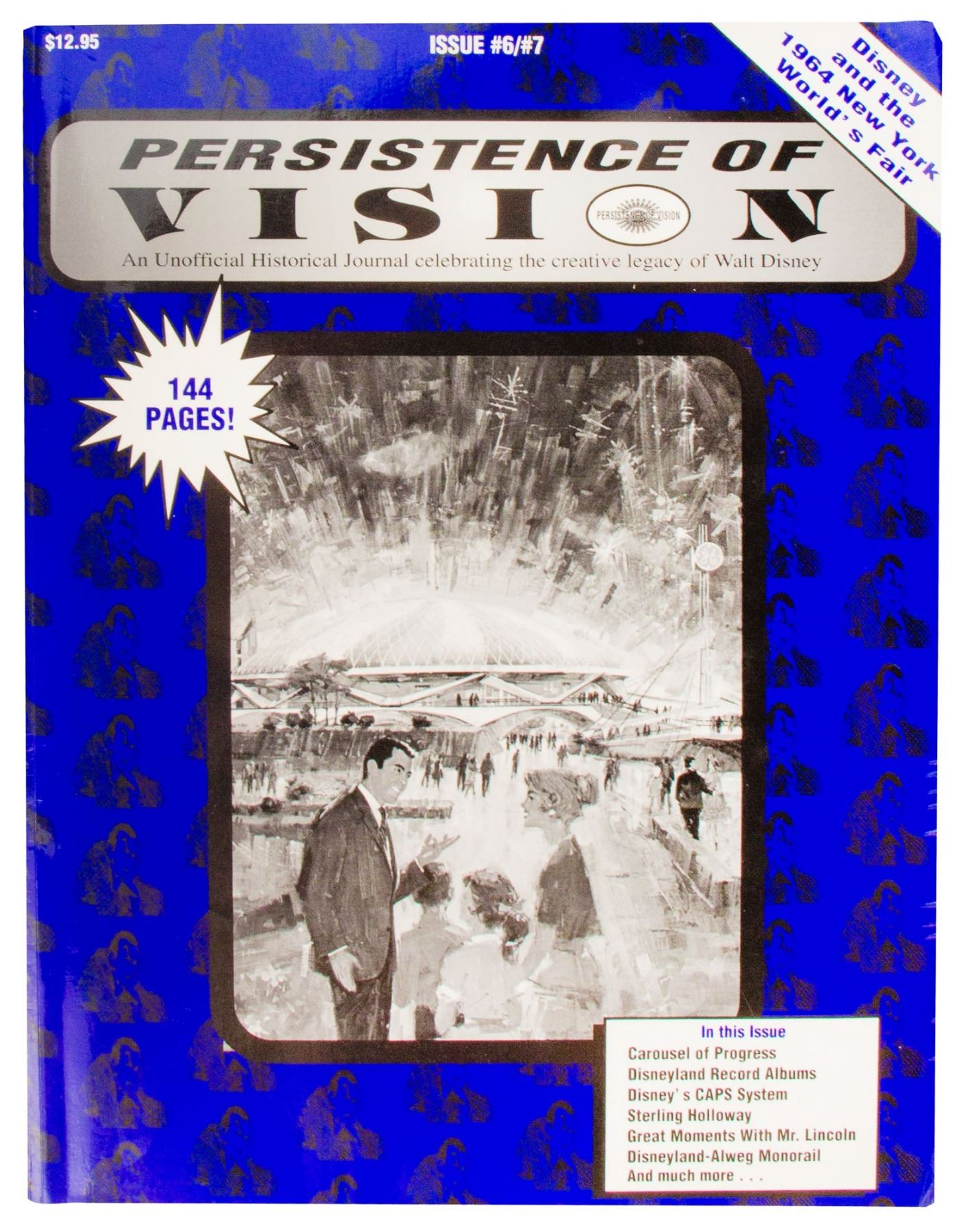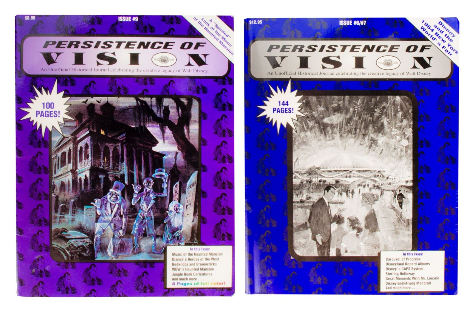 (Disney, 1995/97) A pair of very rare "Persistence of Vision" historical journals featuring photos and articles dedicated to celebrating the creative legacy of Walt Disney. These issues contain information on the "Haunted Mansion" and the 1964-65 New York World's Fair, with information on aspects that Rolly Crump worked on. The issues measure 11"x8.5" and are in very good condition with some edge-wear.