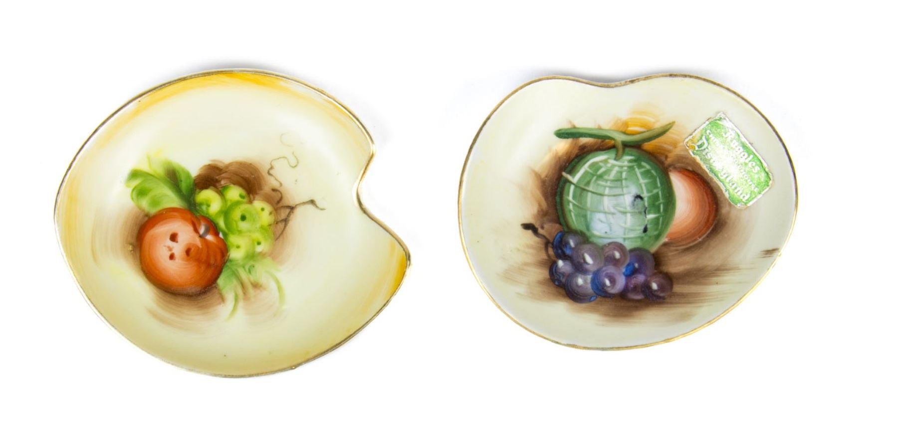 (Disneyland, c.1950s) A rare pair of ceramic dishes from Main Street's "Ruggles China & Gift House" at Disneyland. The dishes depict various fruits, with one of the dishes still retaining the green "Ruggles" Disneyland sales sticker on the surface. The dishes measure approximately 4.5"x4" each, and the condition is very good with some surface wear from use.
