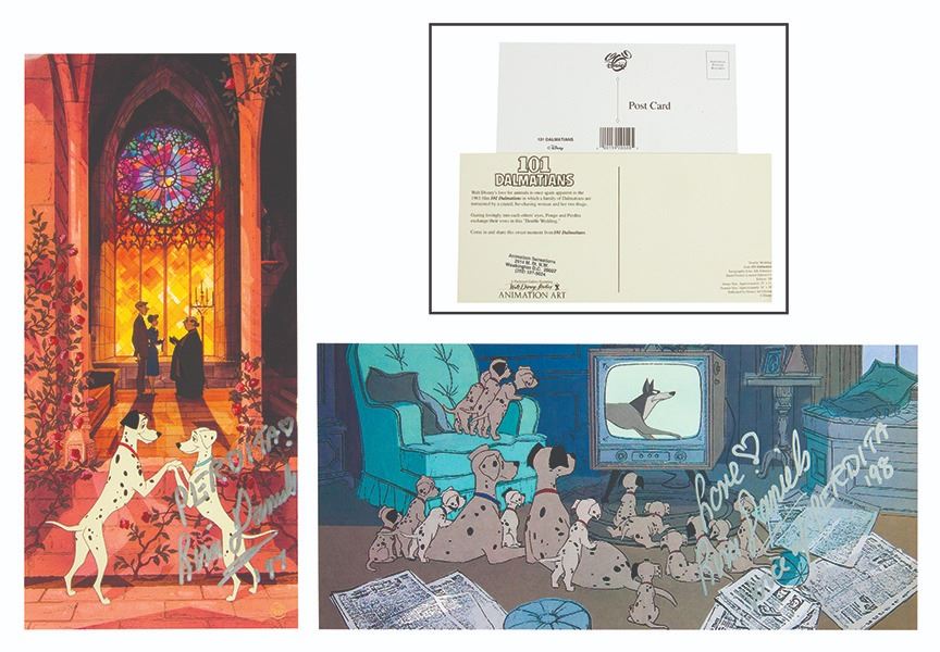 (Disney, 1990s) A pair of postcards featuring imagery from Disney's 101 Dalmatians that are signed by Lisa Daniels, the original voice of Perdita. One of the postcards depicts the scene in which the puppies are watching television, which was a scene worked on by Rolly Crump. The postcards measure 3.25"x7" and 4.25"x9", and the pair is in very good condition with little wear.