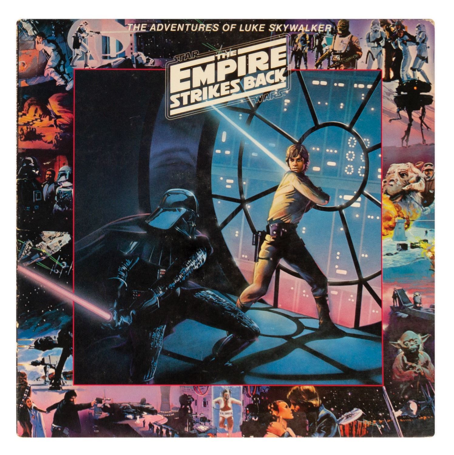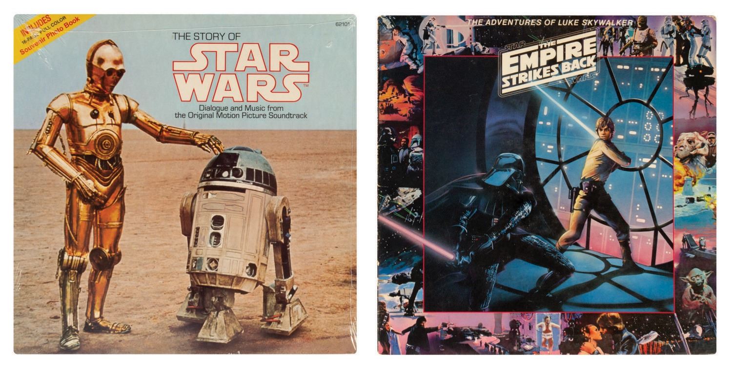 (20th Century Fox/RSO, 1977-80) A pair of records based on the Star Wars franchise. The pair tell the story of Star Wars and The Empire Strikes Back and contain original dialogue and music from the feature films. Both records measure approximately 12.5"x12.5" within their covers. The Star Wars record is unused and still sealed within its original plastic, and the Empire record is in very good unused condition with minor wear.