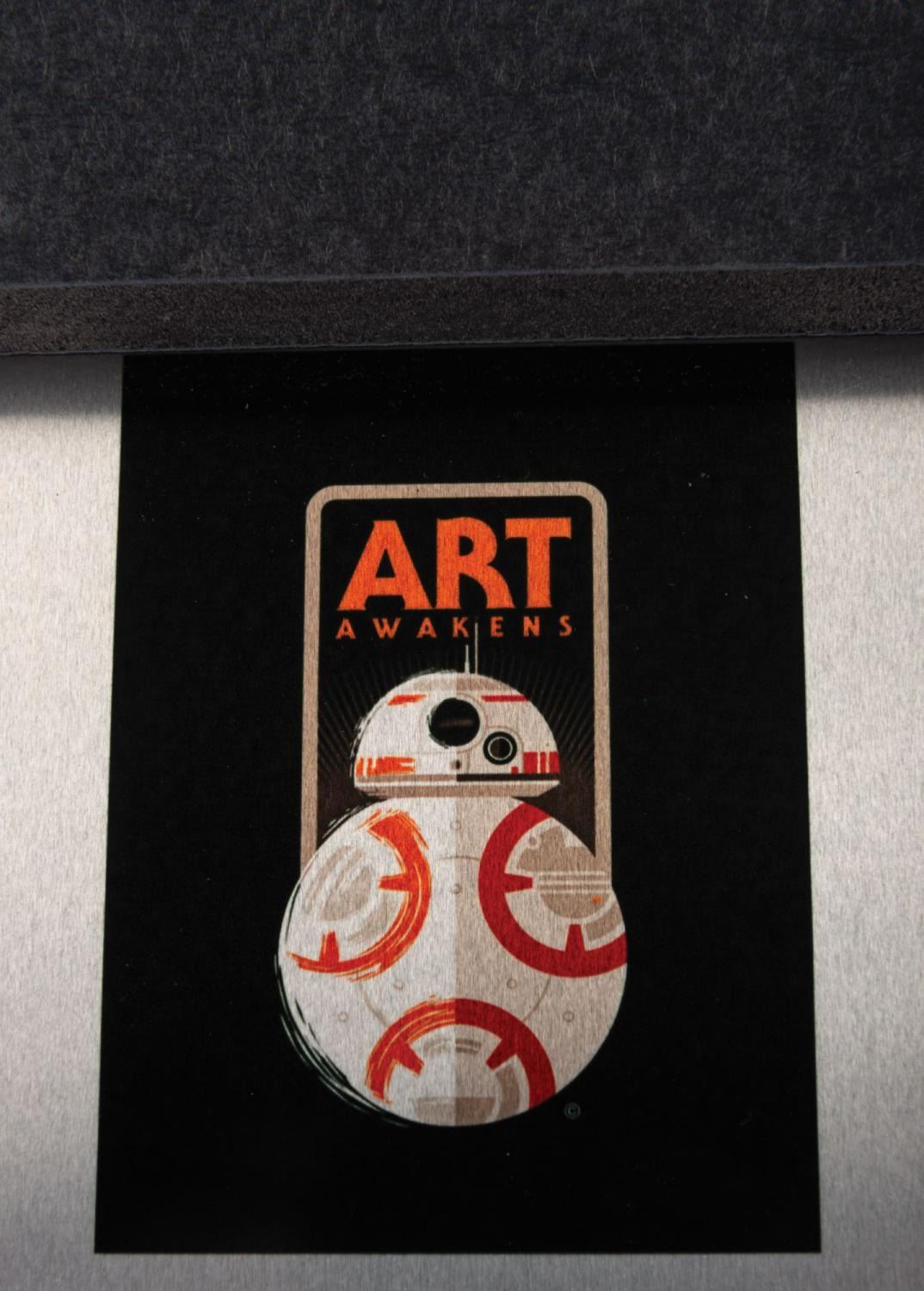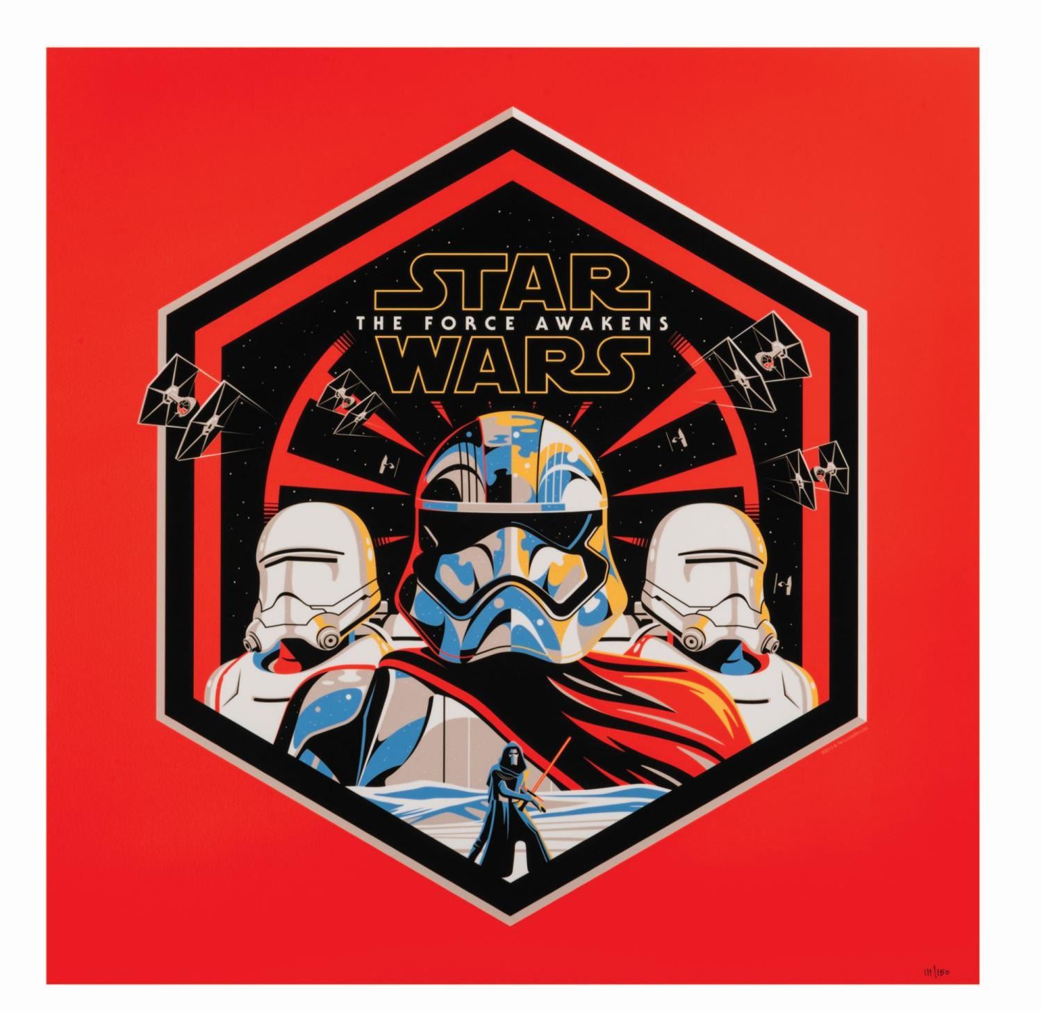 (Disney, 2015) A pair of exclusive metal prints created prior to the release of Star Wars: The Force Awakens. The prints were only offered at D23 as part of the Star Wars: Force for Change event to benefit the UNICEF Kid Power initiative. The prints depict the heroes and villains of the new film, and measure 20"x20" each. Both are in very fine condition.