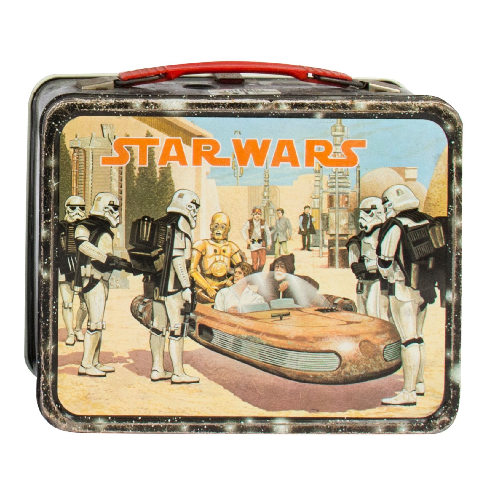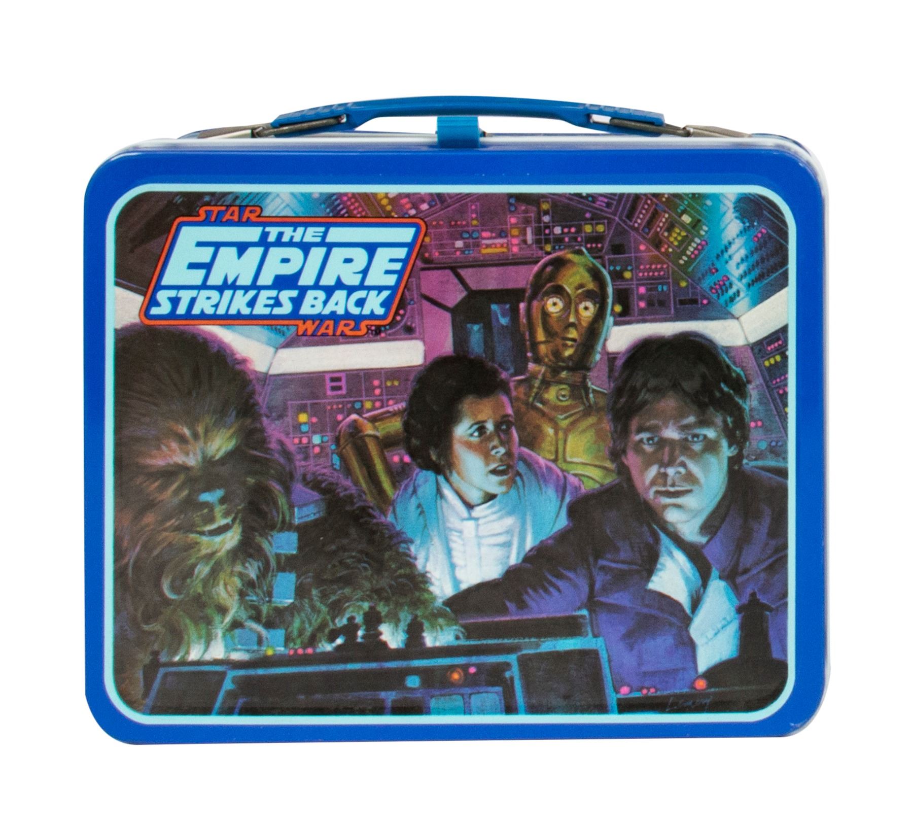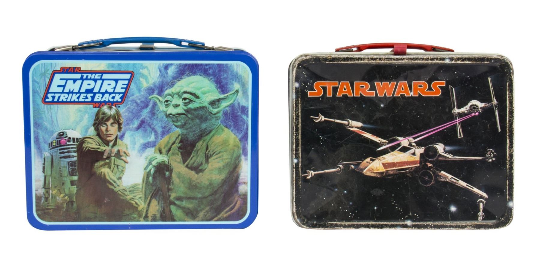 (LucasFilm, 1977/80) A pair of lunch boxes from the original "Star Wars" and "The Empire Strikes Back". Created by King Seeley Thermos Co, these metal lunch boxes feature beautiful imagery based on the films, and the "Empire" lunch box has the original thermos inside. Both lunch boxes have functioning clasps and present beautifully. Measuring 7"x8" and 4" thick each, the lunch boxes are in good overall condition with some small dents, scratches, and wear from use without, but primarily to the "Star Wars" lunch box.