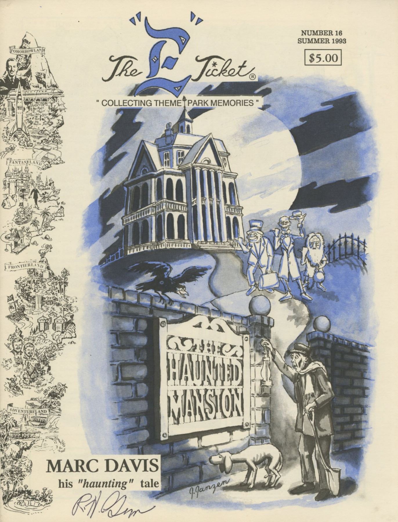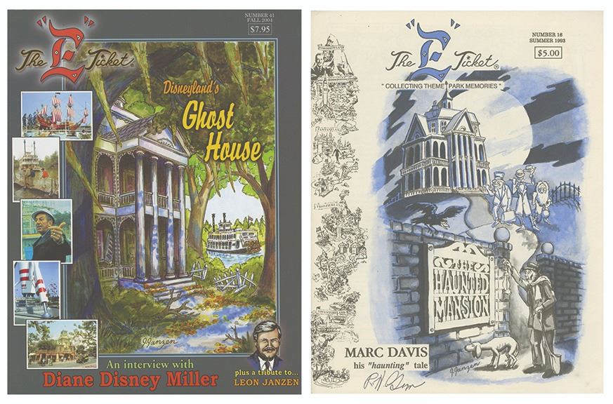 (Disneyland, 1993/2004) A pair of rare "The E Ticket" magazines featuring information and inside looks at the creation of the "Haunted Mansion" at Disneyland. These issues include no.16 which is signed on the cover by Imagineer Bob Gurr who designed the attraction's Omnimover vehicles, and issue no.41. The magazines measure 11"x8.5" and are in very good condition.