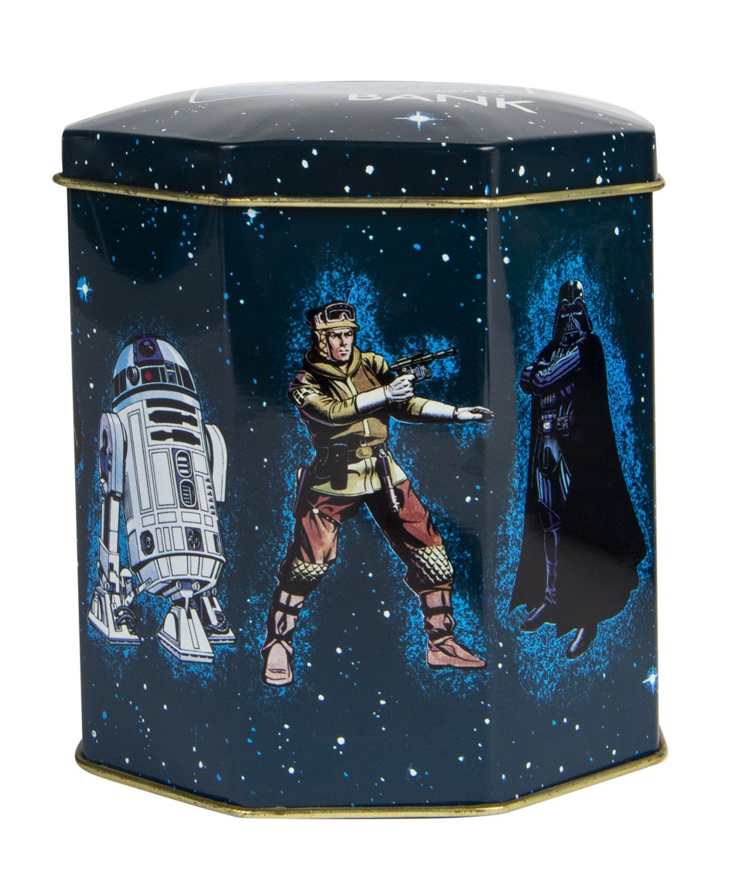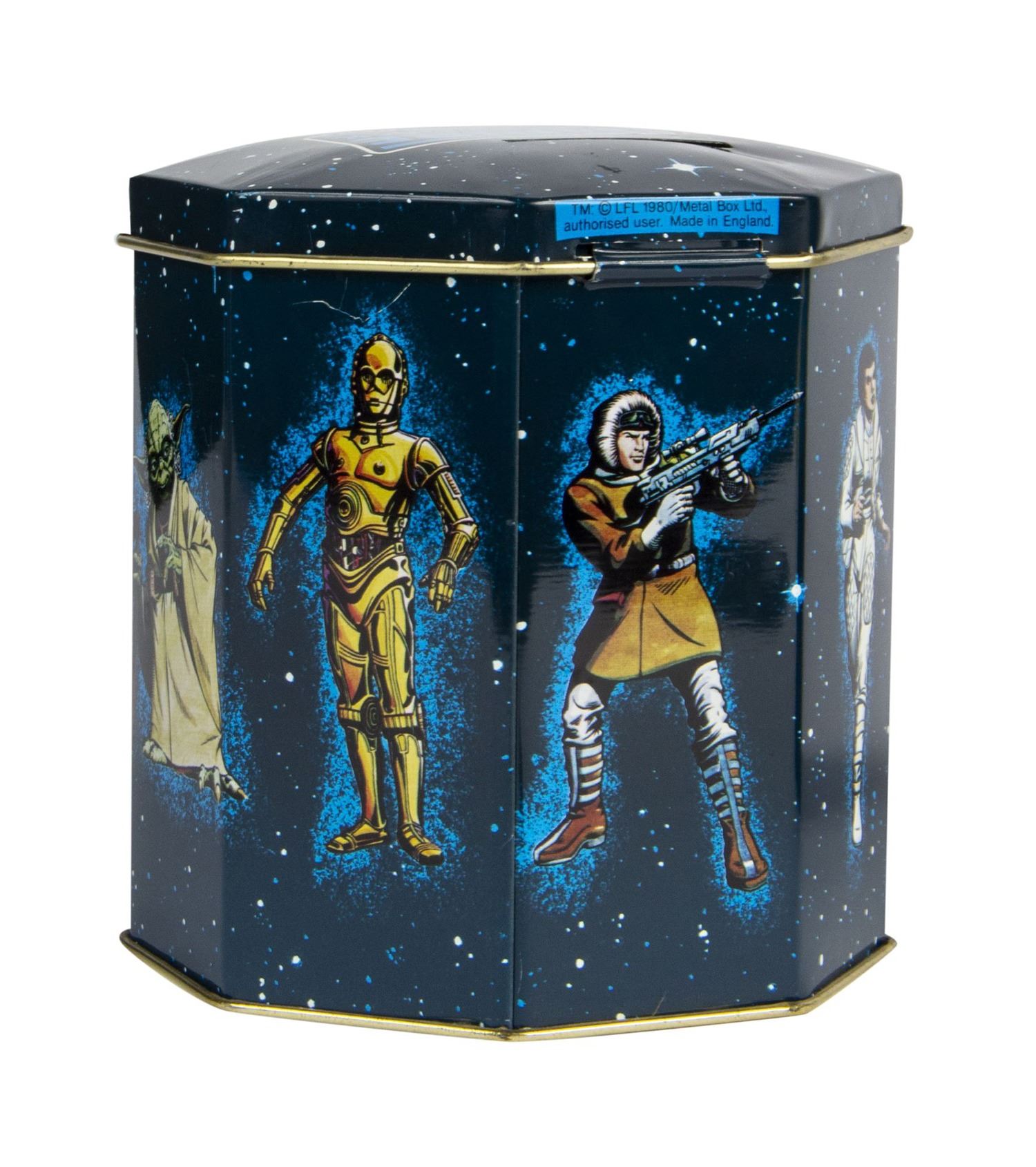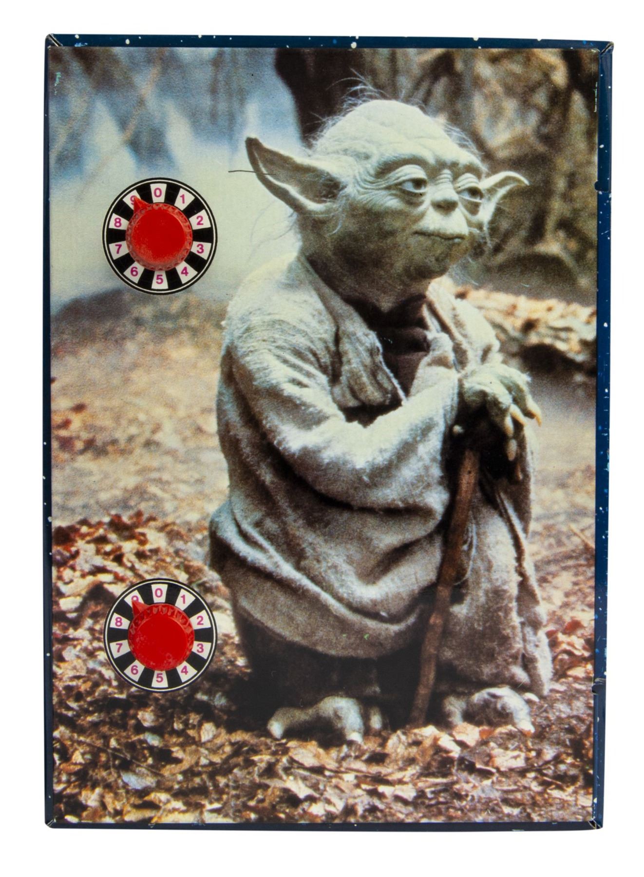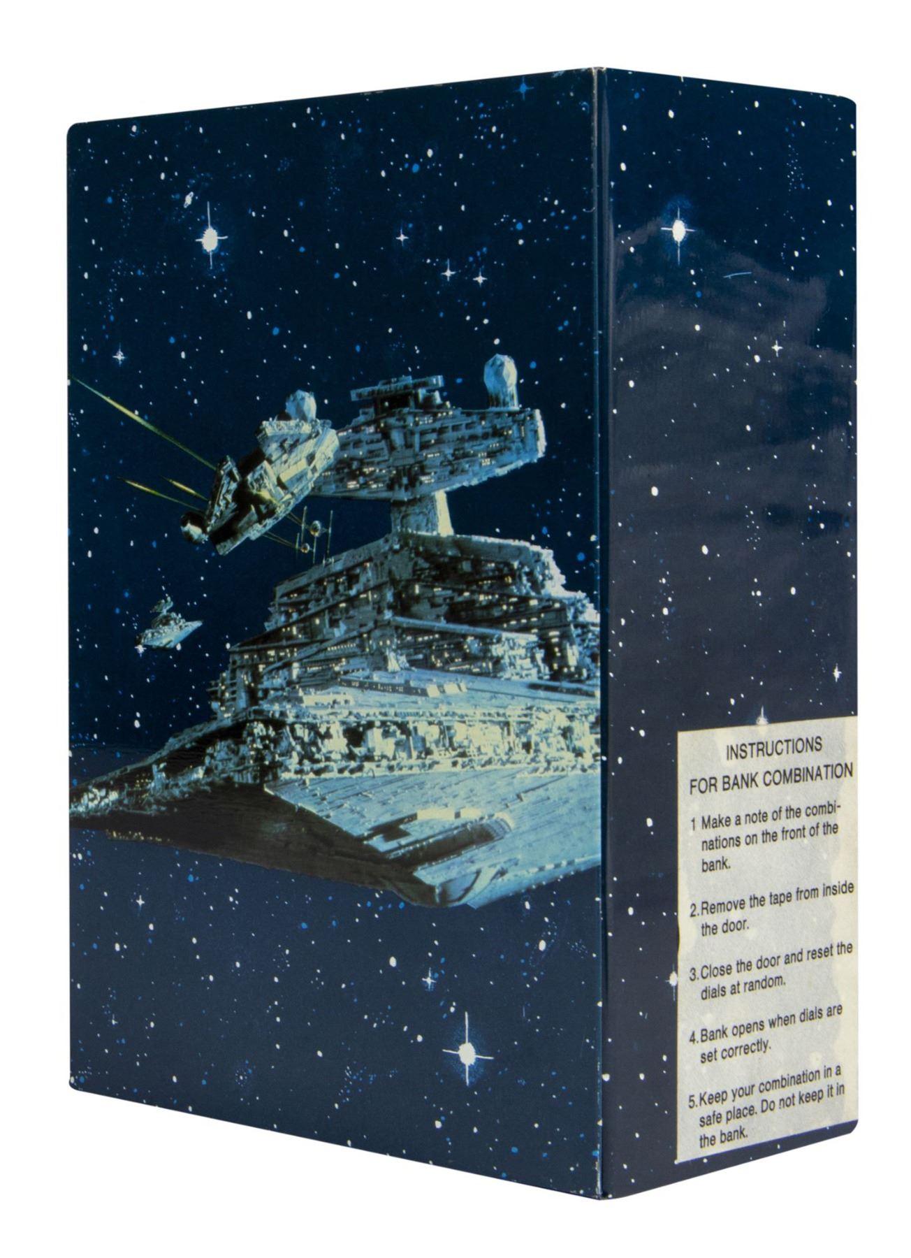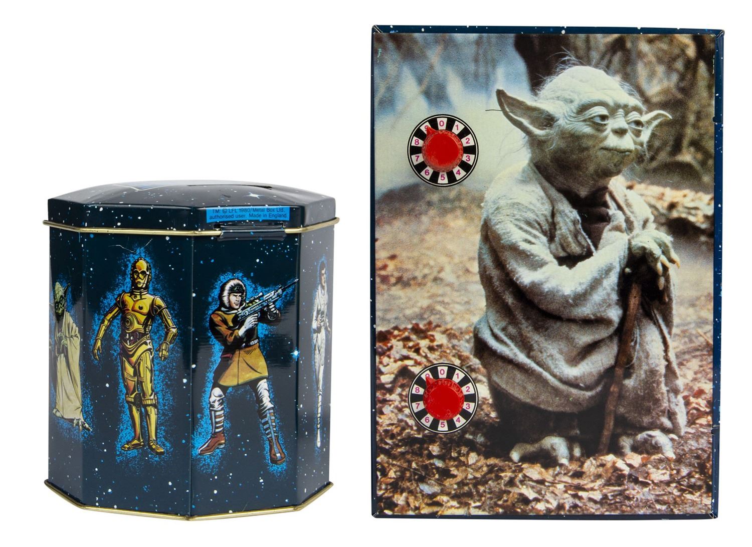 (Lucasfilm, 1980) A pair of children's banks featuring imagery from The Empire Strikes Back. The banks include a combination bank with Yoda, and a smaller bank with a hinged top. Created by Metal Box Ltd., the combination bank measures 7"x5" and 3" thick, and the hinged bank measures 4" tall. The condition of these banks is very good overall, with some minor wear from storage and light use. The combination bank has the code written in felt pen on the side.
