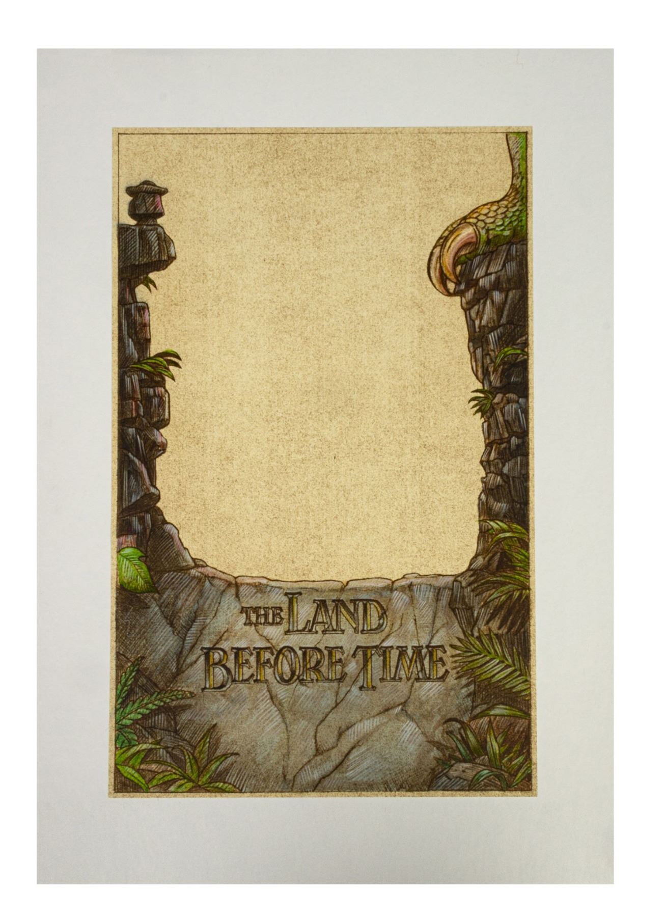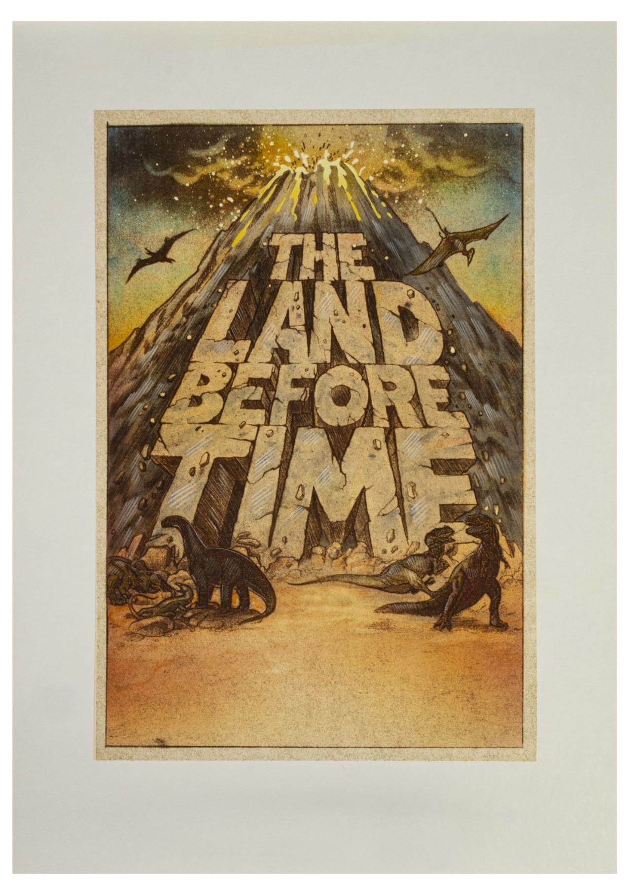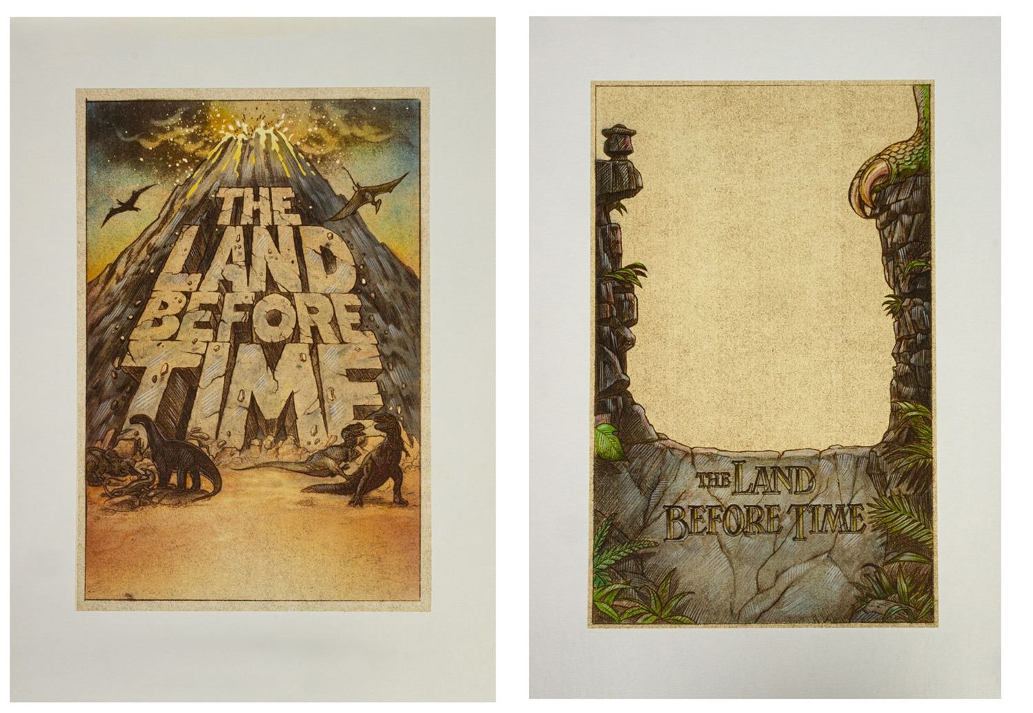 (Universal, 1988) A pair of original color poster concepts for The Land Before Time. Accomplished in conte and acrylic on thin art paper that is mounted to two art boards, these original concept illustrations feature the film's title with prehistoric imagery. The volcano concept has an image size of 14.5"x10" while the other concept has an image size of 15.5"x9.75". Both concept are on 19.5"x13.5" boards, and the overall condition is very fine with minor wear from developmental use.