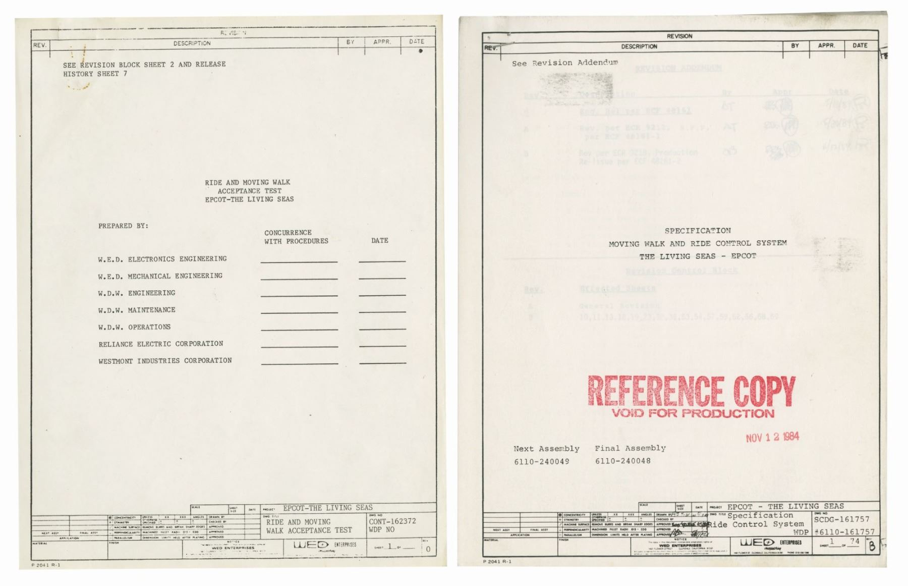 (Epcot, 1984) A very rare pair of ride control specifications and test packets from the Living Seas attraction. These detailed packets contain many pages of rare information about the Living Seas attraction and were prepared by the engineering, maintenance, and operations departments from Walt Disney World. Each packet has the WED Enterprises Imagineering logo in the bottom-right corner, and one packet has a red stamp reading, Reference Copy - Void for Production. The test packets are in good condition with some wear from age.