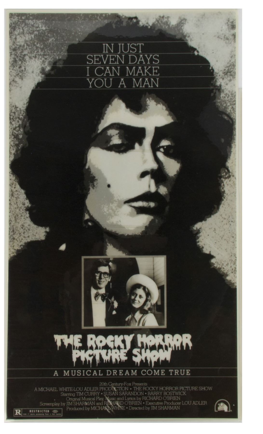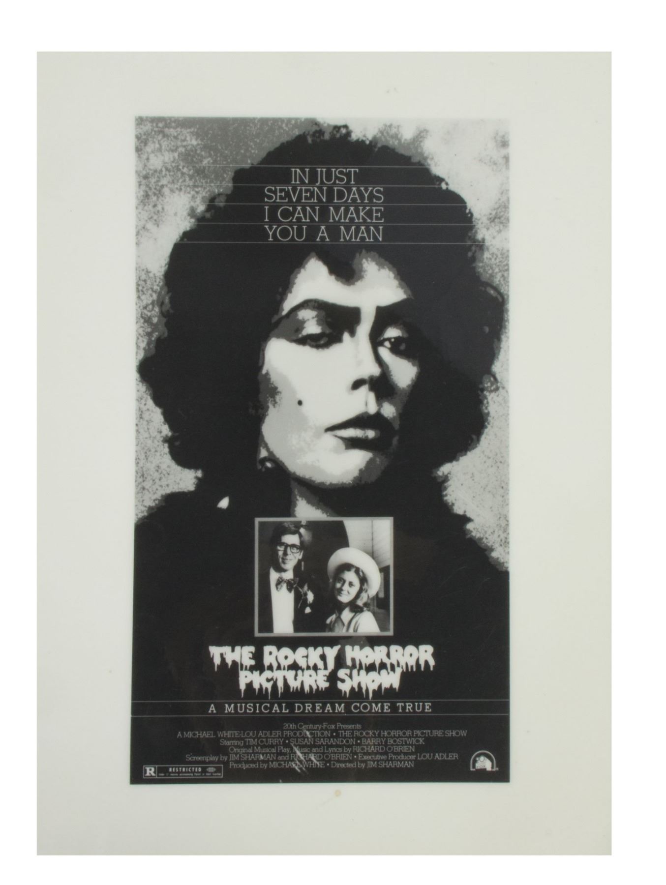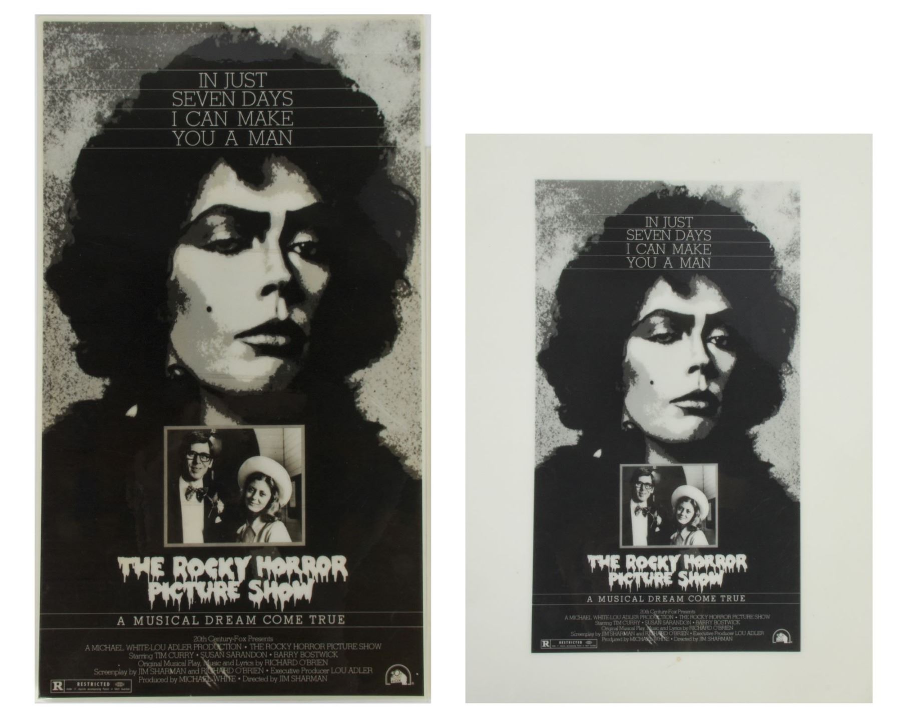 (20th Century Fox, 1975) A pair of small poster samples for "The Rocky Horror Picture Show". These samples were printed in two sizes during the development of the final poster and were laminated to be used as reference. The poster samples measure 13.75"x10.5" and 17"x9.25". The condition is good overall with some surface wear from use.