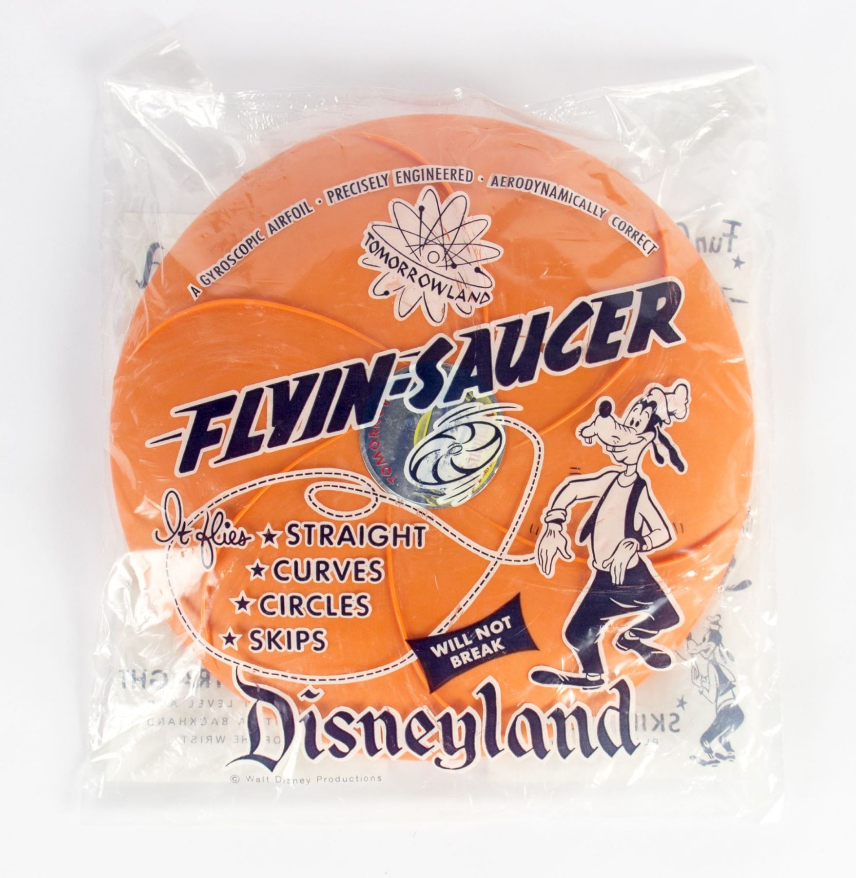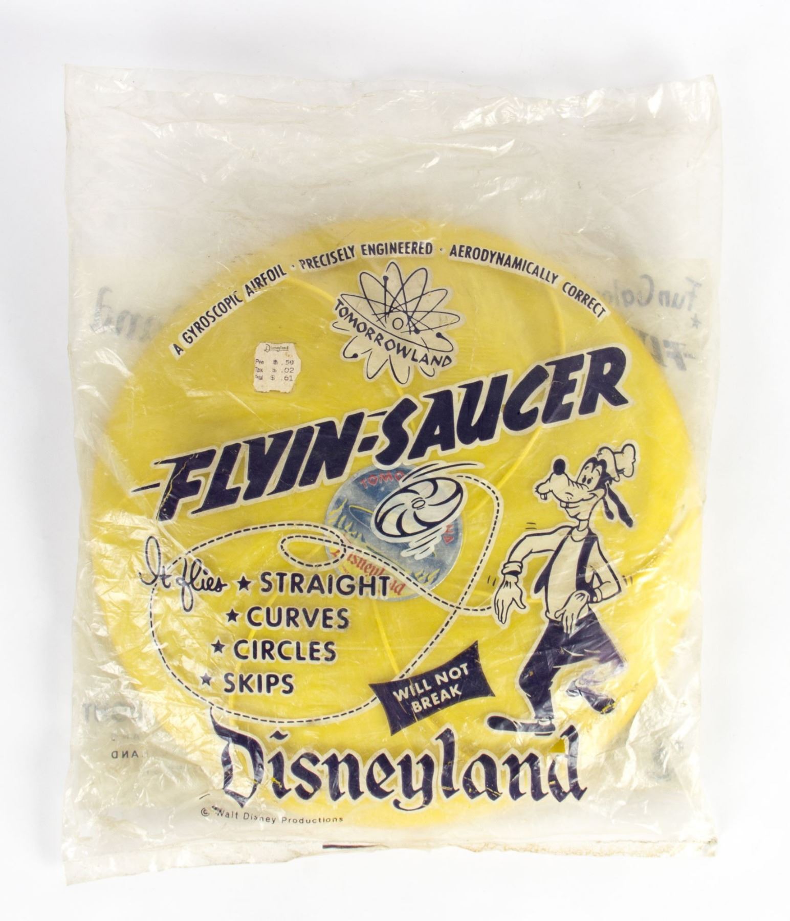 (Disneyland, c.1955) A very rare pair of "Flyin-Saucer" souvenir toys from Disneyland. Both of these toys, one in yellow and one in orange, come in their original packaging and have stickers in the center with pre-opening Imagineering imagery of Tomorrowland. Both saucers themselves measure 9.5" in diameter and are in fine condition, with some wear and discoloration to the packaging.