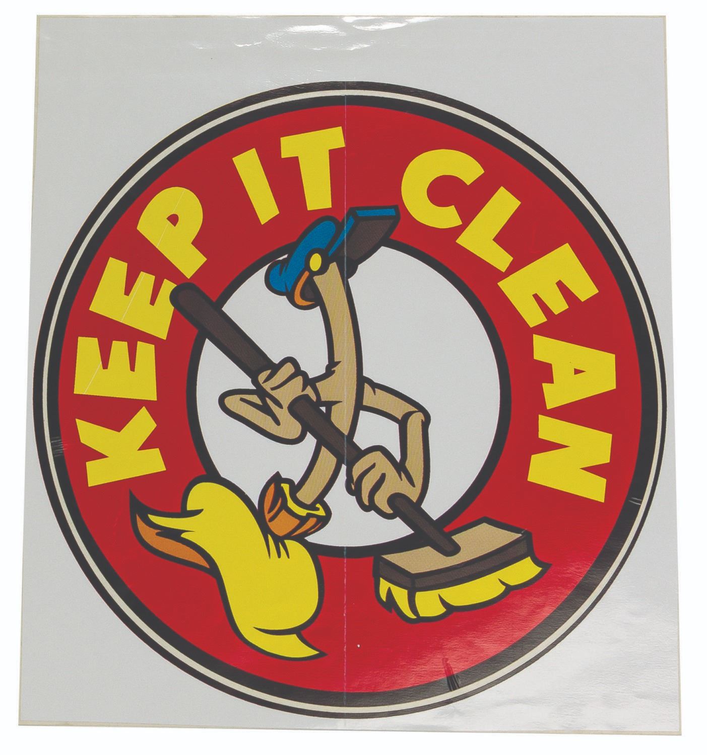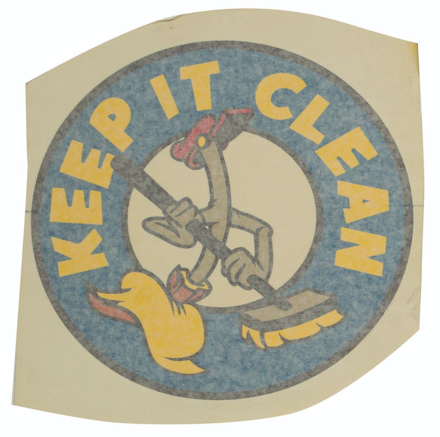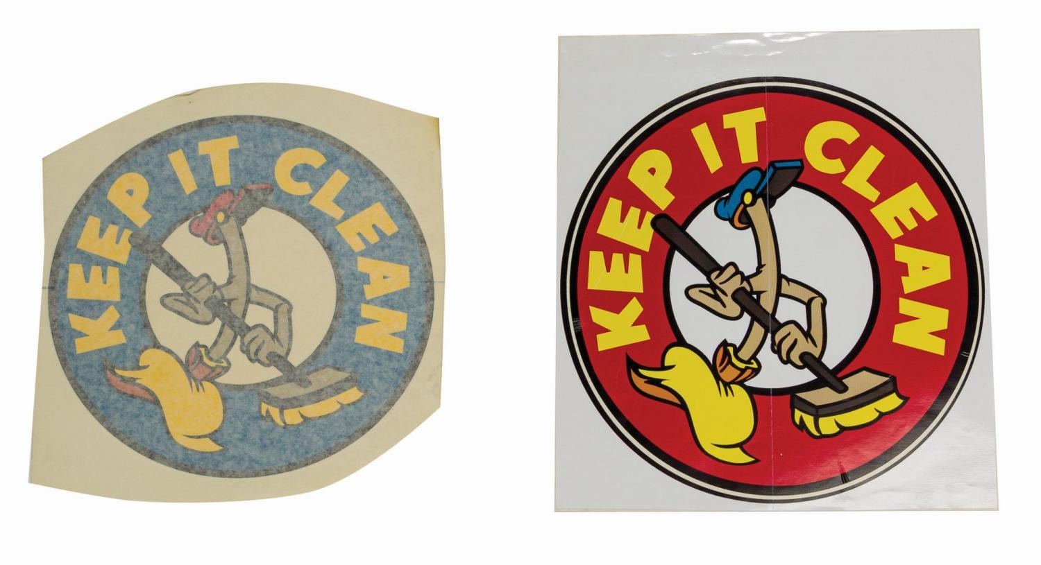 (Disneyland, c.1990s) A pair of unused trash can decals created for Mickey's Toontown. Featuring one of the living brooms from Fantasia, the logos come in red and blue variants and display the message "Keep it Clean." Both logos measure 10" in diameter and are in very good condition, still attached to their original backing paper. The blue decal is covered by a protective paper layer. The red decal shows minor wrinkling a demonstrates a couple of printing errors creating lines through the image.