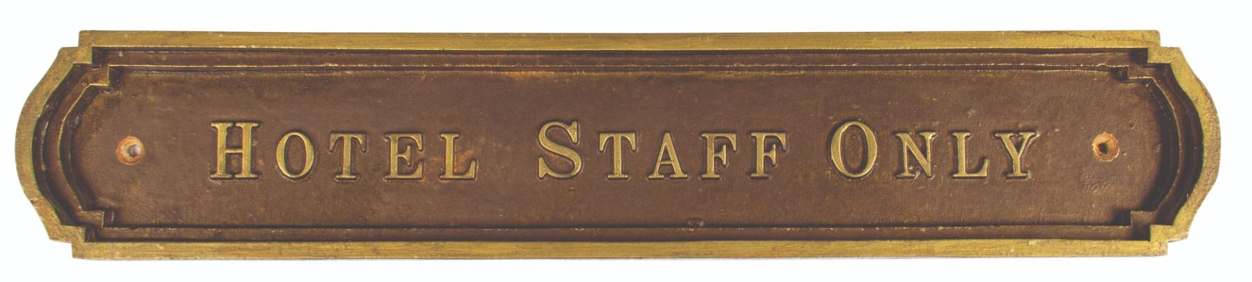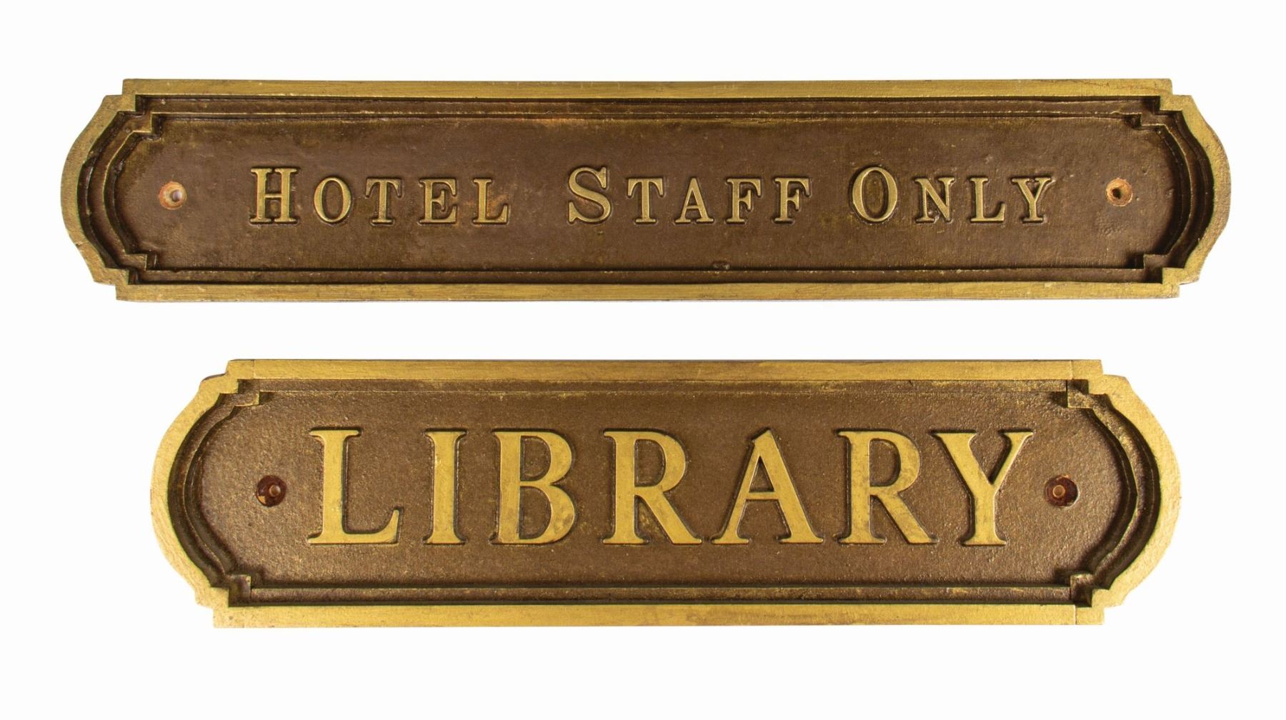 (Disney-MGM, c.2000s) A pair of original sign props from The Twilight Zone Tower of Terror. These signs are hand-painted and composed of a light-weight wood and designate the Library as well as a section for Hotel Staff Only. The signs measure 3.5"x13" and 3"x15.25", respectively. The condition is very good overall with a few small scuffs to the paint from use.
