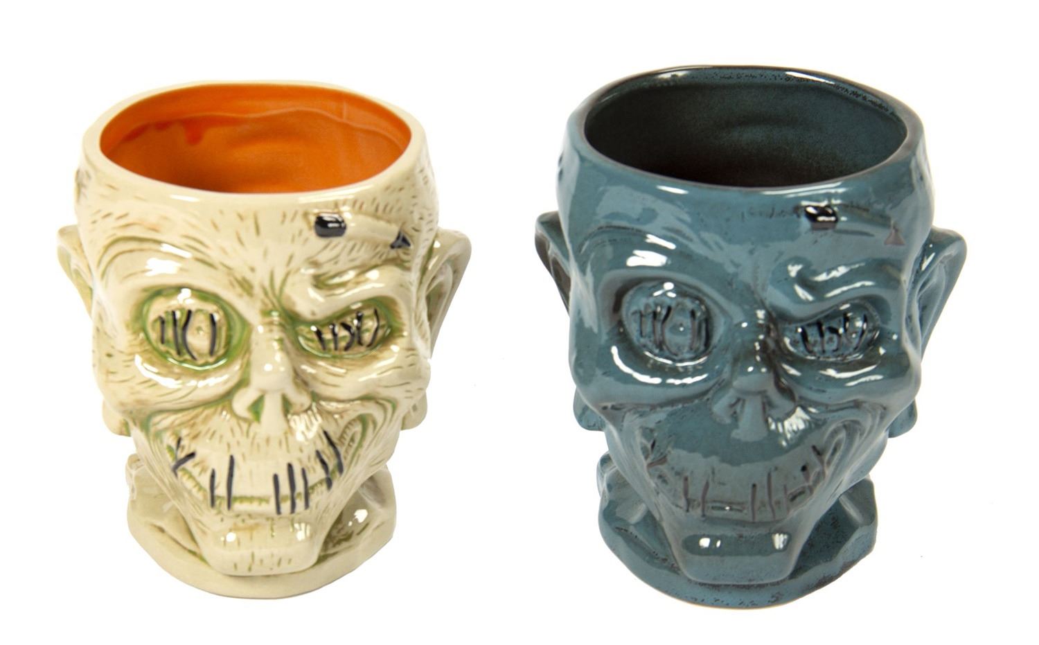 (Disneyland, 2011) A pair of ceramic tiki mugs from Trader Sam's Enchanted Tiki Bar at Disneyland. Used to serve the Zombie cocktail, the pair includes a cobalt blue mug marked “First Edition” on the bottom of the base and a gray and green mug similarly marked “Second Edition.” The macabre mugs each measure 4.75”x 5” and 4.25” deep and are in very fine condition being as-new.