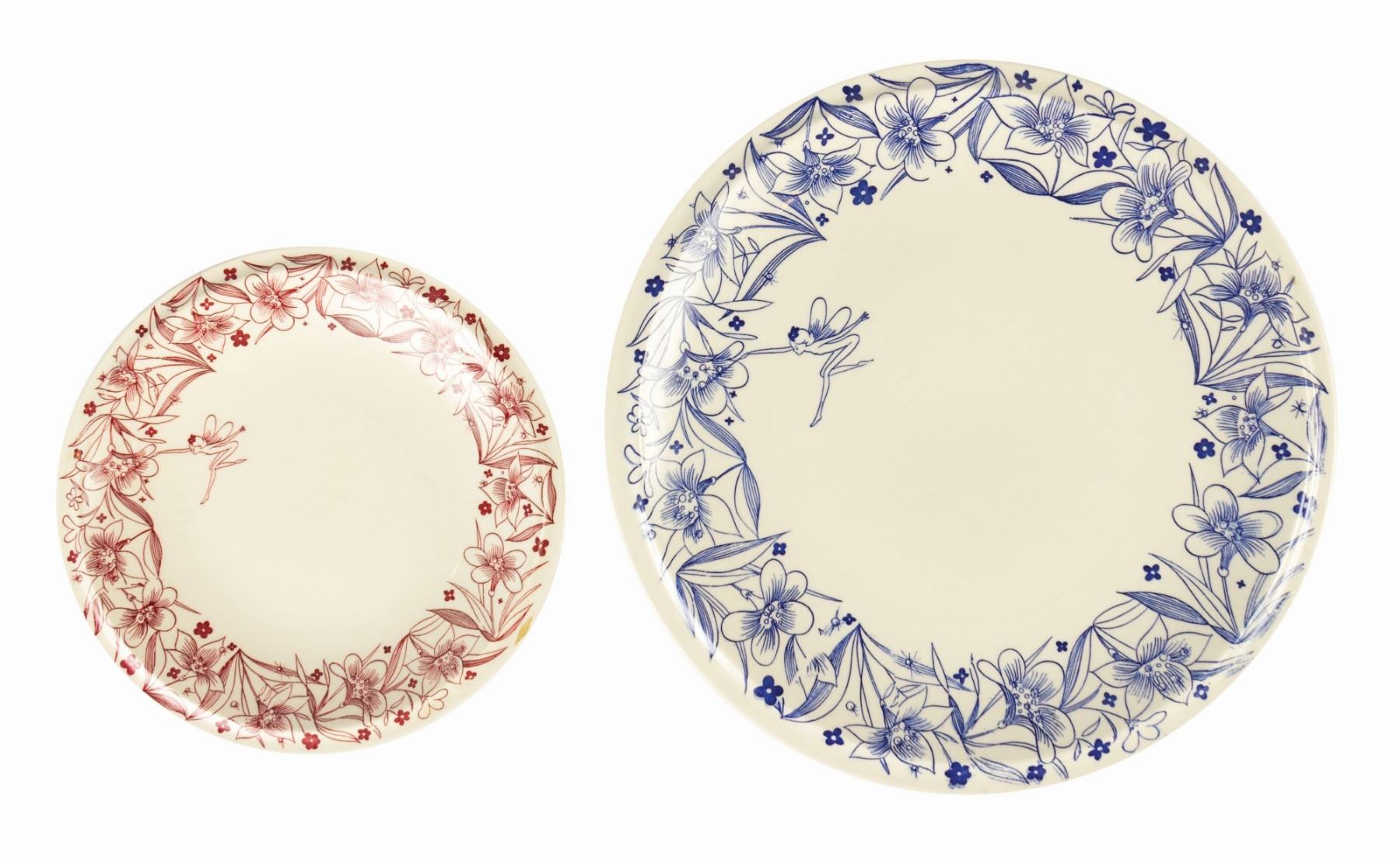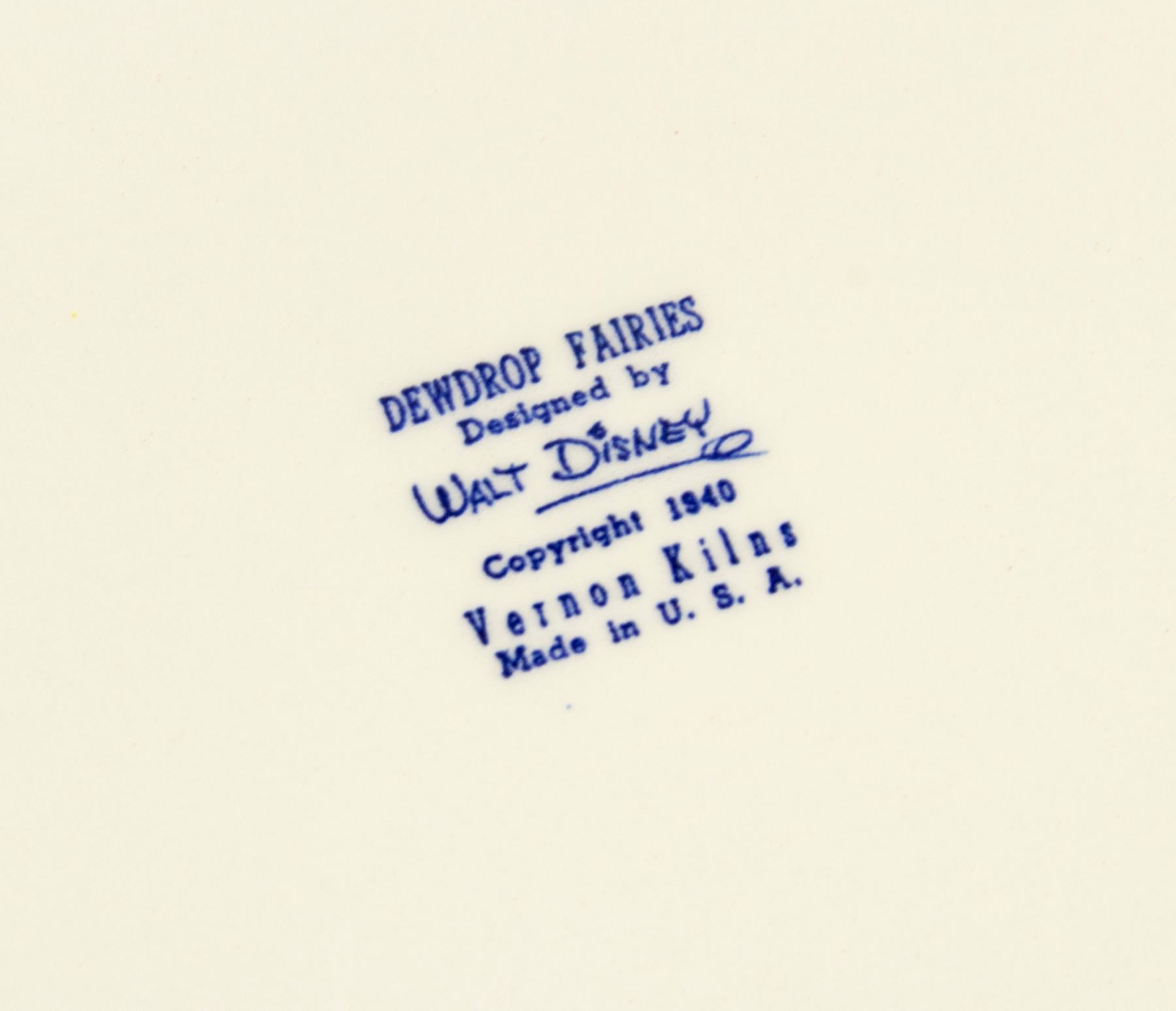 (Vernon Kilns, 1940) A pair of plates from Vernon Kilns' "Dewdrop Fairies" series based on artwork from Disney's "Fantasia" and painted by Disney artist Gyo Fujikawa. The plates measure 9.25" and 13.75" in diameter and are in very good to fine condition with a chip on the rim of the smaller plate.