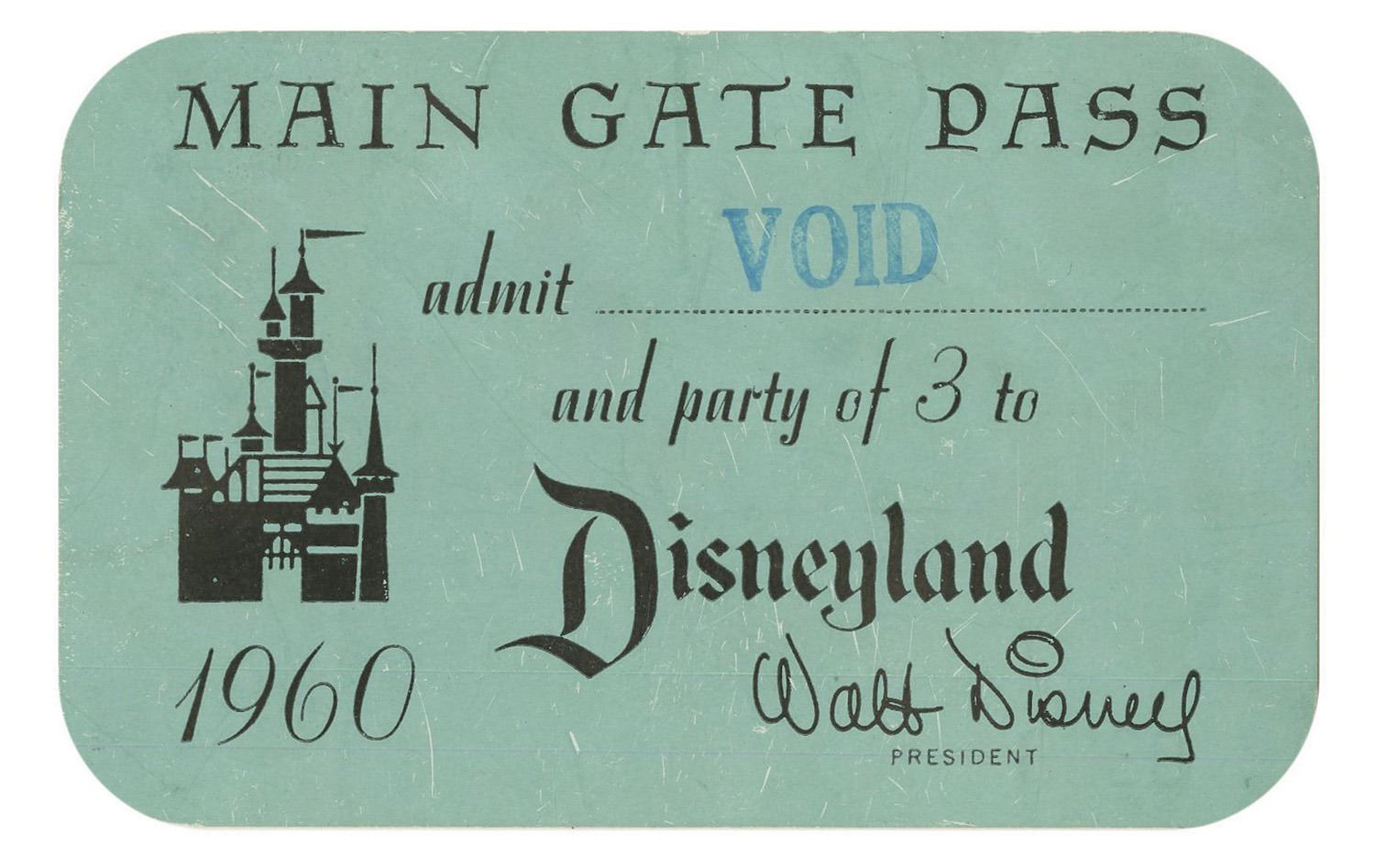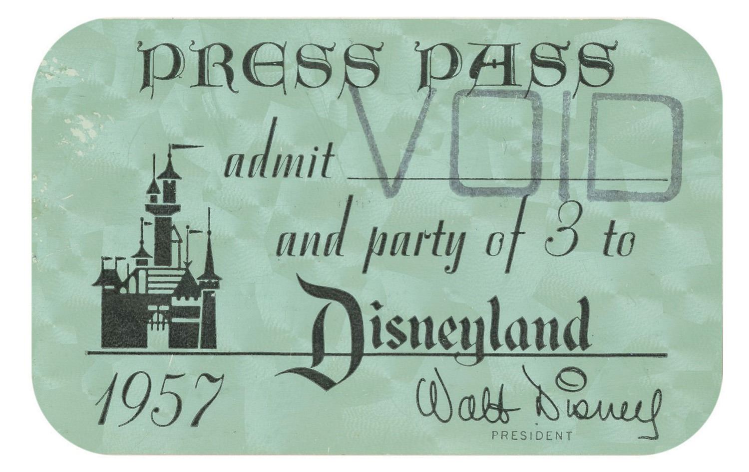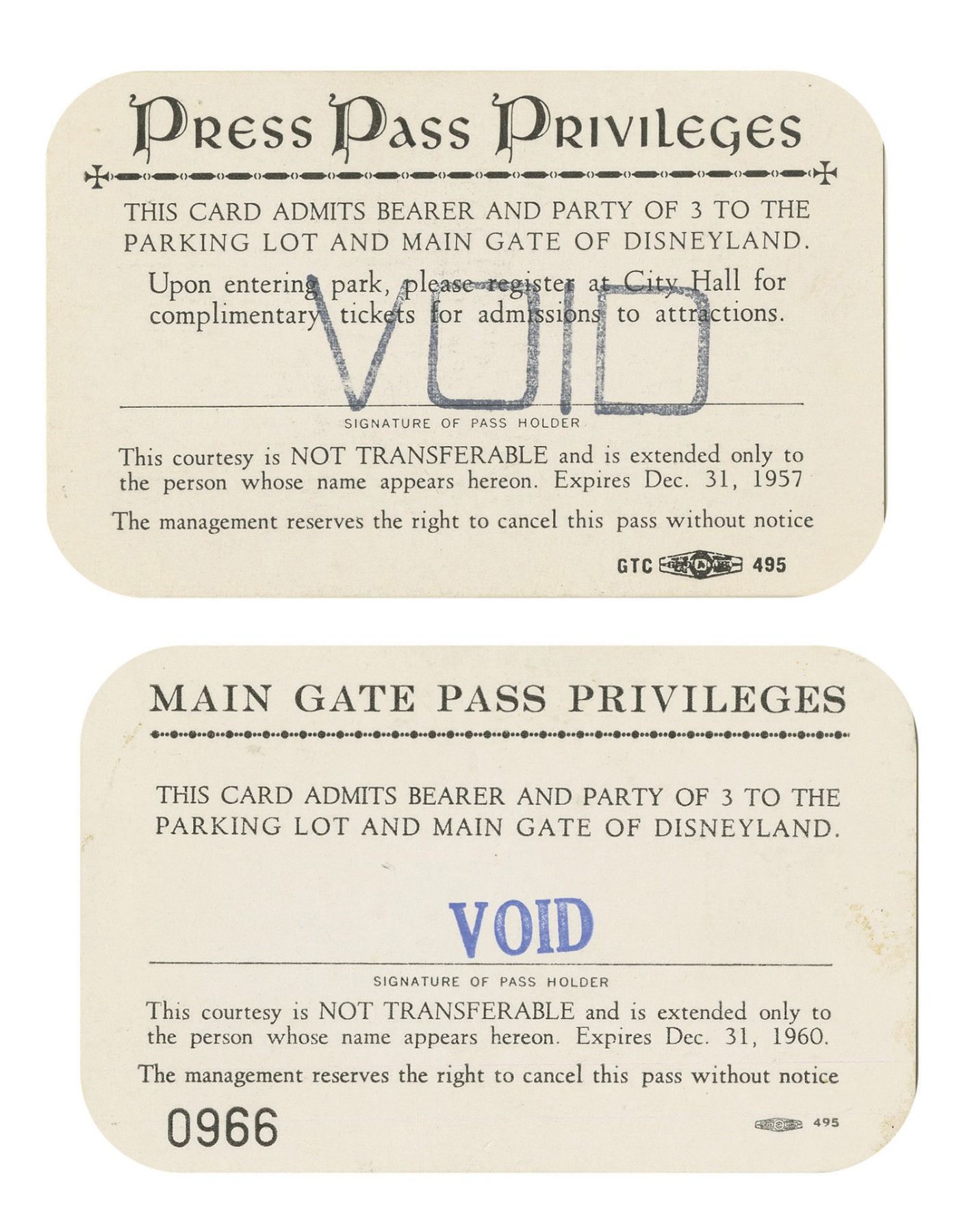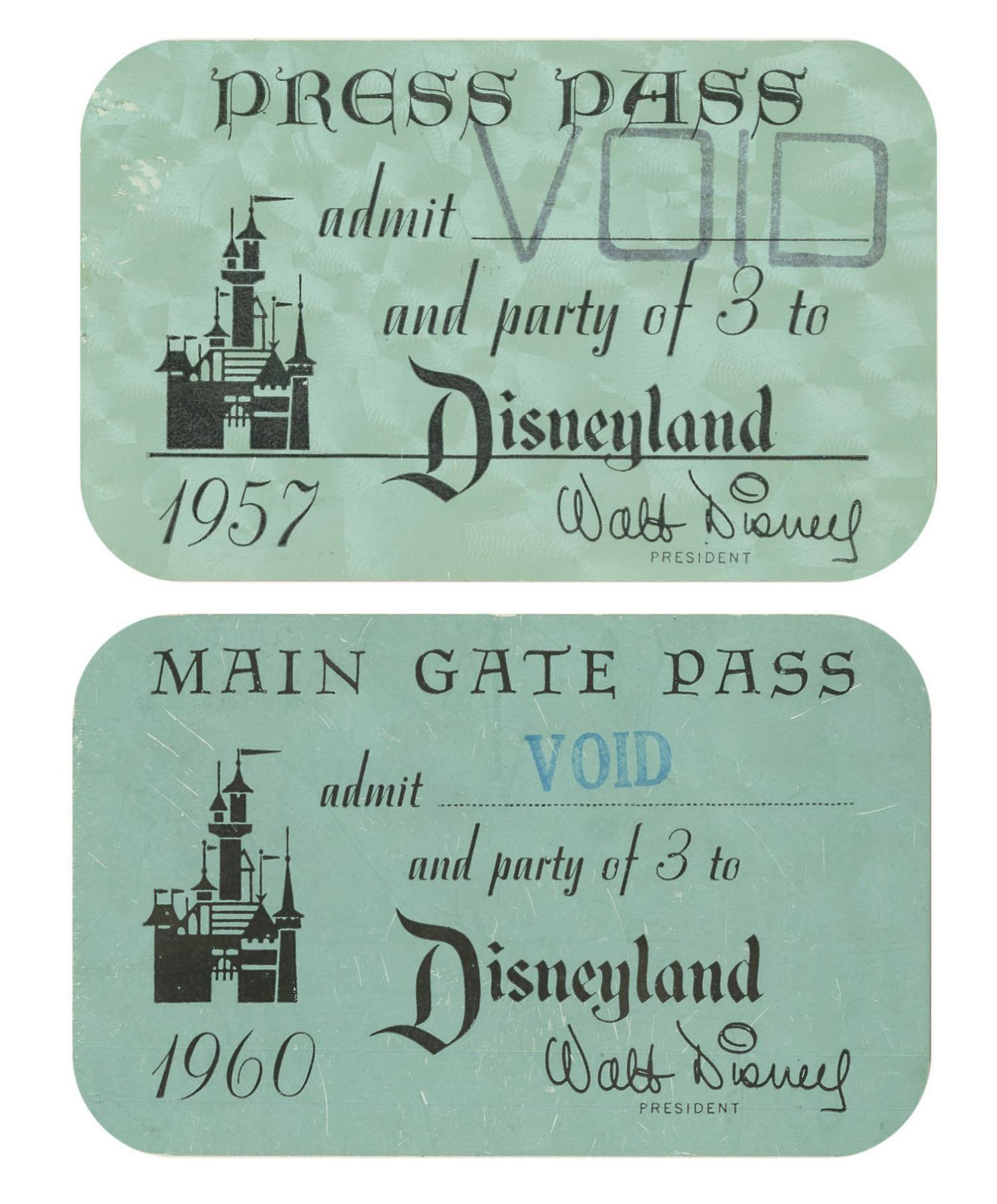 (Disneyland, 1957/60) A pair of specialty admission passes for Disneyland. The pair includes a Main Gate Pass and a Press Pass, both printed on unusual iridescent green paper. Both of these passes are believed to be samples, and the word "Void" is stamped on both in place of an admission name. Measuring 2.5"x3.75" each, the passes are in good condition with some edge-wear and surface scuffing.