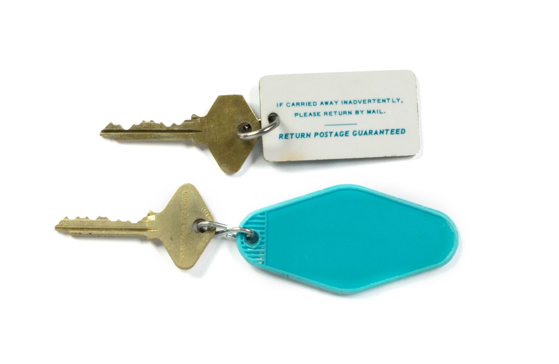(Disneyland, c.1960s-70s) A rare pair of original keys from the Disneyland Hotel. The attached fobs depict the older model of the "Disneyland Hotel" key fob, and the later model for the "Disneyland Hotel Towers" after the hotel's expansions in the 1960s-70s. The keys are numbered 1915 and 547, and were manufactured by Yale. The keys themselves measure approximately 2.5"x1.5" and are in good condition with some expected wear from use.