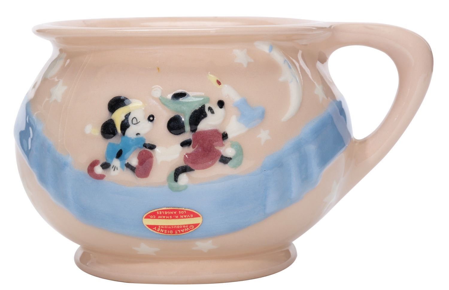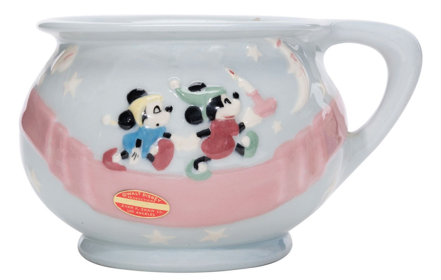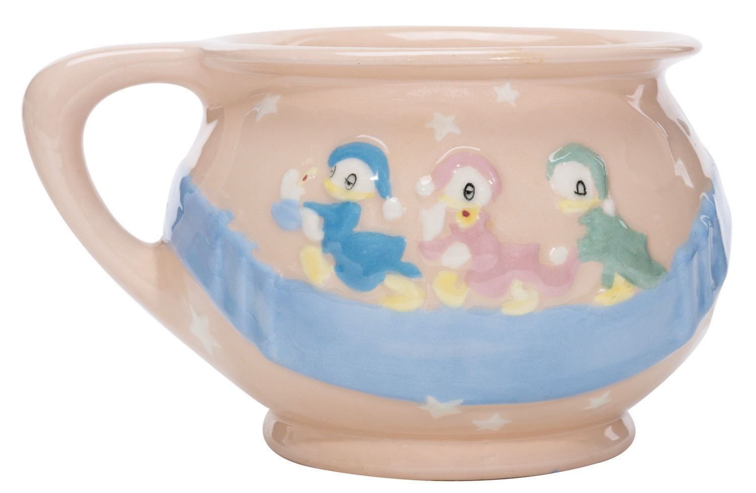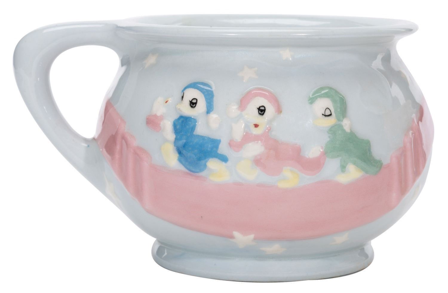 (Shaw Pottery, 1940s) A pair of very rare painted ceramic chamber pots used exclusively as gifts from Walt Disney to studio staff upon the birth of a newborn child. This lot features the two colors produced (pink and blue), each depicting Mickey's Nephews, Huey, Dewey, and Louie heading off to sleep. These chamber pots were manufactured by Evan K. Shaw Pottery, while a later version of these personal gifts was manufactured by Hagen-Renaker Pottery. Measuring 8.5"x5" tall, the pots are in very good condition despite minor spots of discoloration and soiling, and a few slight surface cracks and crazing to painted and glazed areas.