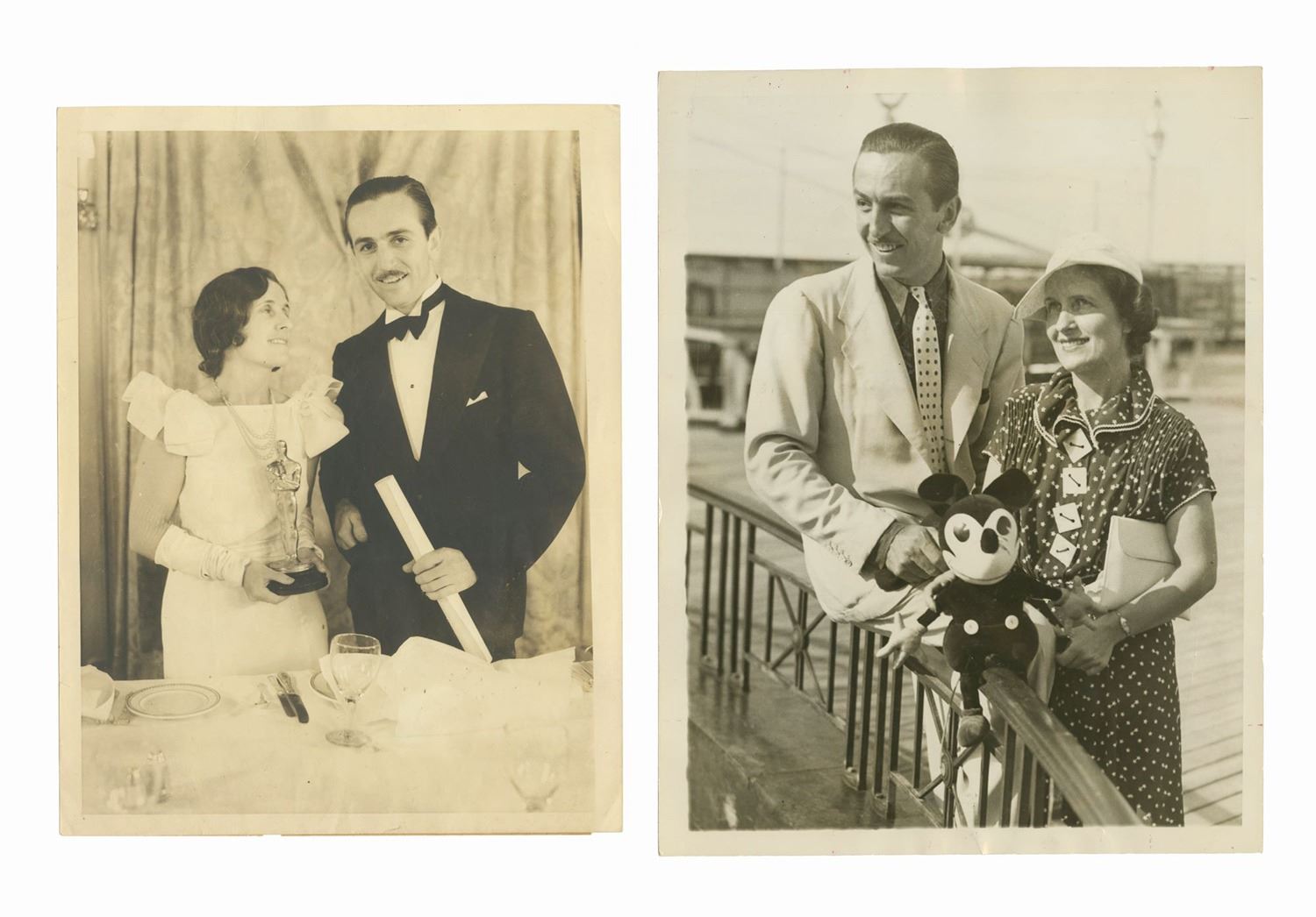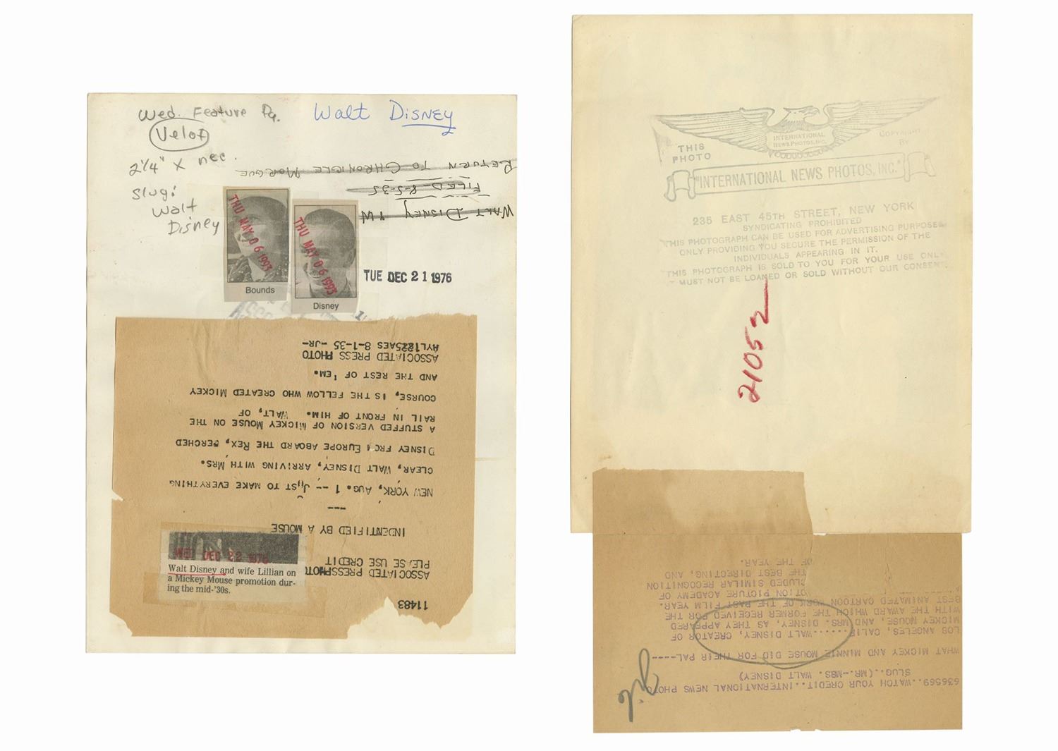 (Disney, c.1930s) An incredible pair of early press photographs of Walt and Lillian Disney. The first is a matte photo featuring the pair posing with Walt's Academy Award for Best Short Subject which he won in 1932, and the second is a glossy photo of Walt and Lillian posing with a Mickey Mouse doll while on a promotional tour. Both photographs include their original captions attached to the reverse, as well as notations and stamps used for filing purposes. The glossy photo has multiple stamped dates ranging from 1935 to the 1990s, indicating that this same photograph was used in print multiple times over several decades. Measuring 8.5"x6.5" and 9"x7", the photos are in good condition. The photographs have some edge-wear, as well as tearing to the caption on the reverse from age and use. There is a slight waviness to the glossy photo, as well as several scratches and creases throughout.