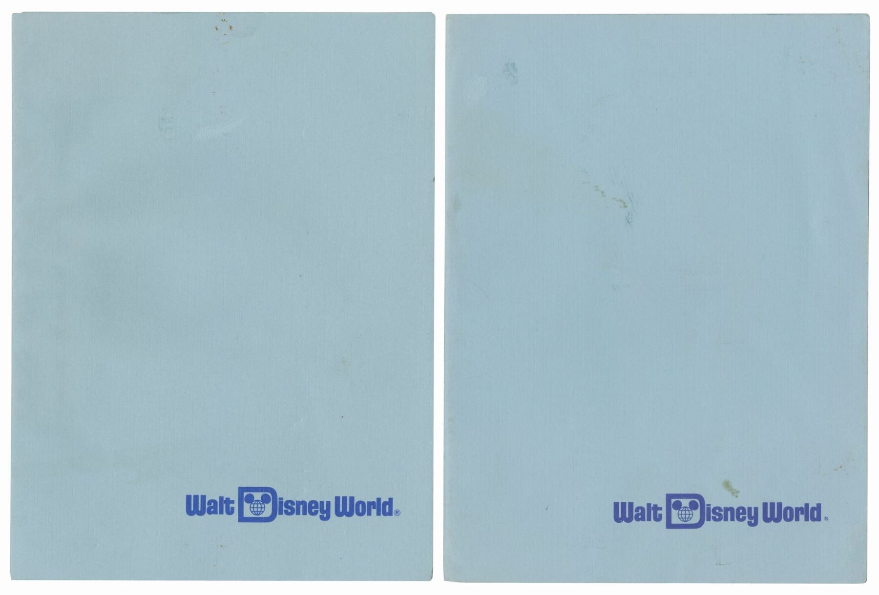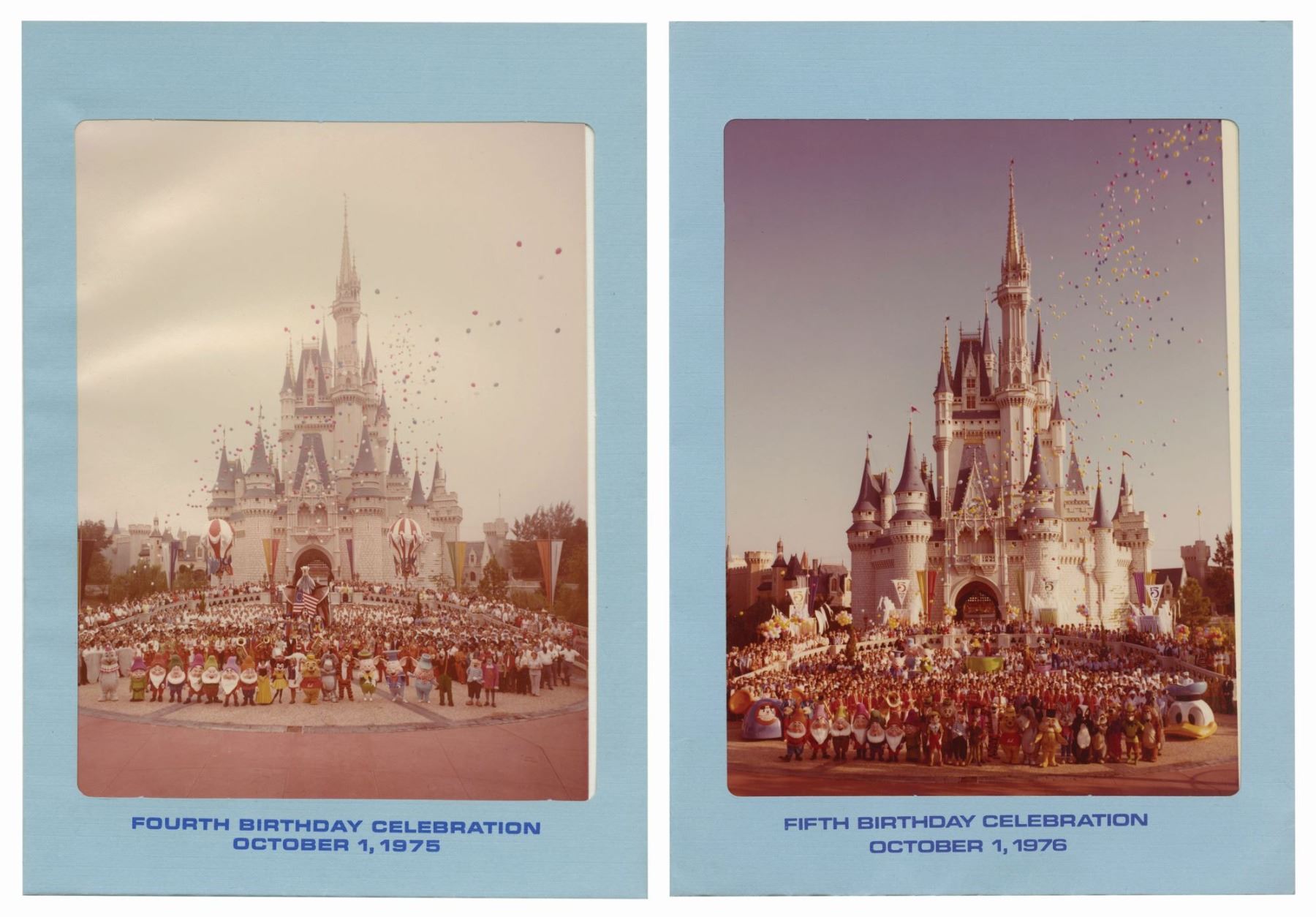 (Walt Disney World, 1975/76) A pair of birthday celebration photos from 1975 and 1976. These photos are displayed within commemorative Walt Disney World photo folders marking the fourth and fifth anniversaries of the park. Each photo folder measures 7.75"x5.75" and the photos measure 6"x4.5" each. The pair is in fair to good condition with some fading to the photos, as well as some discoloration and slight edge-wear to the photo folders.