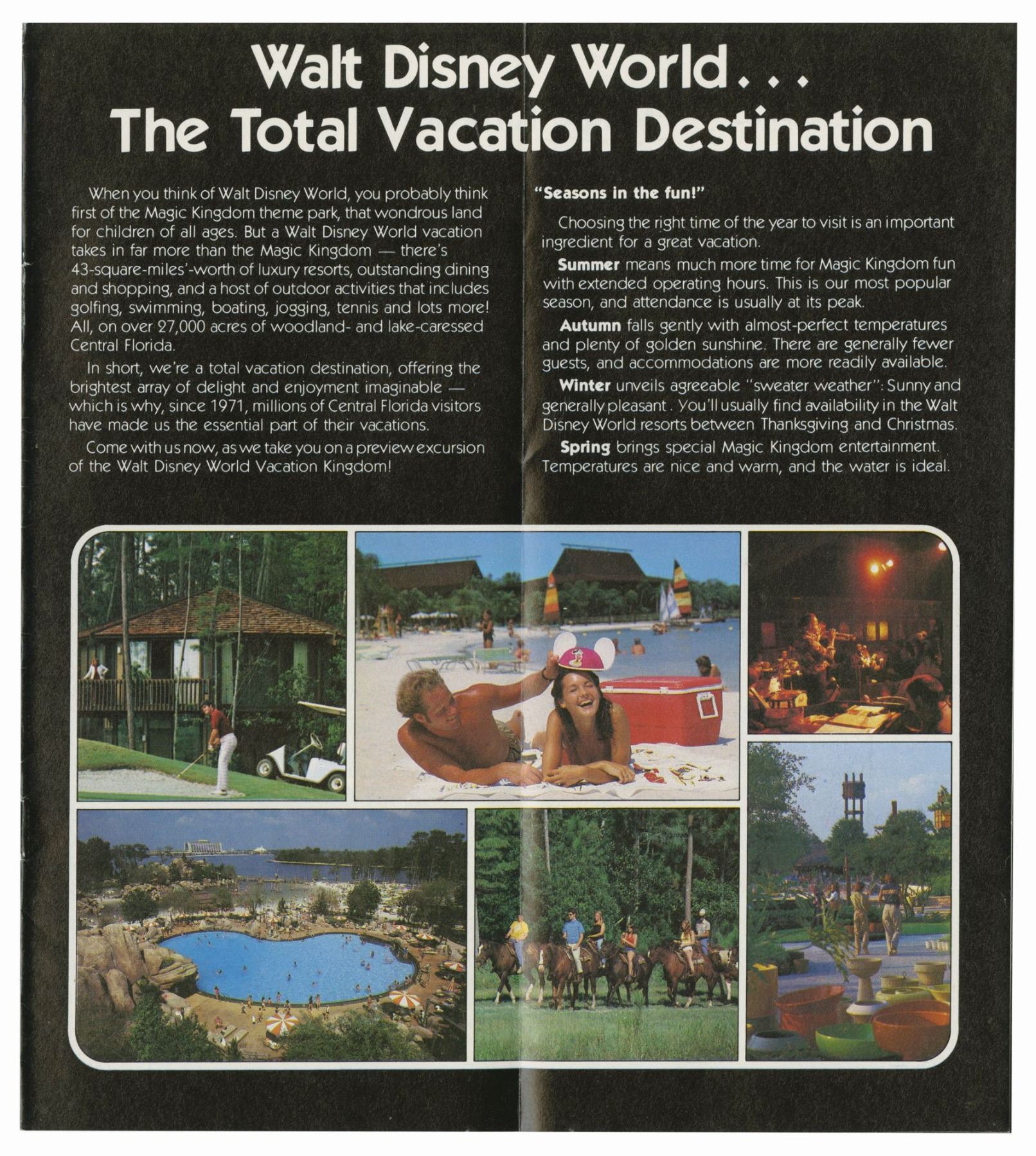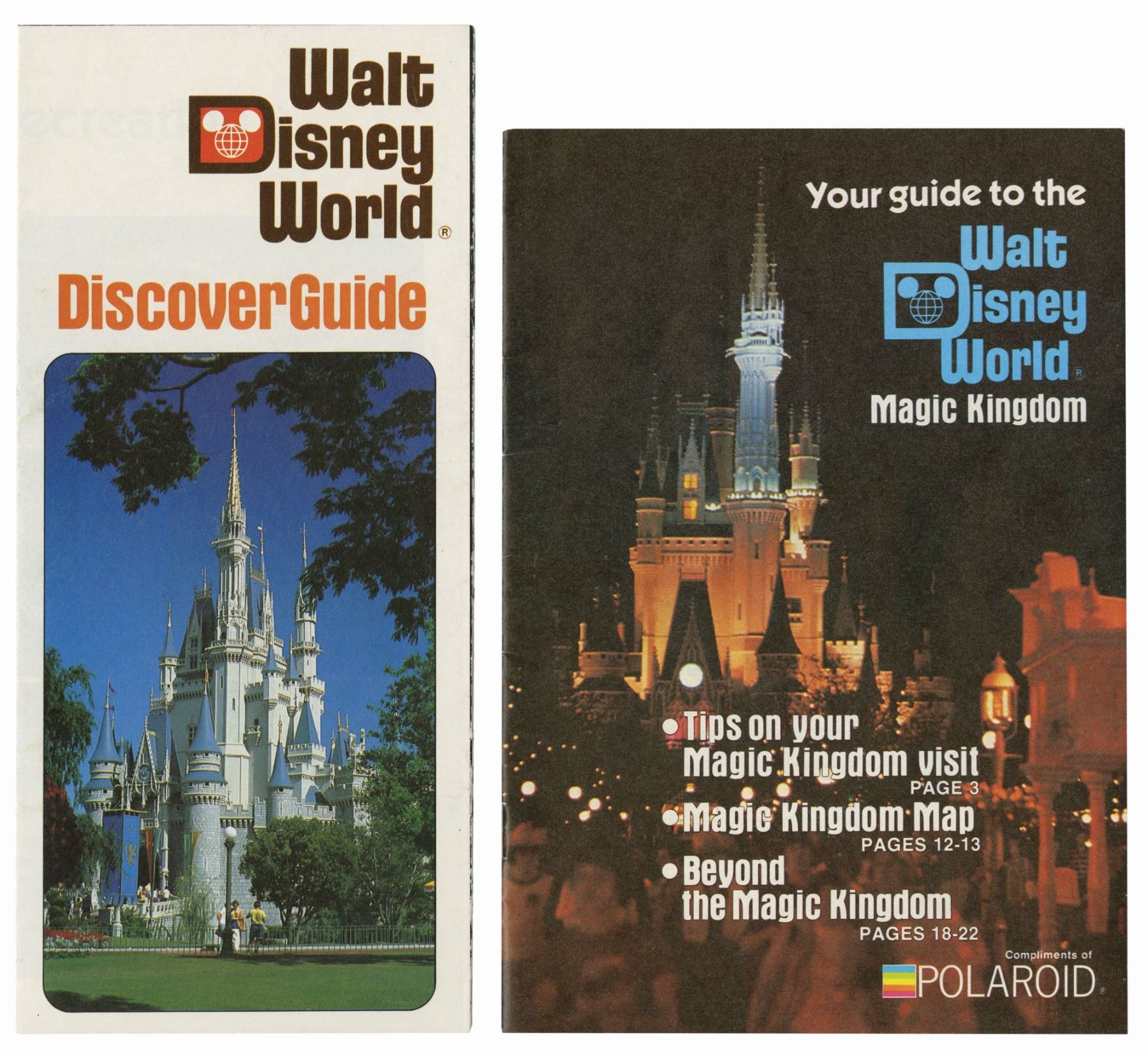 (Walt Disney World, 1980) A pair of Walt Disney World guides featuring wonderful imagery of Cinderella Castle. These brochures list the attractions, restaurants, entertainment, shopping, and more that can be found within the park. The brochures measure 8"x5.5" and 9"x4" respectively and are in very good condition with minor edge-wear.
