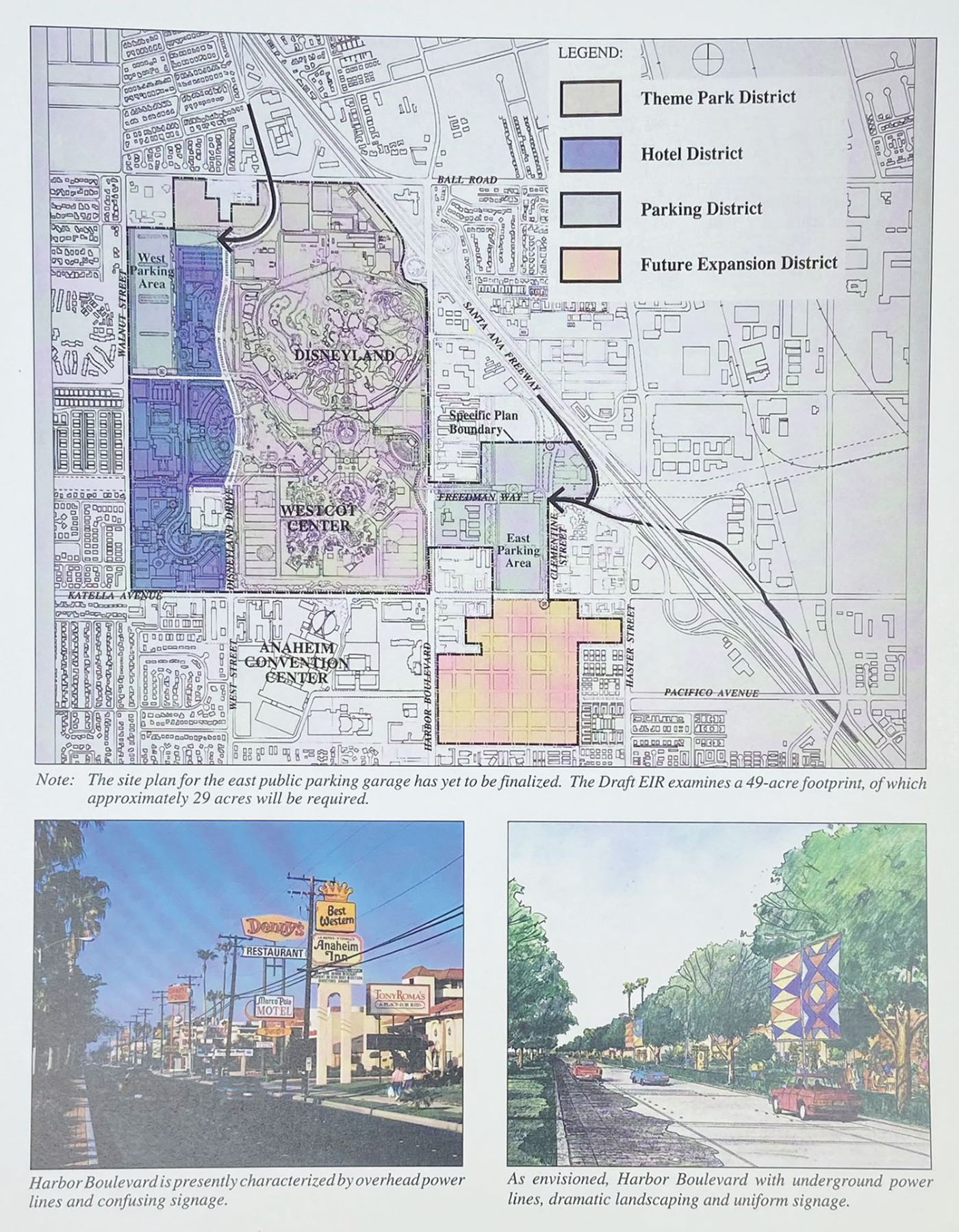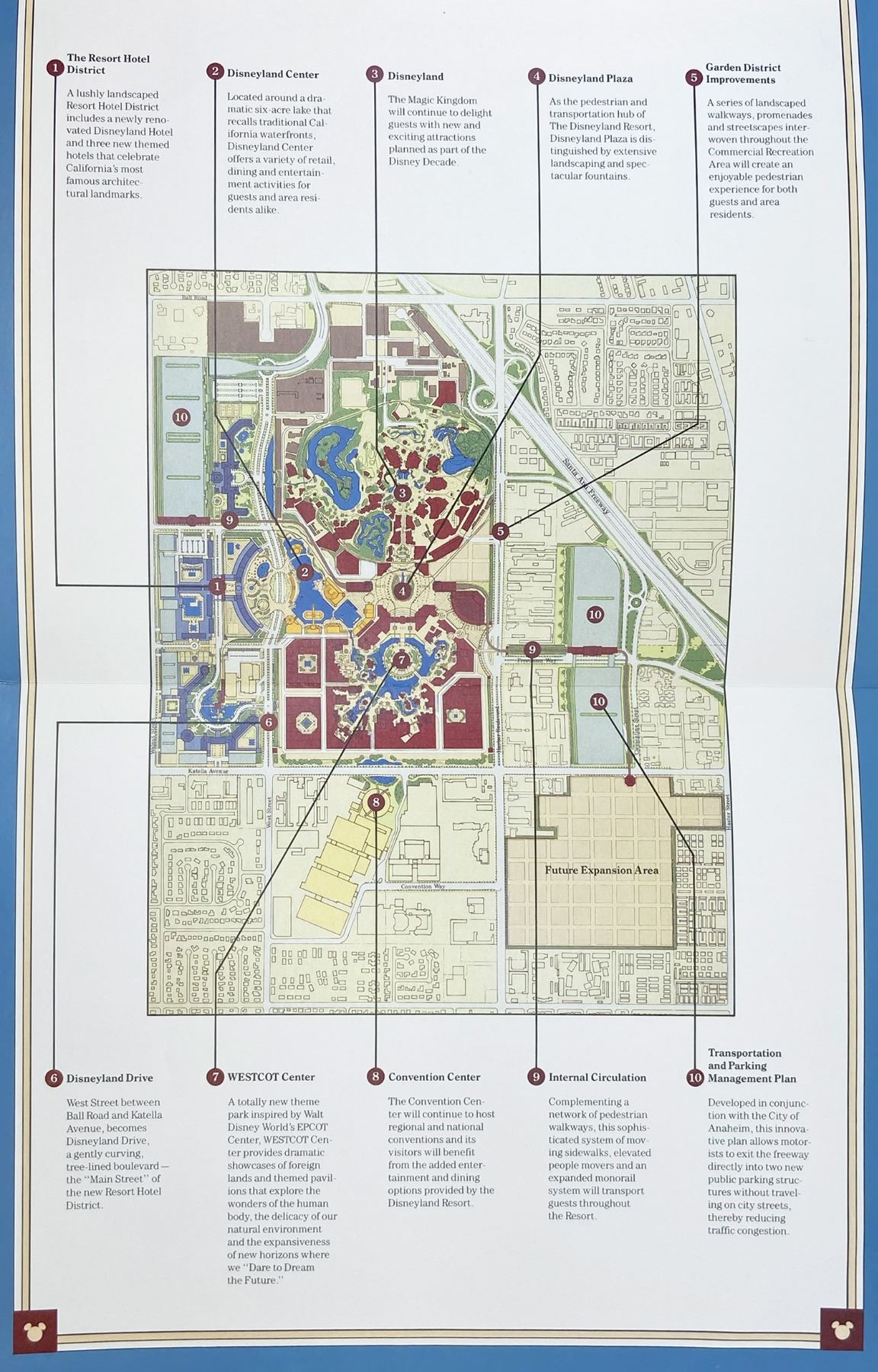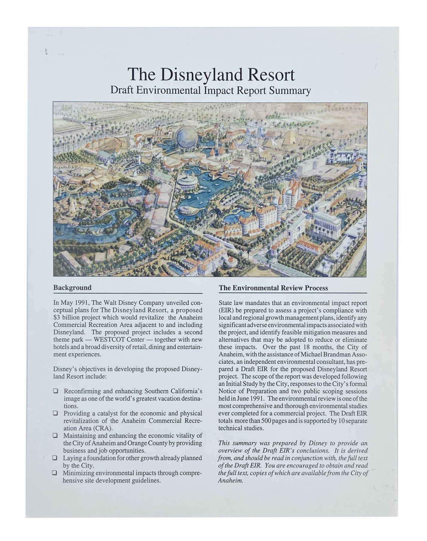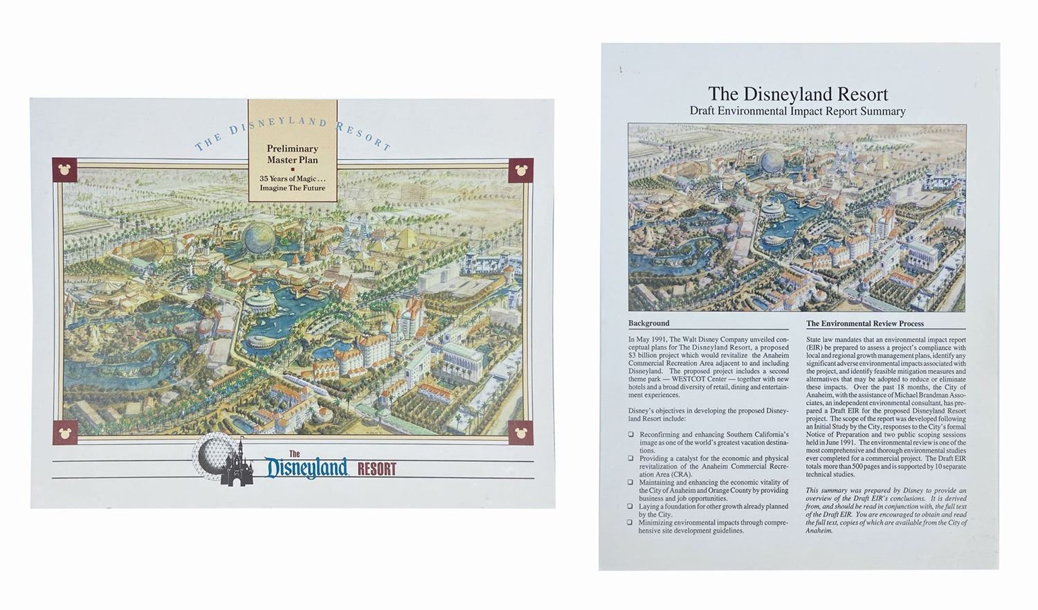 (Disneyland, 1990) A pair of promotional fold-outs distributed by Disneyland to explain their plans for expansion of the resort and how it would impact the surrounding area. The preliminary plan for what would become California Adventure, was to develop an EPCOT-style resort near Disneyland. The environmental impact report details how the new resort will impact the environment and nearby communities. Both fold-outs measure 11â€x8.5†folded, and are in very good condition with minor wear from use.